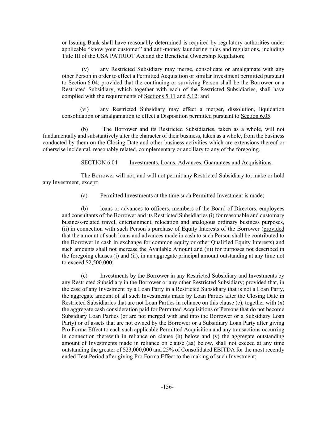 -156- or Issuing Bank shall have reasonably determined is required by regulatory authorities under applicable “know your customer” and anti-money laundering rules and regulations, including Title III of the USA PATRIOT Act and the Beneficial Ownership Regulation; (v) any Restricted Subsidiary may merge, consolidate or amalgamate with any other Person in order to effect a Permitted Acquisition or similar Investment permitted pursuant to Section 6.04; provided that the continuing or surviving Person shall be the Borrower or a Restricted Subsidiary, which together with each of the Restricted Subsidiaries, shall have complied with the requirements of Sections 5.11 and 5.12; and (vi) any Restricted Subsidiary may effect a merger, dissolution, liquidation consolidation or amalgamation to effect a Disposition permitted pursuant to Section 6.05. (b) The Borrower and its Restricted Subsidiaries, taken as a whole, will not fundamentally and substantively alter the character of their business, taken as a whole, from the business conducted by them on the Closing Date and other business activities which are extensions thereof or otherwise incidental, reasonably related, complementary or ancillary to any of the foregoing. SECTION 6.04 Investments, Loans, Advances, Guarantees and Acquisitions. The Borrower will not, and will not permit any Restricted Subsidiary to, make or hold any Investment, except: (a) Permitted Investments at the time such Permitted Investment is made; (b) loans or advances to officers, members of the Board of Directors, employees and consultants of the Borrower and its Restricted Subsidiaries (i) for reasonable and customary business-related travel, entertainment, relocation and analogous ordinary business purposes, (ii) in connection with such Person’s purchase of Equity Interests of the Borrower (provided that the amount of such loans and advances made in cash to such Person shall be contributed to the Borrower in cash in exchange for common equity or other Qualified Equity Interests) and such amounts shall not increase the Available Amount and (iii) for purposes not described in the foregoing clauses (i) and (ii), in an aggregate principal amount outstanding at any time not to exceed $2,500,000; (c) Investments by the Borrower in any Restricted Subsidiary and Investments by any Restricted Subsidiary in the Borrower or any other Restricted Subsidiary; provided that, in the case of any Investment by a Loan Party in a Restricted Subsidiary that is not a Loan Party, the aggregate amount of all such Investments made by Loan Parties after the Closing Date in Restricted Subsidiaries that are not Loan Parties in reliance on this clause (c), together with (x) the aggregate cash consideration paid for Permitted Acquisitions of Persons that do not become Subsidiary Loan Parties (or are not merged with and into the Borrower or a Subsidiary Loan Party) or of assets that are not owned by the Borrower or a Subsidiary Loan Party after giving Pro Forma Effect to each such applicable Permitted Acquisition and any transactions occurring in connection therewith in reliance on clause (h) below and (y) the aggregate outstanding amount of Investments made in reliance on clause (aa) below, shall not exceed at any time outstanding the greater of $23,000,000 and 25% of Consolidated EBITDA for the most recently ended Test Period after giving Pro Forma Effect to the making of such Investment;