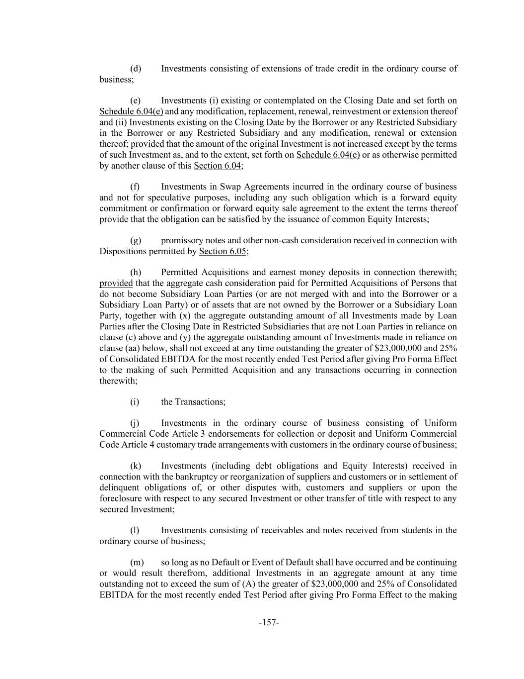 -157- (d) Investments consisting of extensions of trade credit in the ordinary course of business; (e) Investments (i) existing or contemplated on the Closing Date and set forth on Schedule 6.04(e) and any modification, replacement, renewal, reinvestment or extension thereof and (ii) Investments existing on the Closing Date by the Borrower or any Restricted Subsidiary in the Borrower or any Restricted Subsidiary and any modification, renewal or extension thereof; provided that the amount of the original Investment is not increased except by the terms of such Investment as, and to the extent, set forth on Schedule 6.04(e) or as otherwise permitted by another clause of this Section 6.04; (f) Investments in Swap Agreements incurred in the ordinary course of business and not for speculative purposes, including any such obligation which is a forward equity commitment or confirmation or forward equity sale agreement to the extent the terms thereof provide that the obligation can be satisfied by the issuance of common Equity Interests; (g) promissory notes and other non-cash consideration received in connection with Dispositions permitted by Section 6.05; (h) Permitted Acquisitions and earnest money deposits in connection therewith; provided that the aggregate cash consideration paid for Permitted Acquisitions of Persons that do not become Subsidiary Loan Parties (or are not merged with and into the Borrower or a Subsidiary Loan Party) or of assets that are not owned by the Borrower or a Subsidiary Loan Party, together with (x) the aggregate outstanding amount of all Investments made by Loan Parties after the Closing Date in Restricted Subsidiaries that are not Loan Parties in reliance on clause (c) above and (y) the aggregate outstanding amount of Investments made in reliance on clause (aa) below, shall not exceed at any time outstanding the greater of $23,000,000 and 25% of Consolidated EBITDA for the most recently ended Test Period after giving Pro Forma Effect to the making of such Permitted Acquisition and any transactions occurring in connection therewith; (i) the Transactions; (j) Investments in the ordinary course of business consisting of Uniform Commercial Code Article 3 endorsements for collection or deposit and Uniform Commercial Code Article 4 customary trade arrangements with customers in the ordinary course of business; (k) Investments (including debt obligations and Equity Interests) received in connection with the bankruptcy or reorganization of suppliers and customers or in settlement of delinquent obligations of, or other disputes with, customers and suppliers or upon the foreclosure with respect to any secured Investment or other transfer of title with respect to any secured Investment; (l) Investments consisting of receivables and notes received from students in the ordinary course of business; (m) so long as no Default or Event of Default shall have occurred and be continuing or would result therefrom, additional Investments in an aggregate amount at any time outstanding not to exceed the sum of (A) the greater of $23,000,000 and 25% of Consolidated EBITDA for the most recently ended Test Period after giving Pro Forma Effect to the making
