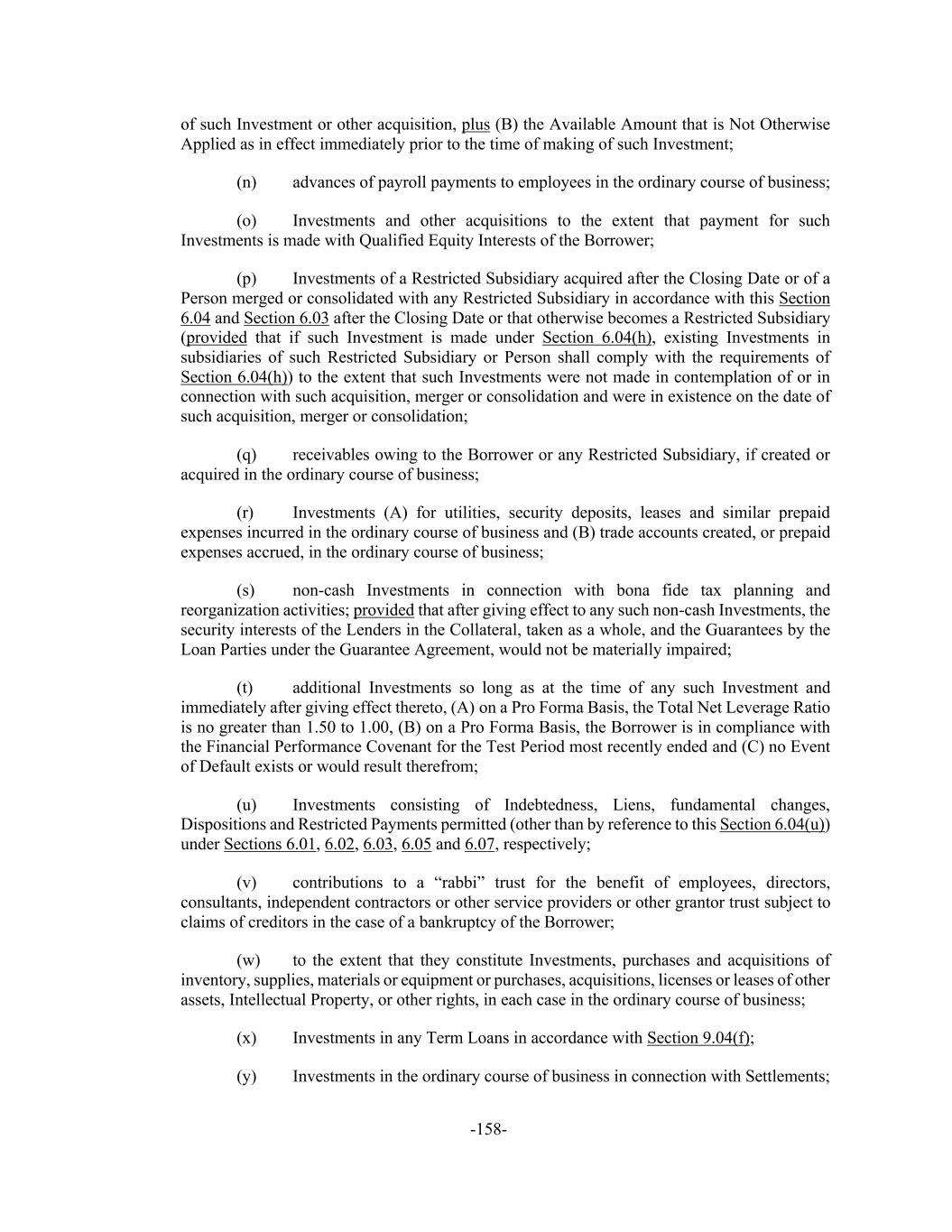 -158- of such Investment or other acquisition, plus (B) the Available Amount that is Not Otherwise Applied as in effect immediately prior to the time of making of such Investment; (n) advances of payroll payments to employees in the ordinary course of business; (o) Investments and other acquisitions to the extent that payment for such Investments is made with Qualified Equity Interests of the Borrower; (p) Investments of a Restricted Subsidiary acquired after the Closing Date or of a Person merged or consolidated with any Restricted Subsidiary in accordance with this Section 6.04 and Section 6.03 after the Closing Date or that otherwise becomes a Restricted Subsidiary (provided that if such Investment is made under Section 6.04(h), existing Investments in subsidiaries of such Restricted Subsidiary or Person shall comply with the requirements of Section 6.04(h)) to the extent that such Investments were not made in contemplation of or in connection with such acquisition, merger or consolidation and were in existence on the date of such acquisition, merger or consolidation; (q) receivables owing to the Borrower or any Restricted Subsidiary, if created or acquired in the ordinary course of business; (r) Investments (A) for utilities, security deposits, leases and similar prepaid expenses incurred in the ordinary course of business and (B) trade accounts created, or prepaid expenses accrued, in the ordinary course of business; (s) non-cash Investments in connection with bona fide tax planning and reorganization activities; provided that after giving effect to any such non-cash Investments, the security interests of the Lenders in the Collateral, taken as a whole, and the Guarantees by the Loan Parties under the Guarantee Agreement, would not be materially impaired; (t) additional Investments so long as at the time of any such Investment and immediately after giving effect thereto, (A) on a Pro Forma Basis, the Total Net Leverage Ratio is no greater than 1.50 to 1.00, (B) on a Pro Forma Basis, the Borrower is in compliance with the Financial Performance Covenant for the Test Period most recently ended and (C) no Event of Default exists or would result therefrom; (u) Investments consisting of Indebtedness, Liens, fundamental changes, Dispositions and Restricted Payments permitted (other than by reference to this Section 6.04(u)) under Sections 6.01, 6.02, 6.03, 6.05 and 6.07, respectively; (v) contributions to a “rabbi” trust for the benefit of employees, directors, consultants, independent contractors or other service providers or other grantor trust subject to claims of creditors in the case of a bankruptcy of the Borrower; (w) to the extent that they constitute Investments, purchases and acquisitions of inventory, supplies, materials or equipment or purchases, acquisitions, licenses or leases of other assets, Intellectual Property, or other rights, in each case in the ordinary course of business; (x) Investments in any Term Loans in accordance with Section 9.04(f); (y) Investments in the ordinary course of business in connection with Settlements;