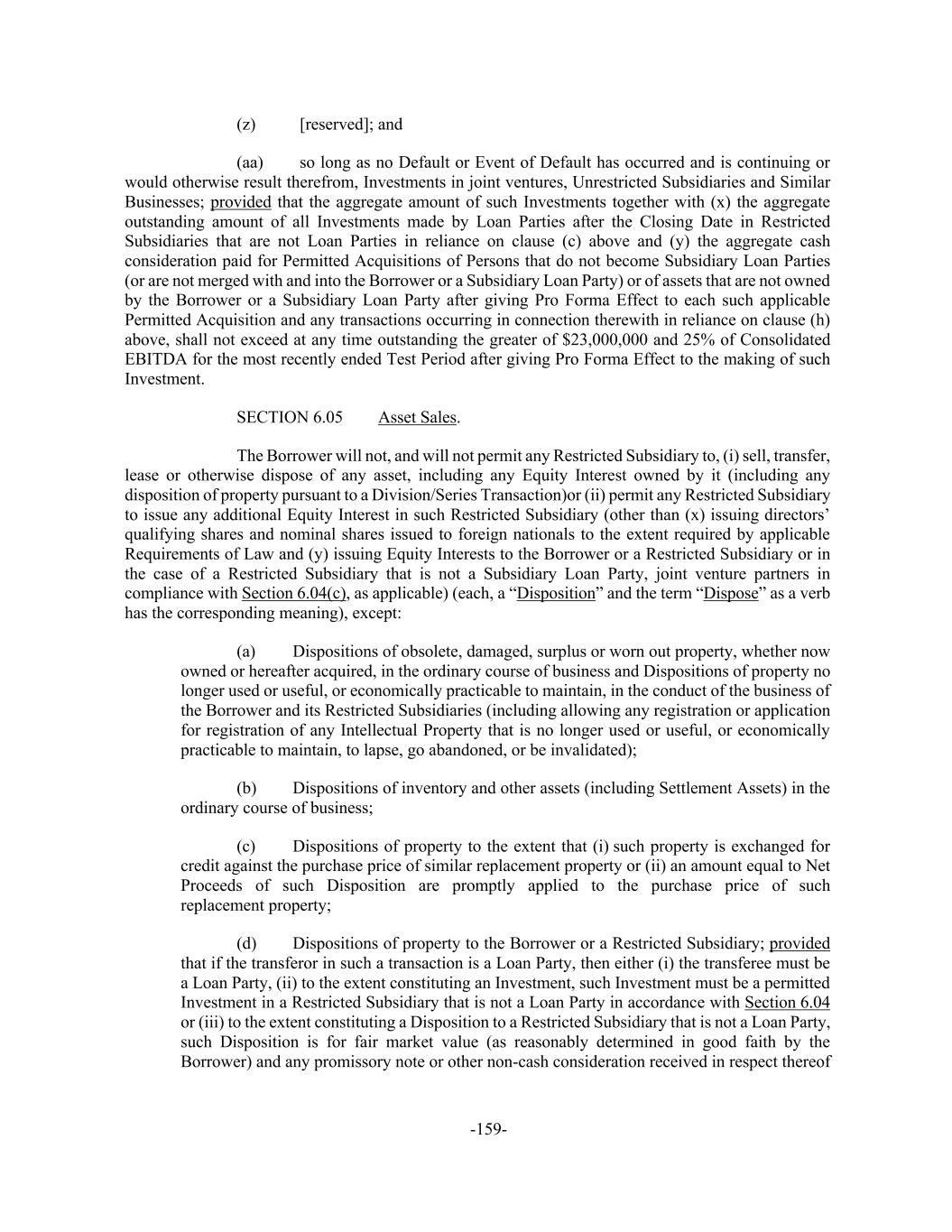 -159- (z) [reserved]; and (aa) so long as no Default or Event of Default has occurred and is continuing or would otherwise result therefrom, Investments in joint ventures, Unrestricted Subsidiaries and Similar Businesses; provided that the aggregate amount of such Investments together with (x) the aggregate outstanding amount of all Investments made by Loan Parties after the Closing Date in Restricted Subsidiaries that are not Loan Parties in reliance on clause (c) above and (y) the aggregate cash consideration paid for Permitted Acquisitions of Persons that do not become Subsidiary Loan Parties (or are not merged with and into the Borrower or a Subsidiary Loan Party) or of assets that are not owned by the Borrower or a Subsidiary Loan Party after giving Pro Forma Effect to each such applicable Permitted Acquisition and any transactions occurring in connection therewith in reliance on clause (h) above, shall not exceed at any time outstanding the greater of $23,000,000 and 25% of Consolidated EBITDA for the most recently ended Test Period after giving Pro Forma Effect to the making of such Investment. SECTION 6.05 Asset Sales. The Borrower will not, and will not permit any Restricted Subsidiary to, (i) sell, transfer, lease or otherwise dispose of any asset, including any Equity Interest owned by it (including any disposition of property pursuant to a Division/Series Transaction)or (ii) permit any Restricted Subsidiary to issue any additional Equity Interest in such Restricted Subsidiary (other than (x) issuing directors’ qualifying shares and nominal shares issued to foreign nationals to the extent required by applicable Requirements of Law and (y) issuing Equity Interests to the Borrower or a Restricted Subsidiary or in the case of a Restricted Subsidiary that is not a Subsidiary Loan Party, joint venture partners in compliance with Section 6.04(c), as applicable) (each, a “Disposition” and the term “Dispose” as a verb has the corresponding meaning), except: (a) Dispositions of obsolete, damaged, surplus or worn out property, whether now owned or hereafter acquired, in the ordinary course of business and Dispositions of property no longer used or useful, or economically practicable to maintain, in the conduct of the business of the Borrower and its Restricted Subsidiaries (including allowing any registration or application for registration of any Intellectual Property that is no longer used or useful, or economically practicable to maintain, to lapse, go abandoned, or be invalidated); (b) Dispositions of inventory and other assets (including Settlement Assets) in the ordinary course of business; (c) Dispositions of property to the extent that (i) such property is exchanged for credit against the purchase price of similar replacement property or (ii) an amount equal to Net Proceeds of such Disposition are promptly applied to the purchase price of such replacement property; (d) Dispositions of property to the Borrower or a Restricted Subsidiary; provided that if the transferor in such a transaction is a Loan Party, then either (i) the transferee must be a Loan Party, (ii) to the extent constituting an Investment, such Investment must be a permitted Investment in a Restricted Subsidiary that is not a Loan Party in accordance with Section 6.04 or (iii) to the extent constituting a Disposition to a Restricted Subsidiary that is not a Loan Party, such Disposition is for fair market value (as reasonably determined in good faith by the Borrower) and any promissory note or other non-cash consideration received in respect thereof