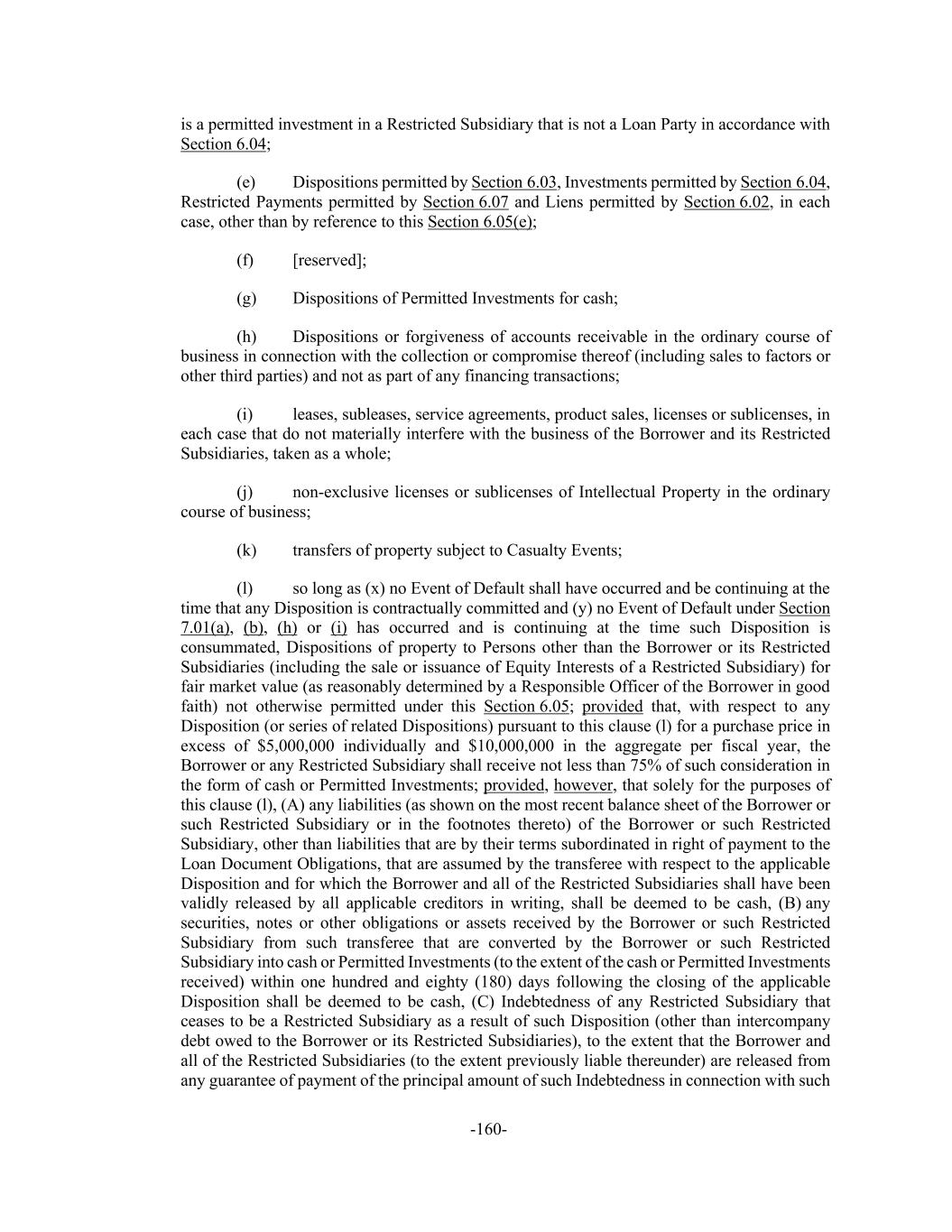 -160- is a permitted investment in a Restricted Subsidiary that is not a Loan Party in accordance with Section 6.04; (e) Dispositions permitted by Section 6.03, Investments permitted by Section 6.04, Restricted Payments permitted by Section 6.07 and Liens permitted by Section 6.02, in each case, other than by reference to this Section 6.05(e); (f) [reserved]; (g) Dispositions of Permitted Investments for cash; (h) Dispositions or forgiveness of accounts receivable in the ordinary course of business in connection with the collection or compromise thereof (including sales to factors or other third parties) and not as part of any financing transactions; (i) leases, subleases, service agreements, product sales, licenses or sublicenses, in each case that do not materially interfere with the business of the Borrower and its Restricted Subsidiaries, taken as a whole; (j) non-exclusive licenses or sublicenses of Intellectual Property in the ordinary course of business; (k) transfers of property subject to Casualty Events; (l) so long as (x) no Event of Default shall have occurred and be continuing at the time that any Disposition is contractually committed and (y) no Event of Default under Section 7.01(a), (b), (h) or (i) has occurred and is continuing at the time such Disposition is consummated, Dispositions of property to Persons other than the Borrower or its Restricted Subsidiaries (including the sale or issuance of Equity Interests of a Restricted Subsidiary) for fair market value (as reasonably determined by a Responsible Officer of the Borrower in good faith) not otherwise permitted under this Section 6.05; provided that, with respect to any Disposition (or series of related Dispositions) pursuant to this clause (l) for a purchase price in excess of $5,000,000 individually and $10,000,000 in the aggregate per fiscal year, the Borrower or any Restricted Subsidiary shall receive not less than 75% of such consideration in the form of cash or Permitted Investments; provided, however, that solely for the purposes of this clause (l), (A) any liabilities (as shown on the most recent balance sheet of the Borrower or such Restricted Subsidiary or in the footnotes thereto) of the Borrower or such Restricted Subsidiary, other than liabilities that are by their terms subordinated in right of payment to the Loan Document Obligations, that are assumed by the transferee with respect to the applicable Disposition and for which the Borrower and all of the Restricted Subsidiaries shall have been validly released by all applicable creditors in writing, shall be deemed to be cash, (B) any securities, notes or other obligations or assets received by the Borrower or such Restricted Subsidiary from such transferee that are converted by the Borrower or such Restricted Subsidiary into cash or Permitted Investments (to the extent of the cash or Permitted Investments received) within one hundred and eighty (180) days following the closing of the applicable Disposition shall be deemed to be cash, (C) Indebtedness of any Restricted Subsidiary that ceases to be a Restricted Subsidiary as a result of such Disposition (other than intercompany debt owed to the Borrower or its Restricted Subsidiaries), to the extent that the Borrower and all of the Restricted Subsidiaries (to the extent previously liable thereunder) are released from any guarantee of payment of the principal amount of such Indebtedness in connection with such