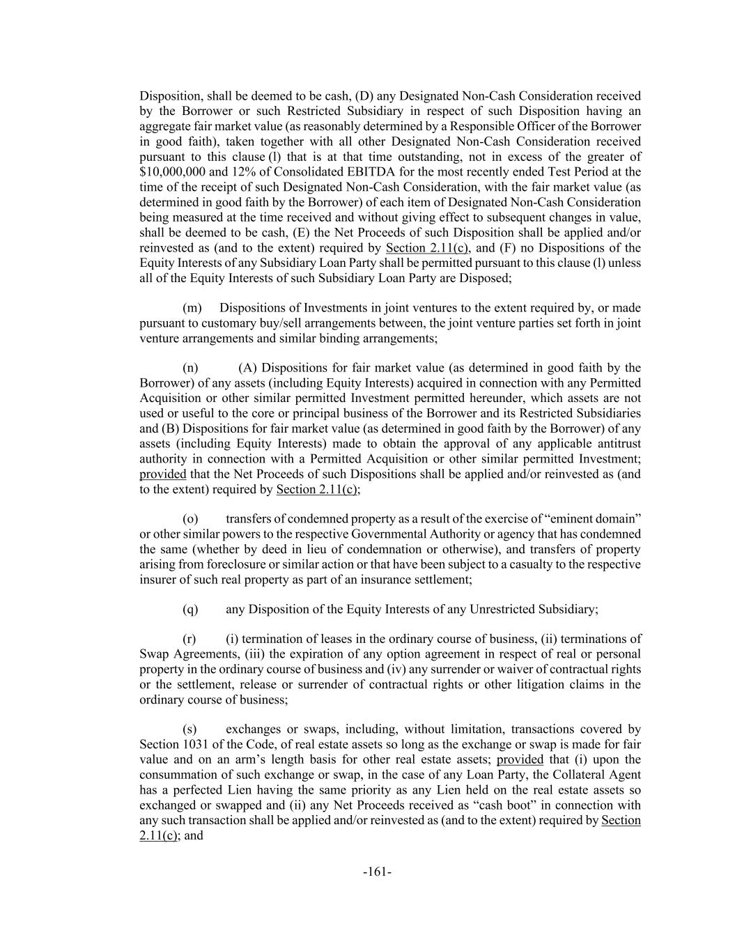 -161- Disposition, shall be deemed to be cash, (D) any Designated Non-Cash Consideration received by the Borrower or such Restricted Subsidiary in respect of such Disposition having an aggregate fair market value (as reasonably determined by a Responsible Officer of the Borrower in good faith), taken together with all other Designated Non-Cash Consideration received pursuant to this clause (l) that is at that time outstanding, not in excess of the greater of $10,000,000 and 12% of Consolidated EBITDA for the most recently ended Test Period at the time of the receipt of such Designated Non-Cash Consideration, with the fair market value (as determined in good faith by the Borrower) of each item of Designated Non-Cash Consideration being measured at the time received and without giving effect to subsequent changes in value, shall be deemed to be cash, (E) the Net Proceeds of such Disposition shall be applied and/or reinvested as (and to the extent) required by Section 2.11(c), and (F) no Dispositions of the Equity Interests of any Subsidiary Loan Party shall be permitted pursuant to this clause (l) unless all of the Equity Interests of such Subsidiary Loan Party are Disposed; (m) Dispositions of Investments in joint ventures to the extent required by, or made pursuant to customary buy/sell arrangements between, the joint venture parties set forth in joint venture arrangements and similar binding arrangements; (n) (A) Dispositions for fair market value (as determined in good faith by the Borrower) of any assets (including Equity Interests) acquired in connection with any Permitted Acquisition or other similar permitted Investment permitted hereunder, which assets are not used or useful to the core or principal business of the Borrower and its Restricted Subsidiaries and (B) Dispositions for fair market value (as determined in good faith by the Borrower) of any assets (including Equity Interests) made to obtain the approval of any applicable antitrust authority in connection with a Permitted Acquisition or other similar permitted Investment; provided that the Net Proceeds of such Dispositions shall be applied and/or reinvested as (and to the extent) required by Section 2.11(c); (o) transfers of condemned property as a result of the exercise of “eminent domain” or other similar powers to the respective Governmental Authority or agency that has condemned the same (whether by deed in lieu of condemnation or otherwise), and transfers of property arising from foreclosure or similar action or that have been subject to a casualty to the respective insurer of such real property as part of an insurance settlement; (q) any Disposition of the Equity Interests of any Unrestricted Subsidiary; (r) (i) termination of leases in the ordinary course of business, (ii) terminations of Swap Agreements, (iii) the expiration of any option agreement in respect of real or personal property in the ordinary course of business and (iv) any surrender or waiver of contractual rights or the settlement, release or surrender of contractual rights or other litigation claims in the ordinary course of business; (s) exchanges or swaps, including, without limitation, transactions covered by Section 1031 of the Code, of real estate assets so long as the exchange or swap is made for fair value and on an arm’s length basis for other real estate assets; provided that (i) upon the consummation of such exchange or swap, in the case of any Loan Party, the Collateral Agent has a perfected Lien having the same priority as any Lien held on the real estate assets so exchanged or swapped and (ii) any Net Proceeds received as “cash boot” in connection with any such transaction shall be applied and/or reinvested as (and to the extent) required by Section 2.11(c); and