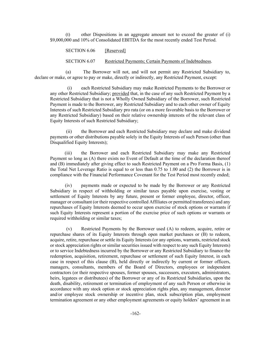 -162- (t) other Dispositions in an aggregate amount not to exceed the greater of (i) $9,000,000 and 10% of Consolidated EBITDA for the most recently ended Test Period. SECTION 6.06 [Reserved] SECTION 6.07 Restricted Payments; Certain Payments of Indebtedness. (a) The Borrower will not, and will not permit any Restricted Subsidiary to, declare or make, or agree to pay or make, directly or indirectly, any Restricted Payment, except: (i) each Restricted Subsidiary may make Restricted Payments to the Borrower or any other Restricted Subsidiary; provided that, in the case of any such Restricted Payment by a Restricted Subsidiary that is not a Wholly Owned Subsidiary of the Borrower, such Restricted Payment is made to the Borrower, any Restricted Subsidiary and to each other owner of Equity Interests of such Restricted Subsidiary pro rata (or on a more favorable basis to the Borrower or any Restricted Subsidiary) based on their relative ownership interests of the relevant class of Equity Interests of such Restricted Subsidiary; (ii) the Borrower and each Restricted Subsidiary may declare and make dividend payments or other distributions payable solely in the Equity Interests of such Person (other than Disqualified Equity Interests); (iii) the Borrower and each Restricted Subsidiary may make any Restricted Payment so long as (A) there exists no Event of Default at the time of the declaration thereof and (B) immediately after giving effect to such Restricted Payment on a Pro Forma Basis, (1) the Total Net Leverage Ratio is equal to or less than 0.75 to 1.00 and (2) the Borrower is in compliance with the Financial Performance Covenant for the Test Period most recently ended; (iv) payments made or expected to be made by the Borrower or any Restricted Subsidiary in respect of withholding or similar taxes payable upon exercise, vesting or settlement of Equity Interests by any future, present or former employee, director, officer, manager or consultant (or their respective controlled Affiliates or permitted transferees) and any repurchases of Equity Interests deemed to occur upon exercise of stock options or warrants if such Equity Interests represent a portion of the exercise price of such options or warrants or required withholding or similar taxes; (v) Restricted Payments by the Borrower used (A) to redeem, acquire, retire or repurchase shares of its Equity Interests through open market purchases or (B) to redeem, acquire, retire, repurchase or settle its Equity Interests (or any options, warrants, restricted stock or stock appreciation rights or similar securities issued with respect to any such Equity Interests) or to service Indebtedness incurred by the Borrower or any Restricted Subsidiary to finance the redemption, acquisition, retirement, repurchase or settlement of such Equity Interest, in each case in respect of this clause (B), held directly or indirectly by current or former officers, managers, consultants, members of the Board of Directors, employees or independent contractors (or their respective spouses, former spouses, successors, executors, administrators, heirs, legatees or distributees) of the Borrower or any of its Restricted Subsidiaries, upon the death, disability, retirement or termination of employment of any such Person or otherwise in accordance with any stock option or stock appreciation rights plan, any management, director and/or employee stock ownership or incentive plan, stock subscription plan, employment termination agreement or any other employment agreements or equity holders’ agreement in an