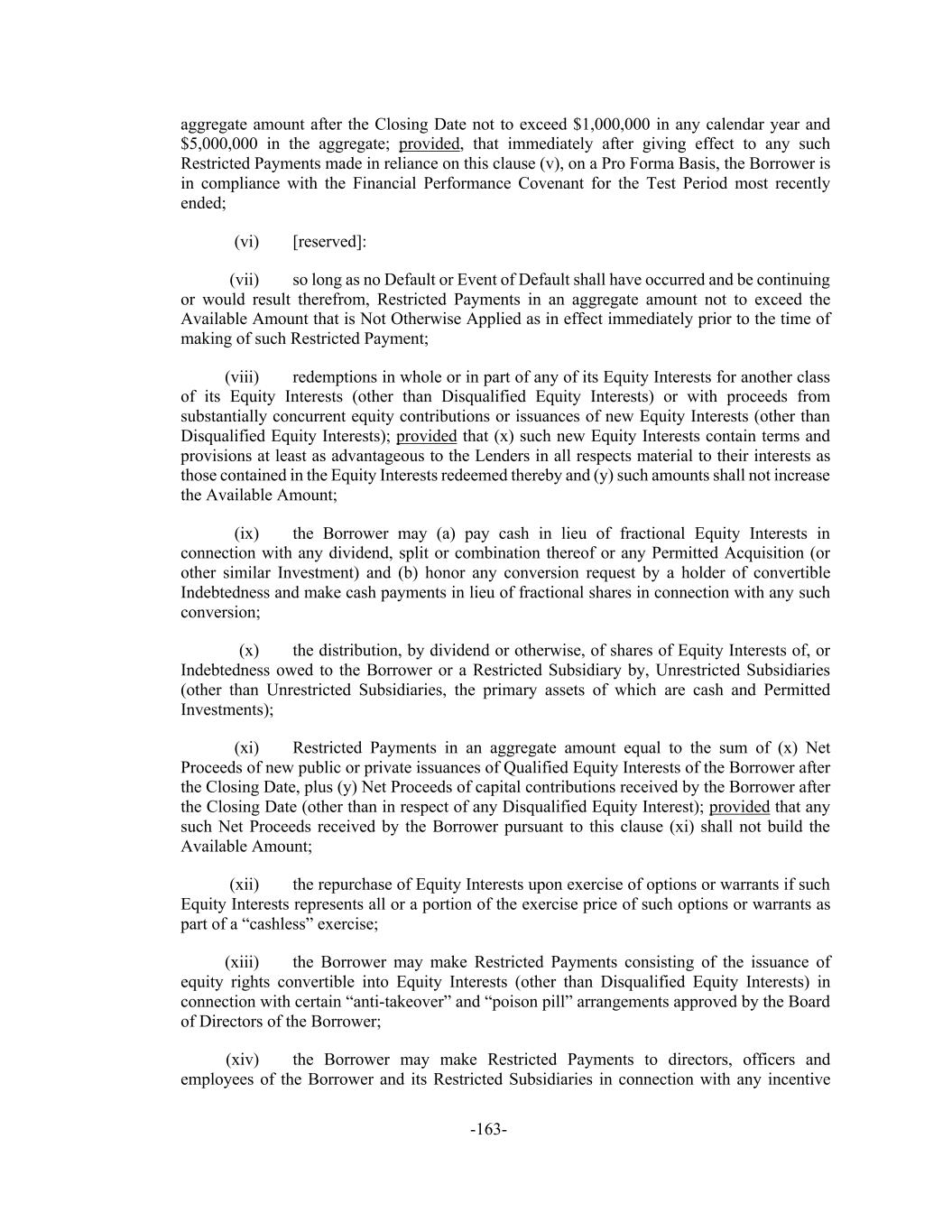 -163- aggregate amount after the Closing Date not to exceed $1,000,000 in any calendar year and $5,000,000 in the aggregate; provided, that immediately after giving effect to any such Restricted Payments made in reliance on this clause (v), on a Pro Forma Basis, the Borrower is in compliance with the Financial Performance Covenant for the Test Period most recently ended; (vi) [reserved]: (vii) so long as no Default or Event of Default shall have occurred and be continuing or would result therefrom, Restricted Payments in an aggregate amount not to exceed the Available Amount that is Not Otherwise Applied as in effect immediately prior to the time of making of such Restricted Payment; (viii) redemptions in whole or in part of any of its Equity Interests for another class of its Equity Interests (other than Disqualified Equity Interests) or with proceeds from substantially concurrent equity contributions or issuances of new Equity Interests (other than Disqualified Equity Interests); provided that (x) such new Equity Interests contain terms and provisions at least as advantageous to the Lenders in all respects material to their interests as those contained in the Equity Interests redeemed thereby and (y) such amounts shall not increase the Available Amount; (ix) the Borrower may (a) pay cash in lieu of fractional Equity Interests in connection with any dividend, split or combination thereof or any Permitted Acquisition (or other similar Investment) and (b) honor any conversion request by a holder of convertible Indebtedness and make cash payments in lieu of fractional shares in connection with any such conversion; (x) the distribution, by dividend or otherwise, of shares of Equity Interests of, or Indebtedness owed to the Borrower or a Restricted Subsidiary by, Unrestricted Subsidiaries (other than Unrestricted Subsidiaries, the primary assets of which are cash and Permitted Investments); (xi) Restricted Payments in an aggregate amount equal to the sum of (x) Net Proceeds of new public or private issuances of Qualified Equity Interests of the Borrower after the Closing Date, plus (y) Net Proceeds of capital contributions received by the Borrower after the Closing Date (other than in respect of any Disqualified Equity Interest); provided that any such Net Proceeds received by the Borrower pursuant to this clause (xi) shall not build the Available Amount; (xii) the repurchase of Equity Interests upon exercise of options or warrants if such Equity Interests represents all or a portion of the exercise price of such options or warrants as part of a “cashless” exercise; (xiii) the Borrower may make Restricted Payments consisting of the issuance of equity rights convertible into Equity Interests (other than Disqualified Equity Interests) in connection with certain “anti-takeover” and “poison pill” arrangements approved by the Board of Directors of the Borrower; (xiv) the Borrower may make Restricted Payments to directors, officers and employees of the Borrower and its Restricted Subsidiaries in connection with any incentive