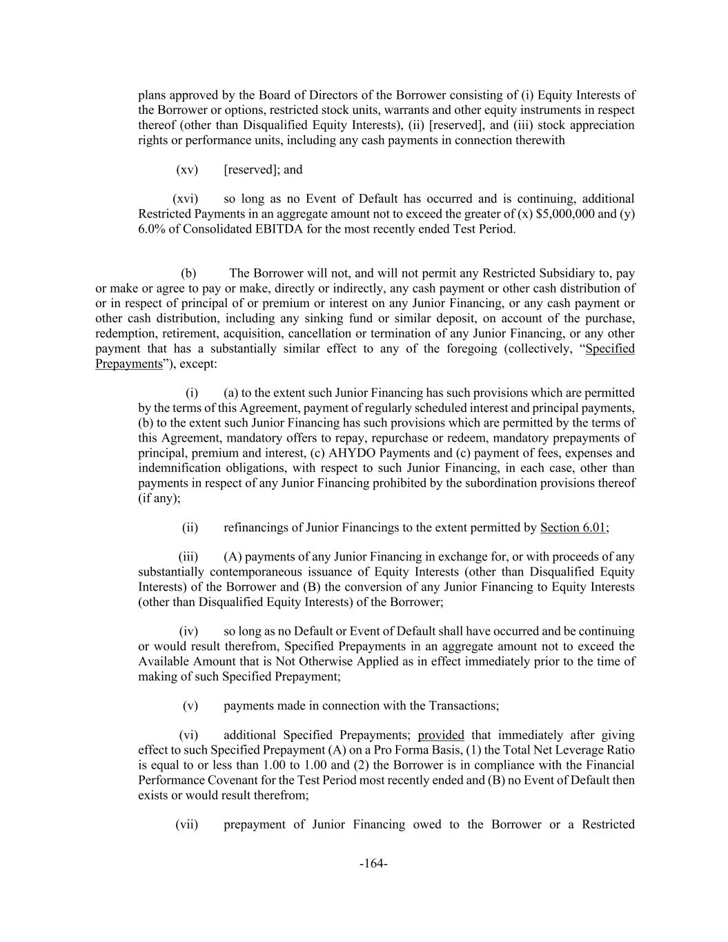-164- plans approved by the Board of Directors of the Borrower consisting of (i) Equity Interests of the Borrower or options, restricted stock units, warrants and other equity instruments in respect thereof (other than Disqualified Equity Interests), (ii) [reserved], and (iii) stock appreciation rights or performance units, including any cash payments in connection therewith (xv) [reserved]; and (xvi) so long as no Event of Default has occurred and is continuing, additional Restricted Payments in an aggregate amount not to exceed the greater of (x) $5,000,000 and (y) 6.0% of Consolidated EBITDA for the most recently ended Test Period. (b) The Borrower will not, and will not permit any Restricted Subsidiary to, pay or make or agree to pay or make, directly or indirectly, any cash payment or other cash distribution of or in respect of principal of or premium or interest on any Junior Financing, or any cash payment or other cash distribution, including any sinking fund or similar deposit, on account of the purchase, redemption, retirement, acquisition, cancellation or termination of any Junior Financing, or any other payment that has a substantially similar effect to any of the foregoing (collectively, “Specified Prepayments”), except: (i) (a) to the extent such Junior Financing has such provisions which are permitted by the terms of this Agreement, payment of regularly scheduled interest and principal payments, (b) to the extent such Junior Financing has such provisions which are permitted by the terms of this Agreement, mandatory offers to repay, repurchase or redeem, mandatory prepayments of principal, premium and interest, (c) AHYDO Payments and (c) payment of fees, expenses and indemnification obligations, with respect to such Junior Financing, in each case, other than payments in respect of any Junior Financing prohibited by the subordination provisions thereof (if any); (ii) refinancings of Junior Financings to the extent permitted by Section 6.01; (iii) (A) payments of any Junior Financing in exchange for, or with proceeds of any substantially contemporaneous issuance of Equity Interests (other than Disqualified Equity Interests) of the Borrower and (B) the conversion of any Junior Financing to Equity Interests (other than Disqualified Equity Interests) of the Borrower; (iv) so long as no Default or Event of Default shall have occurred and be continuing or would result therefrom, Specified Prepayments in an aggregate amount not to exceed the Available Amount that is Not Otherwise Applied as in effect immediately prior to the time of making of such Specified Prepayment; (v) payments made in connection with the Transactions; (vi) additional Specified Prepayments; provided that immediately after giving effect to such Specified Prepayment (A) on a Pro Forma Basis, (1) the Total Net Leverage Ratio is equal to or less than 1.00 to 1.00 and (2) the Borrower is in compliance with the Financial Performance Covenant for the Test Period most recently ended and (B) no Event of Default then exists or would result therefrom; (vii) prepayment of Junior Financing owed to the Borrower or a Restricted