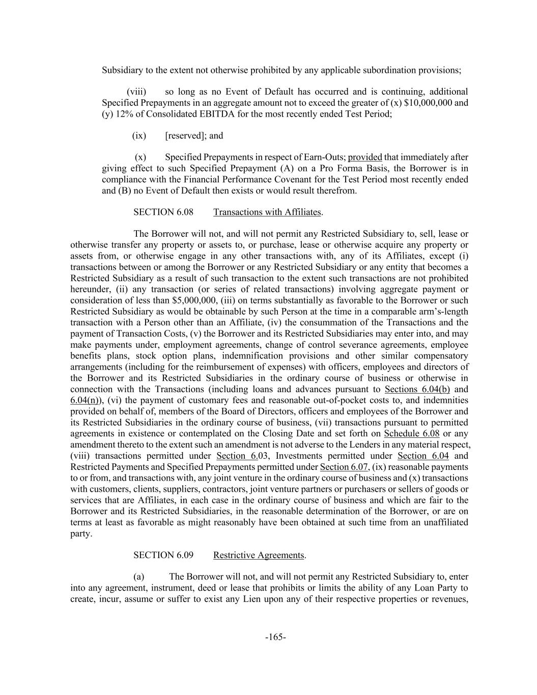 -165- Subsidiary to the extent not otherwise prohibited by any applicable subordination provisions; (viii) so long as no Event of Default has occurred and is continuing, additional Specified Prepayments in an aggregate amount not to exceed the greater of (x) $10,000,000 and (y) 12% of Consolidated EBITDA for the most recently ended Test Period; (ix) [reserved]; and (x) Specified Prepayments in respect of Earn-Outs; provided that immediately after giving effect to such Specified Prepayment (A) on a Pro Forma Basis, the Borrower is in compliance with the Financial Performance Covenant for the Test Period most recently ended and (B) no Event of Default then exists or would result therefrom. SECTION 6.08 Transactions with Affiliates. The Borrower will not, and will not permit any Restricted Subsidiary to, sell, lease or otherwise transfer any property or assets to, or purchase, lease or otherwise acquire any property or assets from, or otherwise engage in any other transactions with, any of its Affiliates, except (i) transactions between or among the Borrower or any Restricted Subsidiary or any entity that becomes a Restricted Subsidiary as a result of such transaction to the extent such transactions are not prohibited hereunder, (ii) any transaction (or series of related transactions) involving aggregate payment or consideration of less than $5,000,000, (iii) on terms substantially as favorable to the Borrower or such Restricted Subsidiary as would be obtainable by such Person at the time in a comparable arm’s-length transaction with a Person other than an Affiliate, (iv) the consummation of the Transactions and the payment of Transaction Costs, (v) the Borrower and its Restricted Subsidiaries may enter into, and may make payments under, employment agreements, change of control severance agreements, employee benefits plans, stock option plans, indemnification provisions and other similar compensatory arrangements (including for the reimbursement of expenses) with officers, employees and directors of the Borrower and its Restricted Subsidiaries in the ordinary course of business or otherwise in connection with the Transactions (including loans and advances pursuant to Sections 6.04(b) and 6.04(n)), (vi) the payment of customary fees and reasonable out-of-pocket costs to, and indemnities provided on behalf of, members of the Board of Directors, officers and employees of the Borrower and its Restricted Subsidiaries in the ordinary course of business, (vii) transactions pursuant to permitted agreements in existence or contemplated on the Closing Date and set forth on Schedule 6.08 or any amendment thereto to the extent such an amendment is not adverse to the Lenders in any material respect, (viii) transactions permitted under Section 6.03, Investments permitted under Section 6.04 and Restricted Payments and Specified Prepayments permitted under Section 6.07, (ix) reasonable payments to or from, and transactions with, any joint venture in the ordinary course of business and (x) transactions with customers, clients, suppliers, contractors, joint venture partners or purchasers or sellers of goods or services that are Affiliates, in each case in the ordinary course of business and which are fair to the Borrower and its Restricted Subsidiaries, in the reasonable determination of the Borrower, or are on terms at least as favorable as might reasonably have been obtained at such time from an unaffiliated party. SECTION 6.09 Restrictive Agreements. (a) The Borrower will not, and will not permit any Restricted Subsidiary to, enter into any agreement, instrument, deed or lease that prohibits or limits the ability of any Loan Party to create, incur, assume or suffer to exist any Lien upon any of their respective properties or revenues,