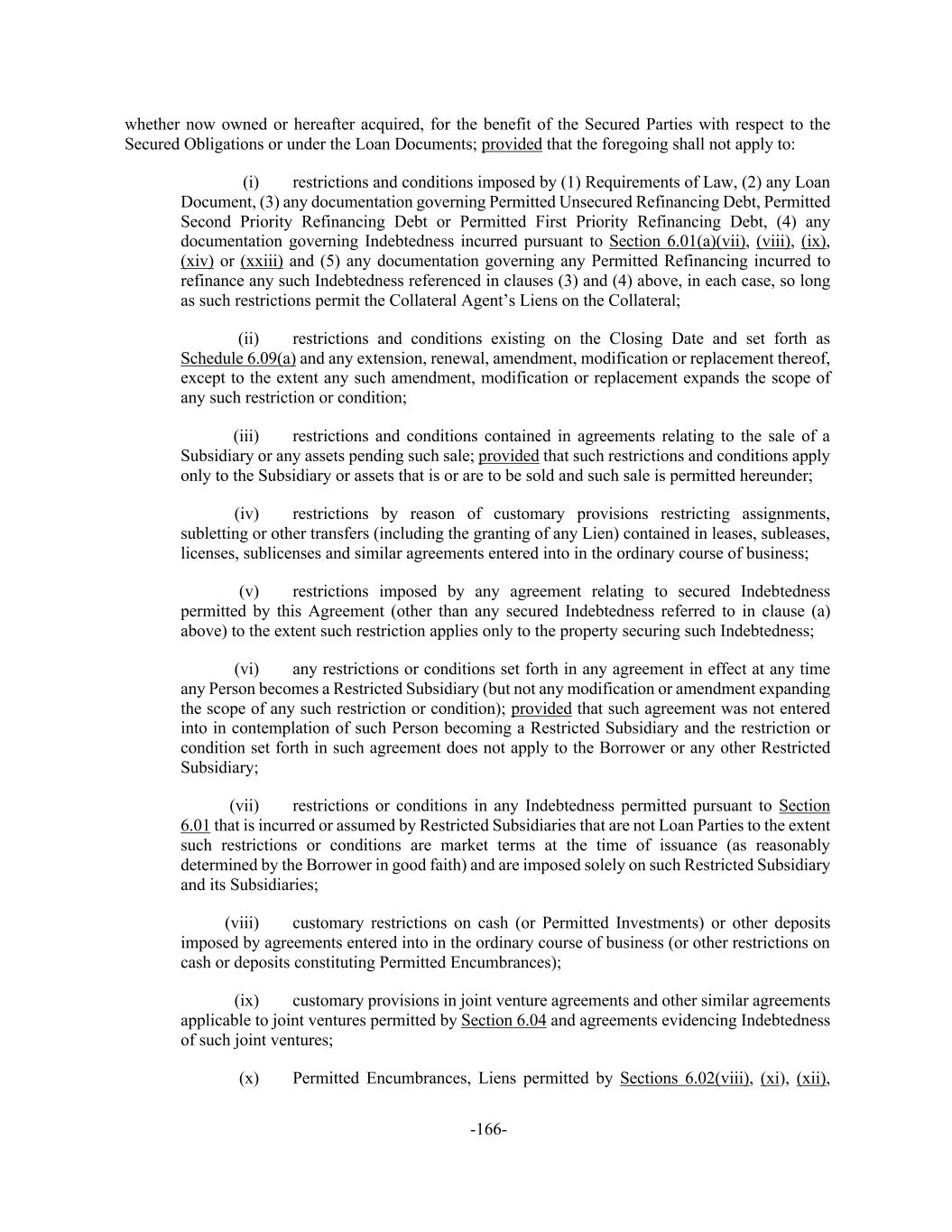 -166- whether now owned or hereafter acquired, for the benefit of the Secured Parties with respect to the Secured Obligations or under the Loan Documents; provided that the foregoing shall not apply to: (i) restrictions and conditions imposed by (1) Requirements of Law, (2) any Loan Document, (3) any documentation governing Permitted Unsecured Refinancing Debt, Permitted Second Priority Refinancing Debt or Permitted First Priority Refinancing Debt, (4) any documentation governing Indebtedness incurred pursuant to Section 6.01(a)(vii), (viii), (ix), (xiv) or (xxiii) and (5) any documentation governing any Permitted Refinancing incurred to refinance any such Indebtedness referenced in clauses (3) and (4) above, in each case, so long as such restrictions permit the Collateral Agent’s Liens on the Collateral; (ii) restrictions and conditions existing on the Closing Date and set forth as Schedule 6.09(a) and any extension, renewal, amendment, modification or replacement thereof, except to the extent any such amendment, modification or replacement expands the scope of any such restriction or condition; (iii) restrictions and conditions contained in agreements relating to the sale of a Subsidiary or any assets pending such sale; provided that such restrictions and conditions apply only to the Subsidiary or assets that is or are to be sold and such sale is permitted hereunder; (iv) restrictions by reason of customary provisions restricting assignments, subletting or other transfers (including the granting of any Lien) contained in leases, subleases, licenses, sublicenses and similar agreements entered into in the ordinary course of business; (v) restrictions imposed by any agreement relating to secured Indebtedness permitted by this Agreement (other than any secured Indebtedness referred to in clause (a) above) to the extent such restriction applies only to the property securing such Indebtedness; (vi) any restrictions or conditions set forth in any agreement in effect at any time any Person becomes a Restricted Subsidiary (but not any modification or amendment expanding the scope of any such restriction or condition); provided that such agreement was not entered into in contemplation of such Person becoming a Restricted Subsidiary and the restriction or condition set forth in such agreement does not apply to the Borrower or any other Restricted Subsidiary; (vii) restrictions or conditions in any Indebtedness permitted pursuant to Section 6.01 that is incurred or assumed by Restricted Subsidiaries that are not Loan Parties to the extent such restrictions or conditions are market terms at the time of issuance (as reasonably determined by the Borrower in good faith) and are imposed solely on such Restricted Subsidiary and its Subsidiaries; (viii) customary restrictions on cash (or Permitted Investments) or other deposits imposed by agreements entered into in the ordinary course of business (or other restrictions on cash or deposits constituting Permitted Encumbrances); (ix) customary provisions in joint venture agreements and other similar agreements applicable to joint ventures permitted by Section 6.04 and agreements evidencing Indebtedness of such joint ventures; (x) Permitted Encumbrances, Liens permitted by Sections 6.02(viii), (xi), (xii),