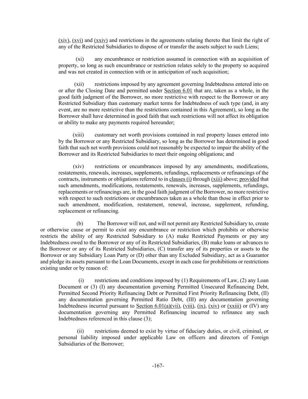 -167- (xiv), (xvi) and (xxiv) and restrictions in the agreements relating thereto that limit the right of any of the Restricted Subsidiaries to dispose of or transfer the assets subject to such Liens; (xi) any encumbrance or restriction assumed in connection with an acquisition of property, so long as such encumbrance or restriction relates solely to the property so acquired and was not created in connection with or in anticipation of such acquisition; (xii) restrictions imposed by any agreement governing Indebtedness entered into on or after the Closing Date and permitted under Section 6.01 that are, taken as a whole, in the good faith judgment of the Borrower, no more restrictive with respect to the Borrower or any Restricted Subsidiary than customary market terms for Indebtedness of such type (and, in any event, are no more restrictive than the restrictions contained in this Agreement), so long as the Borrower shall have determined in good faith that such restrictions will not affect its obligation or ability to make any payments required hereunder; (xiii) customary net worth provisions contained in real property leases entered into by the Borrower or any Restricted Subsidiary, so long as the Borrower has determined in good faith that such net worth provisions could not reasonably be expected to impair the ability of the Borrower and its Restricted Subsidiaries to meet their ongoing obligations; and (xiv) restrictions or encumbrances imposed by any amendments, modifications, restatements, renewals, increases, supplements, refundings, replacements or refinancings of the contracts, instruments or obligations referred to in clauses (i) through (xiii) above; provided that such amendments, modifications, restatements, renewals, increases, supplements, refundings, replacements or refinancings are, in the good faith judgment of the Borrower, no more restrictive with respect to such restrictions or encumbrances taken as a whole than those in effect prior to such amendment, modification, restatement, renewal, increase, supplement, refunding, replacement or refinancing. (b) The Borrower will not, and will not permit any Restricted Subsidiary to, create or otherwise cause or permit to exist any encumbrance or restriction which prohibits or otherwise restricts the ability of any Restricted Subsidiary to (A) make Restricted Payments or pay any Indebtedness owed to the Borrower or any of its Restricted Subsidiaries, (B) make loans or advances to the Borrower or any of its Restricted Subsidiaries, (C) transfer any of its properties or assets to the Borrower or any Subsidiary Loan Party or (D) other than any Excluded Subsidiary, act as a Guarantor and pledge its assets pursuant to the Loan Documents, except in each case for prohibitions or restrictions existing under or by reason of: (i) restrictions and conditions imposed by (1) Requirements of Law, (2) any Loan Document or (3) (I) any documentation governing Permitted Unsecured Refinancing Debt, Permitted Second Priority Refinancing Debt or Permitted First Priority Refinancing Debt, (II) any documentation governing Permitted Ratio Debt, (III) any documentation governing Indebtedness incurred pursuant to Section 6.01(a)(vii), (viii), (ix), (xiv) or (xxiii) or (IV) any documentation governing any Permitted Refinancing incurred to refinance any such Indebtedness referenced in this clause (3); (ii) restrictions deemed to exist by virtue of fiduciary duties, or civil, criminal, or personal liability imposed under applicable Law on officers and directors of Foreign Subsidiaries of the Borrower;
