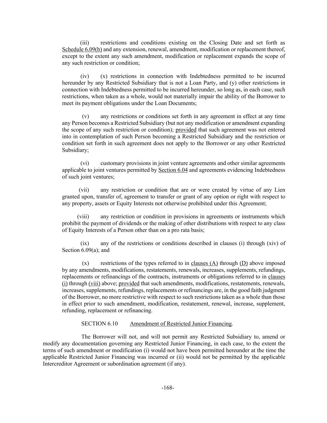 -168- (iii) restrictions and conditions existing on the Closing Date and set forth as Schedule 6.09(b) and any extension, renewal, amendment, modification or replacement thereof, except to the extent any such amendment, modification or replacement expands the scope of any such restriction or condition; (iv) (x) restrictions in connection with Indebtedness permitted to be incurred hereunder by any Restricted Subsidiary that is not a Loan Party, and (y) other restrictions in connection with Indebtedness permitted to be incurred hereunder, so long as, in each case, such restrictions, when taken as a whole, would not materially impair the ability of the Borrower to meet its payment obligations under the Loan Documents; (v) any restrictions or conditions set forth in any agreement in effect at any time any Person becomes a Restricted Subsidiary (but not any modification or amendment expanding the scope of any such restriction or condition); provided that such agreement was not entered into in contemplation of such Person becoming a Restricted Subsidiary and the restriction or condition set forth in such agreement does not apply to the Borrower or any other Restricted Subsidiary; (vi) customary provisions in joint venture agreements and other similar agreements applicable to joint ventures permitted by Section 6.04 and agreements evidencing Indebtedness of such joint ventures; (vii) any restriction or condition that are or were created by virtue of any Lien granted upon, transfer of, agreement to transfer or grant of any option or right with respect to any property, assets or Equity Interests not otherwise prohibited under this Agreement; (viii) any restriction or condition in provisions in agreements or instruments which prohibit the payment of dividends or the making of other distributions with respect to any class of Equity Interests of a Person other than on a pro rata basis; (ix) any of the restrictions or conditions described in clauses (i) through (xiv) of Section 6.09(a); and (x) restrictions of the types referred to in clauses (A) through (D) above imposed by any amendments, modifications, restatements, renewals, increases, supplements, refundings, replacements or refinancings of the contracts, instruments or obligations referred to in clauses (i) through (viii) above; provided that such amendments, modifications, restatements, renewals, increases, supplements, refundings, replacements or refinancings are, in the good faith judgment of the Borrower, no more restrictive with respect to such restrictions taken as a whole than those in effect prior to such amendment, modification, restatement, renewal, increase, supplement, refunding, replacement or refinancing. SECTION 6.10 Amendment of Restricted Junior Financing. The Borrower will not, and will not permit any Restricted Subsidiary to, amend or modify any documentation governing any Restricted Junior Financing, in each case, to the extent the terms of such amendment or modification (i) would not have been permitted hereunder at the time the applicable Restricted Junior Financing was incurred or (ii) would not be permitted by the applicable Intercreditor Agreement or subordination agreement (if any).