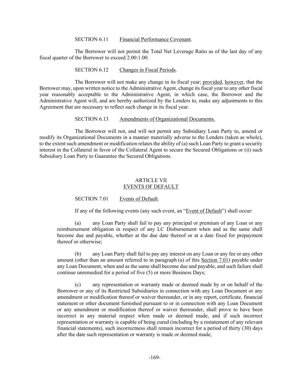 -169- SECTION 6.11 Financial Performance Covenant. The Borrower will not permit the Total Net Leverage Ratio as of the last day of any fiscal quarter of the Borrower to exceed 2.00:1.00. SECTION 6.12 Changes in Fiscal Periods. The Borrower will not make any change in its fiscal year; provided, however, that the Borrower may, upon written notice to the Administrative Agent, change its fiscal year to any other fiscal year reasonably acceptable to the Administrative Agent, in which case, the Borrower and the Administrative Agent will, and are hereby authorized by the Lenders to, make any adjustments to this Agreement that are necessary to reflect such change in its fiscal year. SECTION 6.13 Amendments of Organizational Documents. The Borrower will not, and will not permit any Subsidiary Loan Party to, amend or modify its Organizational Documents in a manner materially adverse to the Lenders (taken as whole), to the extent such amendment or modification relates the ability of (a) such Loan Party to grant a security interest in the Collateral in favor of the Collateral Agent to secure the Secured Obligations or (ii) such Subsidiary Loan Party to Guarantee the Secured Obligations. ARTICLE VII EVENTS OF DEFAULT SECTION 7.01 Events of Default. If any of the following events (any such event, an “Event of Default”) shall occur: (a) any Loan Party shall fail to pay any principal or premium of any Loan or any reimbursement obligation in respect of any LC Disbursement when and as the same shall become due and payable, whether at the due date thereof or at a date fixed for prepayment thereof or otherwise; (b) any Loan Party shall fail to pay any interest on any Loan or any fee or any other amount (other than an amount referred to in paragraph (a) of this Section 7.01) payable under any Loan Document, when and as the same shall become due and payable, and such failure shall continue unremedied for a period of five (5) or more Business Days; (c) any representation or warranty made or deemed made by or on behalf of the Borrower or any of its Restricted Subsidiaries in connection with any Loan Document or any amendment or modification thereof or waiver thereunder, or in any report, certificate, financial statement or other document furnished pursuant to or in connection with any Loan Document or any amendment or modification thereof or waiver thereunder, shall prove to have been incorrect in any material respect when made or deemed made, and if such incorrect representation or warranty is capable of being cured (including by a restatement of any relevant financial statements), such incorrectness shall remain incorrect for a period of thirty (30) days after the date such representation or warranty is made or deemed made;