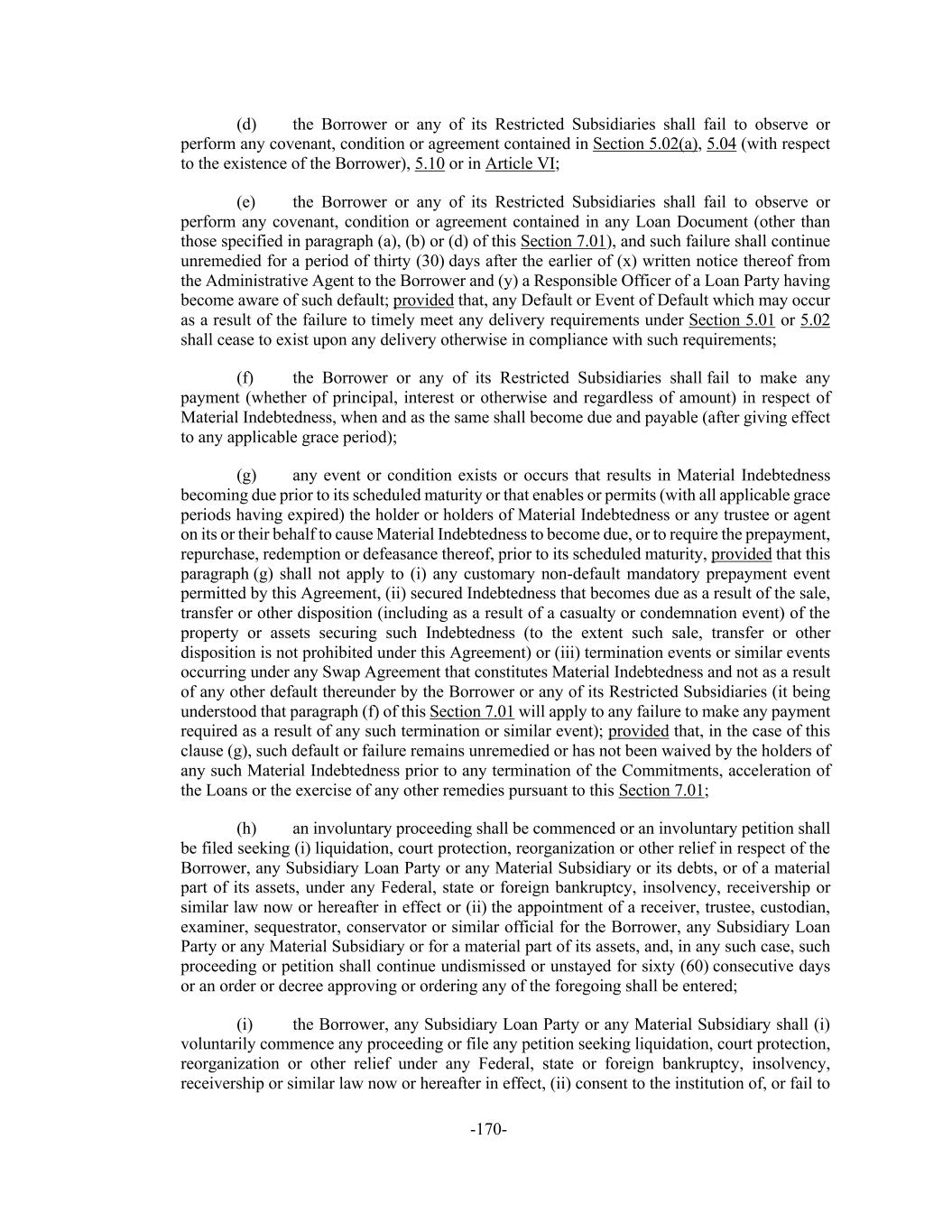 -170- (d) the Borrower or any of its Restricted Subsidiaries shall fail to observe or perform any covenant, condition or agreement contained in Section 5.02(a), 5.04 (with respect to the existence of the Borrower), 5.10 or in Article VI; (e) the Borrower or any of its Restricted Subsidiaries shall fail to observe or perform any covenant, condition or agreement contained in any Loan Document (other than those specified in paragraph (a), (b) or (d) of this Section 7.01), and such failure shall continue unremedied for a period of thirty (30) days after the earlier of (x) written notice thereof from the Administrative Agent to the Borrower and (y) a Responsible Officer of a Loan Party having become aware of such default; provided that, any Default or Event of Default which may occur as a result of the failure to timely meet any delivery requirements under Section 5.01 or 5.02 shall cease to exist upon any delivery otherwise in compliance with such requirements; (f) the Borrower or any of its Restricted Subsidiaries shall fail to make any payment (whether of principal, interest or otherwise and regardless of amount) in respect of Material Indebtedness, when and as the same shall become due and payable (after giving effect to any applicable grace period); (g) any event or condition exists or occurs that results in Material Indebtedness becoming due prior to its scheduled maturity or that enables or permits (with all applicable grace periods having expired) the holder or holders of Material Indebtedness or any trustee or agent on its or their behalf to cause Material Indebtedness to become due, or to require the prepayment, repurchase, redemption or defeasance thereof, prior to its scheduled maturity, provided that this paragraph (g) shall not apply to (i) any customary non-default mandatory prepayment event permitted by this Agreement, (ii) secured Indebtedness that becomes due as a result of the sale, transfer or other disposition (including as a result of a casualty or condemnation event) of the property or assets securing such Indebtedness (to the extent such sale, transfer or other disposition is not prohibited under this Agreement) or (iii) termination events or similar events occurring under any Swap Agreement that constitutes Material Indebtedness and not as a result of any other default thereunder by the Borrower or any of its Restricted Subsidiaries (it being understood that paragraph (f) of this Section 7.01 will apply to any failure to make any payment required as a result of any such termination or similar event); provided that, in the case of this clause (g), such default or failure remains unremedied or has not been waived by the holders of any such Material Indebtedness prior to any termination of the Commitments, acceleration of the Loans or the exercise of any other remedies pursuant to this Section 7.01; (h) an involuntary proceeding shall be commenced or an involuntary petition shall be filed seeking (i) liquidation, court protection, reorganization or other relief in respect of the Borrower, any Subsidiary Loan Party or any Material Subsidiary or its debts, or of a material part of its assets, under any Federal, state or foreign bankruptcy, insolvency, receivership or similar law now or hereafter in effect or (ii) the appointment of a receiver, trustee, custodian, examiner, sequestrator, conservator or similar official for the Borrower, any Subsidiary Loan Party or any Material Subsidiary or for a material part of its assets, and, in any such case, such proceeding or petition shall continue undismissed or unstayed for sixty (60) consecutive days or an order or decree approving or ordering any of the foregoing shall be entered; (i) the Borrower, any Subsidiary Loan Party or any Material Subsidiary shall (i) voluntarily commence any proceeding or file any petition seeking liquidation, court protection, reorganization or other relief under any Federal, state or foreign bankruptcy, insolvency, receivership or similar law now or hereafter in effect, (ii) consent to the institution of, or fail to