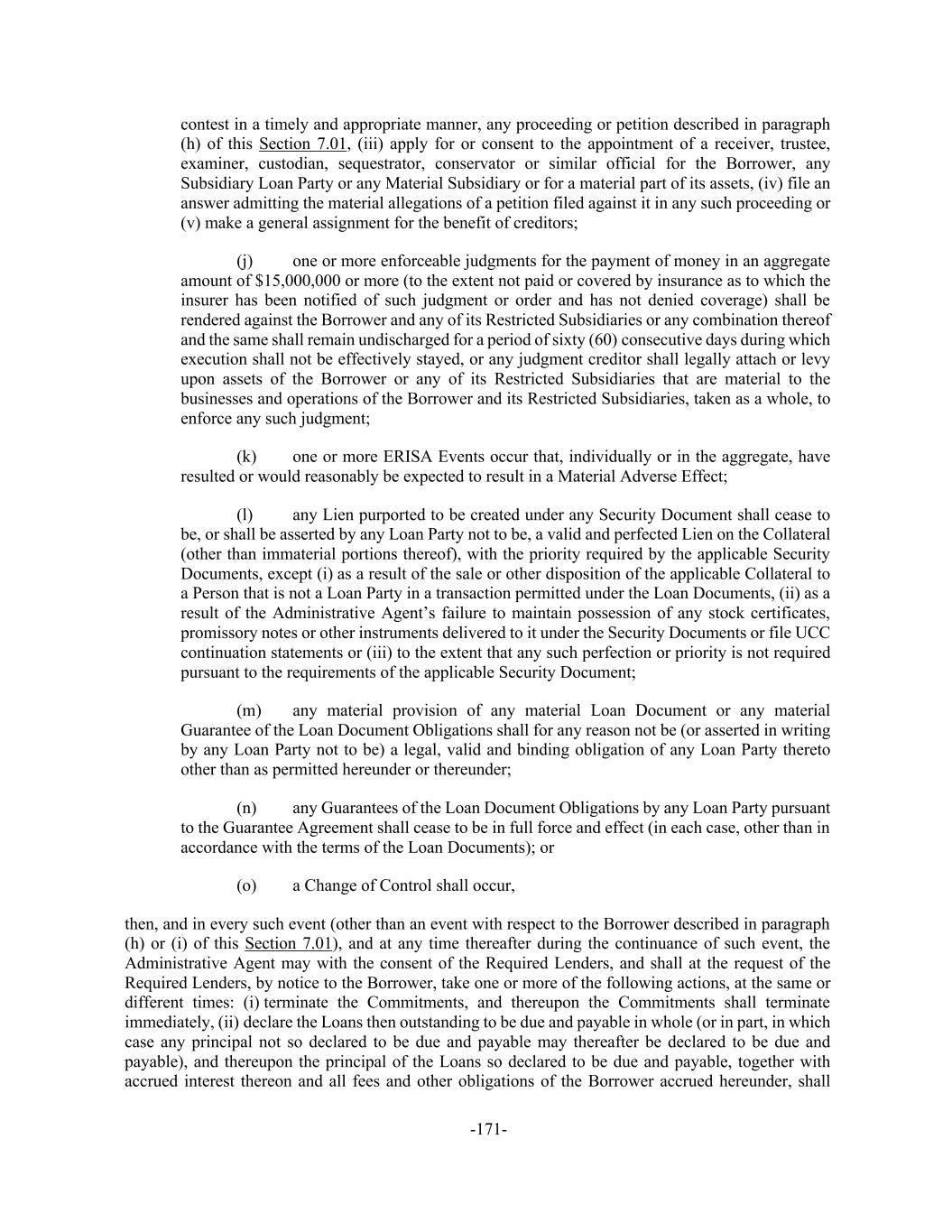 -171- contest in a timely and appropriate manner, any proceeding or petition described in paragraph (h) of this Section 7.01, (iii) apply for or consent to the appointment of a receiver, trustee, examiner, custodian, sequestrator, conservator or similar official for the Borrower, any Subsidiary Loan Party or any Material Subsidiary or for a material part of its assets, (iv) file an answer admitting the material allegations of a petition filed against it in any such proceeding or (v) make a general assignment for the benefit of creditors; (j) one or more enforceable judgments for the payment of money in an aggregate amount of $15,000,000 or more (to the extent not paid or covered by insurance as to which the insurer has been notified of such judgment or order and has not denied coverage) shall be rendered against the Borrower and any of its Restricted Subsidiaries or any combination thereof and the same shall remain undischarged for a period of sixty (60) consecutive days during which execution shall not be effectively stayed, or any judgment creditor shall legally attach or levy upon assets of the Borrower or any of its Restricted Subsidiaries that are material to the businesses and operations of the Borrower and its Restricted Subsidiaries, taken as a whole, to enforce any such judgment; (k) one or more ERISA Events occur that, individually or in the aggregate, have resulted or would reasonably be expected to result in a Material Adverse Effect; (l) any Lien purported to be created under any Security Document shall cease to be, or shall be asserted by any Loan Party not to be, a valid and perfected Lien on the Collateral (other than immaterial portions thereof), with the priority required by the applicable Security Documents, except (i) as a result of the sale or other disposition of the applicable Collateral to a Person that is not a Loan Party in a transaction permitted under the Loan Documents, (ii) as a result of the Administrative Agent’s failure to maintain possession of any stock certificates, promissory notes or other instruments delivered to it under the Security Documents or file UCC continuation statements or (iii) to the extent that any such perfection or priority is not required pursuant to the requirements of the applicable Security Document; (m) any material provision of any material Loan Document or any material Guarantee of the Loan Document Obligations shall for any reason not be (or asserted in writing by any Loan Party not to be) a legal, valid and binding obligation of any Loan Party thereto other than as permitted hereunder or thereunder; (n) any Guarantees of the Loan Document Obligations by any Loan Party pursuant to the Guarantee Agreement shall cease to be in full force and effect (in each case, other than in accordance with the terms of the Loan Documents); or (o) a Change of Control shall occur, then, and in every such event (other than an event with respect to the Borrower described in paragraph (h) or (i) of this Section 7.01), and at any time thereafter during the continuance of such event, the Administrative Agent may with the consent of the Required Lenders, and shall at the request of the Required Lenders, by notice to the Borrower, take one or more of the following actions, at the same or different times: (i) terminate the Commitments, and thereupon the Commitments shall terminate immediately, (ii) declare the Loans then outstanding to be due and payable in whole (or in part, in which case any principal not so declared to be due and payable may thereafter be declared to be due and payable), and thereupon the principal of the Loans so declared to be due and payable, together with accrued interest thereon and all fees and other obligations of the Borrower accrued hereunder, shall