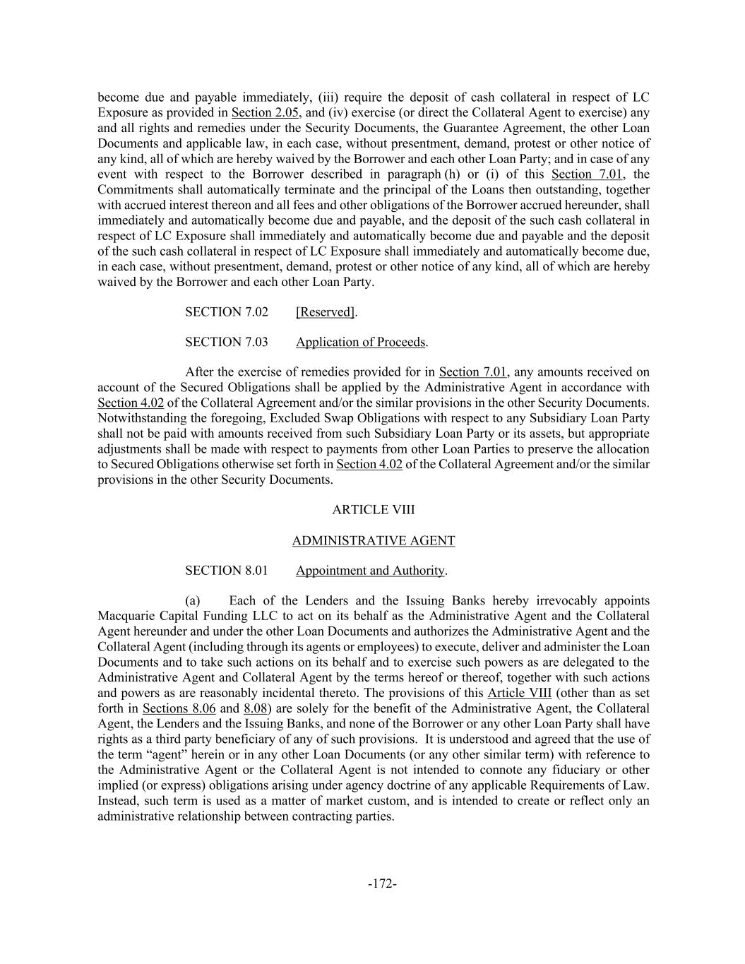 -172- become due and payable immediately, (iii) require the deposit of cash collateral in respect of LC Exposure as provided in Section 2.05, and (iv) exercise (or direct the Collateral Agent to exercise) any and all rights and remedies under the Security Documents, the Guarantee Agreement, the other Loan Documents and applicable law, in each case, without presentment, demand, protest or other notice of any kind, all of which are hereby waived by the Borrower and each other Loan Party; and in case of any event with respect to the Borrower described in paragraph (h) or (i) of this Section 7.01, the Commitments shall automatically terminate and the principal of the Loans then outstanding, together with accrued interest thereon and all fees and other obligations of the Borrower accrued hereunder, shall immediately and automatically become due and payable, and the deposit of the such cash collateral in respect of LC Exposure shall immediately and automatically become due and payable and the deposit of the such cash collateral in respect of LC Exposure shall immediately and automatically become due, in each case, without presentment, demand, protest or other notice of any kind, all of which are hereby waived by the Borrower and each other Loan Party. SECTION 7.02 [Reserved]. SECTION 7.03 Application of Proceeds. After the exercise of remedies provided for in Section 7.01, any amounts received on account of the Secured Obligations shall be applied by the Administrative Agent in accordance with Section 4.02 of the Collateral Agreement and/or the similar provisions in the other Security Documents. Notwithstanding the foregoing, Excluded Swap Obligations with respect to any Subsidiary Loan Party shall not be paid with amounts received from such Subsidiary Loan Party or its assets, but appropriate adjustments shall be made with respect to payments from other Loan Parties to preserve the allocation to Secured Obligations otherwise set forth in Section 4.02 of the Collateral Agreement and/or the similar provisions in the other Security Documents. ARTICLE VIII ADMINISTRATIVE AGENT SECTION 8.01 Appointment and Authority. (a) Each of the Lenders and the Issuing Banks hereby irrevocably appoints Macquarie Capital Funding LLC to act on its behalf as the Administrative Agent and the Collateral Agent hereunder and under the other Loan Documents and authorizes the Administrative Agent and the Collateral Agent (including through its agents or employees) to execute, deliver and administer the Loan Documents and to take such actions on its behalf and to exercise such powers as are delegated to the Administrative Agent and Collateral Agent by the terms hereof or thereof, together with such actions and powers as are reasonably incidental thereto. The provisions of this Article VIII (other than as set forth in Sections 8.06 and 8.08) are solely for the benefit of the Administrative Agent, the Collateral Agent, the Lenders and the Issuing Banks, and none of the Borrower or any other Loan Party shall have rights as a third party beneficiary of any of such provisions. It is understood and agreed that the use of the term “agent” herein or in any other Loan Documents (or any other similar term) with reference to the Administrative Agent or the Collateral Agent is not intended to connote any fiduciary or other implied (or express) obligations arising under agency doctrine of any applicable Requirements of Law. Instead, such term is used as a matter of market custom, and is intended to create or reflect only an administrative relationship between contracting parties.