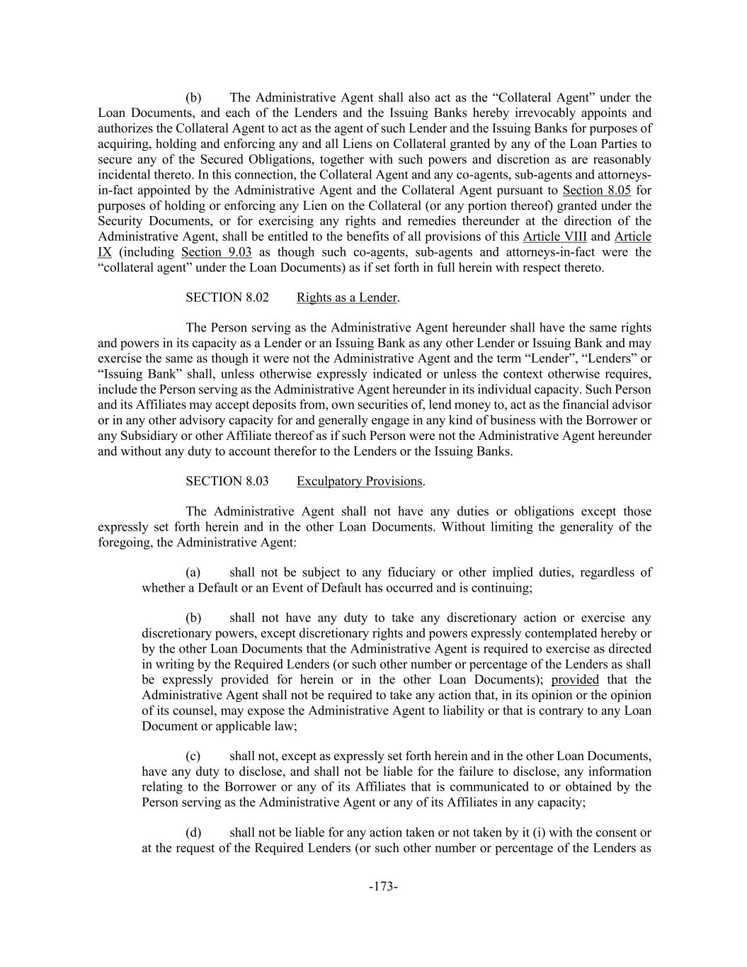 -173- (b) The Administrative Agent shall also act as the “Collateral Agent” under the Loan Documents, and each of the Lenders and the Issuing Banks hereby irrevocably appoints and authorizes the Collateral Agent to act as the agent of such Lender and the Issuing Banks for purposes of acquiring, holding and enforcing any and all Liens on Collateral granted by any of the Loan Parties to secure any of the Secured Obligations, together with such powers and discretion as are reasonably incidental thereto. In this connection, the Collateral Agent and any co-agents, sub-agents and attorneys- in-fact appointed by the Administrative Agent and the Collateral Agent pursuant to Section 8.05 for purposes of holding or enforcing any Lien on the Collateral (or any portion thereof) granted under the Security Documents, or for exercising any rights and remedies thereunder at the direction of the Administrative Agent, shall be entitled to the benefits of all provisions of this Article VIII and Article IX (including Section 9.03 as though such co-agents, sub-agents and attorneys-in-fact were the “collateral agent” under the Loan Documents) as if set forth in full herein with respect thereto. SECTION 8.02 Rights as a Lender. The Person serving as the Administrative Agent hereunder shall have the same rights and powers in its capacity as a Lender or an Issuing Bank as any other Lender or Issuing Bank and may exercise the same as though it were not the Administrative Agent and the term “Lender”, “Lenders” or “Issuing Bank” shall, unless otherwise expressly indicated or unless the context otherwise requires, include the Person serving as the Administrative Agent hereunder in its individual capacity. Such Person and its Affiliates may accept deposits from, own securities of, lend money to, act as the financial advisor or in any other advisory capacity for and generally engage in any kind of business with the Borrower or any Subsidiary or other Affiliate thereof as if such Person were not the Administrative Agent hereunder and without any duty to account therefor to the Lenders or the Issuing Banks. SECTION 8.03 Exculpatory Provisions. The Administrative Agent shall not have any duties or obligations except those expressly set forth herein and in the other Loan Documents. Without limiting the generality of the foregoing, the Administrative Agent: (a) shall not be subject to any fiduciary or other implied duties, regardless of whether a Default or an Event of Default has occurred and is continuing; (b) shall not have any duty to take any discretionary action or exercise any discretionary powers, except discretionary rights and powers expressly contemplated hereby or by the other Loan Documents that the Administrative Agent is required to exercise as directed in writing by the Required Lenders (or such other number or percentage of the Lenders as shall be expressly provided for herein or in the other Loan Documents); provided that the Administrative Agent shall not be required to take any action that, in its opinion or the opinion of its counsel, may expose the Administrative Agent to liability or that is contrary to any Loan Document or applicable law; (c) shall not, except as expressly set forth herein and in the other Loan Documents, have any duty to disclose, and shall not be liable for the failure to disclose, any information relating to the Borrower or any of its Affiliates that is communicated to or obtained by the Person serving as the Administrative Agent or any of its Affiliates in any capacity; (d) shall not be liable for any action taken or not taken by it (i) with the consent or at the request of the Required Lenders (or such other number or percentage of the Lenders as