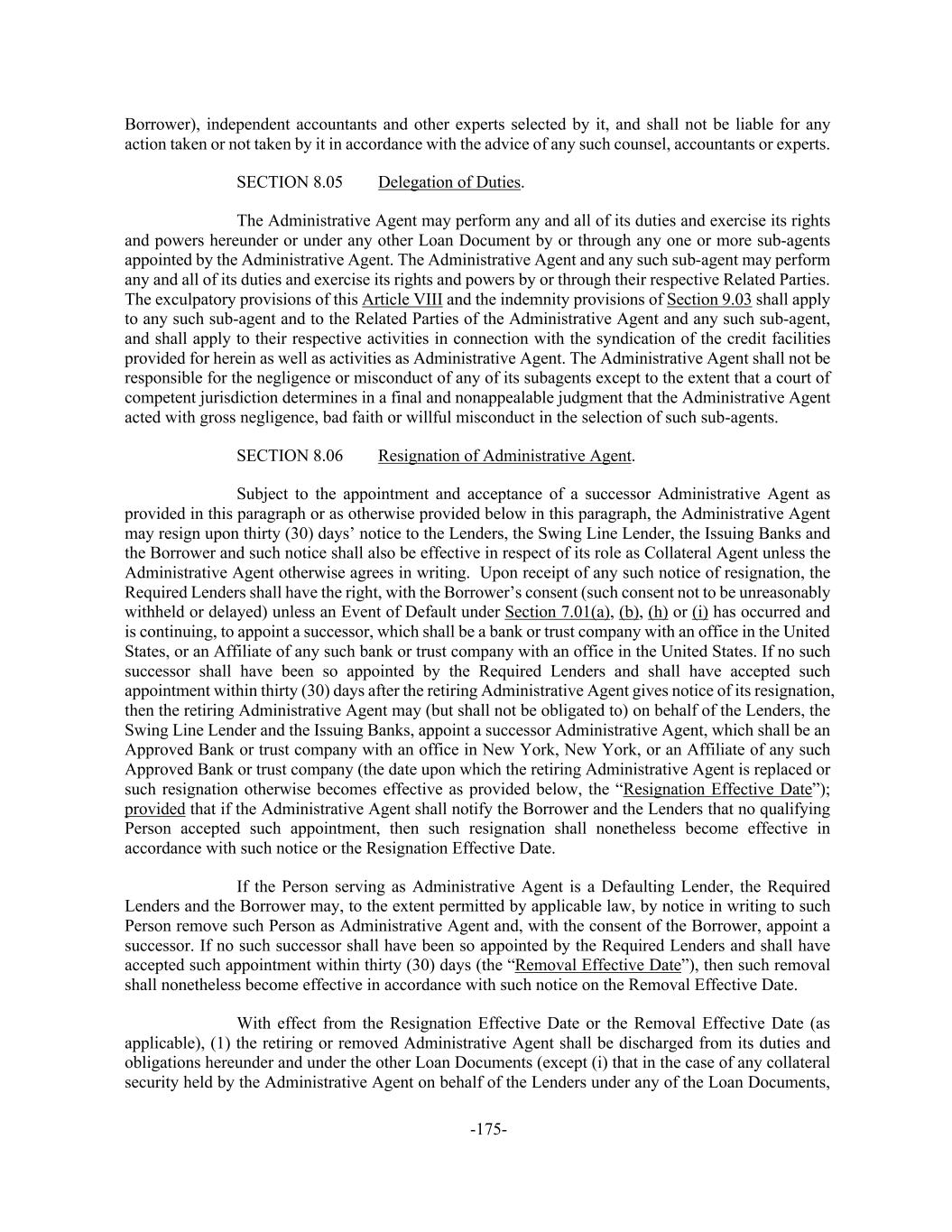 -175- Borrower), independent accountants and other experts selected by it, and shall not be liable for any action taken or not taken by it in accordance with the advice of any such counsel, accountants or experts. SECTION 8.05 Delegation of Duties. The Administrative Agent may perform any and all of its duties and exercise its rights and powers hereunder or under any other Loan Document by or through any one or more sub-agents appointed by the Administrative Agent. The Administrative Agent and any such sub-agent may perform any and all of its duties and exercise its rights and powers by or through their respective Related Parties. The exculpatory provisions of this Article VIII and the indemnity provisions of Section 9.03 shall apply to any such sub-agent and to the Related Parties of the Administrative Agent and any such sub-agent, and shall apply to their respective activities in connection with the syndication of the credit facilities provided for herein as well as activities as Administrative Agent. The Administrative Agent shall not be responsible for the negligence or misconduct of any of its subagents except to the extent that a court of competent jurisdiction determines in a final and nonappealable judgment that the Administrative Agent acted with gross negligence, bad faith or willful misconduct in the selection of such sub-agents. SECTION 8.06 Resignation of Administrative Agent. Subject to the appointment and acceptance of a successor Administrative Agent as provided in this paragraph or as otherwise provided below in this paragraph, the Administrative Agent may resign upon thirty (30) days’ notice to the Lenders, the Swing Line Lender, the Issuing Banks and the Borrower and such notice shall also be effective in respect of its role as Collateral Agent unless the Administrative Agent otherwise agrees in writing. Upon receipt of any such notice of resignation, the Required Lenders shall have the right, with the Borrower’s consent (such consent not to be unreasonably withheld or delayed) unless an Event of Default under Section 7.01(a), (b), (h) or (i) has occurred and is continuing, to appoint a successor, which shall be a bank or trust company with an office in the United States, or an Affiliate of any such bank or trust company with an office in the United States. If no such successor shall have been so appointed by the Required Lenders and shall have accepted such appointment within thirty (30) days after the retiring Administrative Agent gives notice of its resignation, then the retiring Administrative Agent may (but shall not be obligated to) on behalf of the Lenders, the Swing Line Lender and the Issuing Banks, appoint a successor Administrative Agent, which shall be an Approved Bank or trust company with an office in New York, New York, or an Affiliate of any such Approved Bank or trust company (the date upon which the retiring Administrative Agent is replaced or such resignation otherwise becomes effective as provided below, the “Resignation Effective Date”); provided that if the Administrative Agent shall notify the Borrower and the Lenders that no qualifying Person accepted such appointment, then such resignation shall nonetheless become effective in accordance with such notice or the Resignation Effective Date. If the Person serving as Administrative Agent is a Defaulting Lender, the Required Lenders and the Borrower may, to the extent permitted by applicable law, by notice in writing to such Person remove such Person as Administrative Agent and, with the consent of the Borrower, appoint a successor. If no such successor shall have been so appointed by the Required Lenders and shall have accepted such appointment within thirty (30) days (the “Removal Effective Date”), then such removal shall nonetheless become effective in accordance with such notice on the Removal Effective Date. With effect from the Resignation Effective Date or the Removal Effective Date (as applicable), (1) the retiring or removed Administrative Agent shall be discharged from its duties and obligations hereunder and under the other Loan Documents (except (i) that in the case of any collateral security held by the Administrative Agent on behalf of the Lenders under any of the Loan Documents,