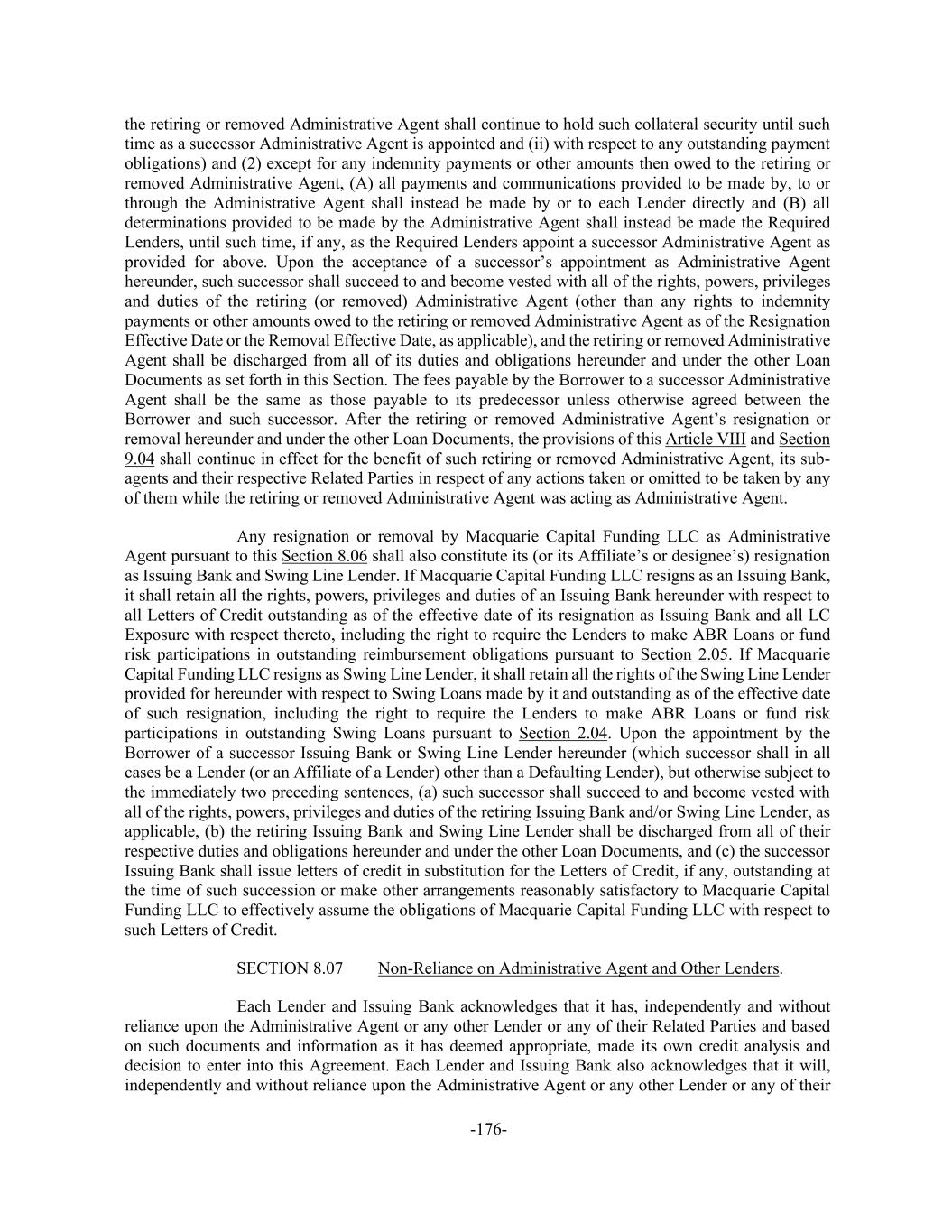 -176- the retiring or removed Administrative Agent shall continue to hold such collateral security until such time as a successor Administrative Agent is appointed and (ii) with respect to any outstanding payment obligations) and (2) except for any indemnity payments or other amounts then owed to the retiring or removed Administrative Agent, (A) all payments and communications provided to be made by, to or through the Administrative Agent shall instead be made by or to each Lender directly and (B) all determinations provided to be made by the Administrative Agent shall instead be made the Required Lenders, until such time, if any, as the Required Lenders appoint a successor Administrative Agent as provided for above. Upon the acceptance of a successor’s appointment as Administrative Agent hereunder, such successor shall succeed to and become vested with all of the rights, powers, privileges and duties of the retiring (or removed) Administrative Agent (other than any rights to indemnity payments or other amounts owed to the retiring or removed Administrative Agent as of the Resignation Effective Date or the Removal Effective Date, as applicable), and the retiring or removed Administrative Agent shall be discharged from all of its duties and obligations hereunder and under the other Loan Documents as set forth in this Section. The fees payable by the Borrower to a successor Administrative Agent shall be the same as those payable to its predecessor unless otherwise agreed between the Borrower and such successor. After the retiring or removed Administrative Agent’s resignation or removal hereunder and under the other Loan Documents, the provisions of this Article VIII and Section 9.04 shall continue in effect for the benefit of such retiring or removed Administrative Agent, its sub- agents and their respective Related Parties in respect of any actions taken or omitted to be taken by any of them while the retiring or removed Administrative Agent was acting as Administrative Agent. Any resignation or removal by Macquarie Capital Funding LLC as Administrative Agent pursuant to this Section 8.06 shall also constitute its (or its Affiliate’s or designee’s) resignation as Issuing Bank and Swing Line Lender. If Macquarie Capital Funding LLC resigns as an Issuing Bank, it shall retain all the rights, powers, privileges and duties of an Issuing Bank hereunder with respect to all Letters of Credit outstanding as of the effective date of its resignation as Issuing Bank and all LC Exposure with respect thereto, including the right to require the Lenders to make ABR Loans or fund risk participations in outstanding reimbursement obligations pursuant to Section 2.05. If Macquarie Capital Funding LLC resigns as Swing Line Lender, it shall retain all the rights of the Swing Line Lender provided for hereunder with respect to Swing Loans made by it and outstanding as of the effective date of such resignation, including the right to require the Lenders to make ABR Loans or fund risk participations in outstanding Swing Loans pursuant to Section 2.04. Upon the appointment by the Borrower of a successor Issuing Bank or Swing Line Lender hereunder (which successor shall in all cases be a Lender (or an Affiliate of a Lender) other than a Defaulting Lender), but otherwise subject to the immediately two preceding sentences, (a) such successor shall succeed to and become vested with all of the rights, powers, privileges and duties of the retiring Issuing Bank and/or Swing Line Lender, as applicable, (b) the retiring Issuing Bank and Swing Line Lender shall be discharged from all of their respective duties and obligations hereunder and under the other Loan Documents, and (c) the successor Issuing Bank shall issue letters of credit in substitution for the Letters of Credit, if any, outstanding at the time of such succession or make other arrangements reasonably satisfactory to Macquarie Capital Funding LLC to effectively assume the obligations of Macquarie Capital Funding LLC with respect to such Letters of Credit. SECTION 8.07 Non-Reliance on Administrative Agent and Other Lenders. Each Lender and Issuing Bank acknowledges that it has, independently and without reliance upon the Administrative Agent or any other Lender or any of their Related Parties and based on such documents and information as it has deemed appropriate, made its own credit analysis and decision to enter into this Agreement. Each Lender and Issuing Bank also acknowledges that it will, independently and without reliance upon the Administrative Agent or any other Lender or any of their