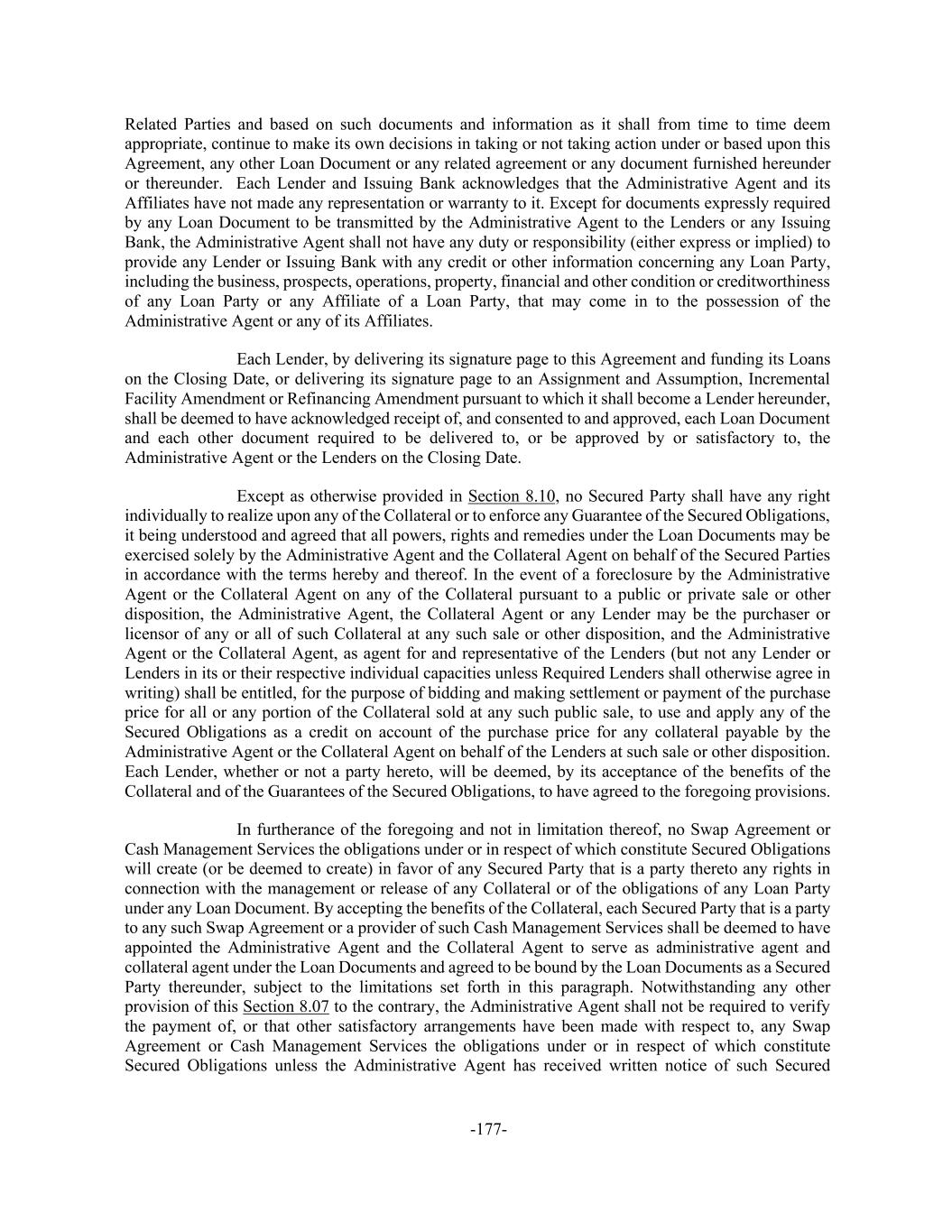 -177- Related Parties and based on such documents and information as it shall from time to time deem appropriate, continue to make its own decisions in taking or not taking action under or based upon this Agreement, any other Loan Document or any related agreement or any document furnished hereunder or thereunder. Each Lender and Issuing Bank acknowledges that the Administrative Agent and its Affiliates have not made any representation or warranty to it. Except for documents expressly required by any Loan Document to be transmitted by the Administrative Agent to the Lenders or any Issuing Bank, the Administrative Agent shall not have any duty or responsibility (either express or implied) to provide any Lender or Issuing Bank with any credit or other information concerning any Loan Party, including the business, prospects, operations, property, financial and other condition or creditworthiness of any Loan Party or any Affiliate of a Loan Party, that may come in to the possession of the Administrative Agent or any of its Affiliates. Each Lender, by delivering its signature page to this Agreement and funding its Loans on the Closing Date, or delivering its signature page to an Assignment and Assumption, Incremental Facility Amendment or Refinancing Amendment pursuant to which it shall become a Lender hereunder, shall be deemed to have acknowledged receipt of, and consented to and approved, each Loan Document and each other document required to be delivered to, or be approved by or satisfactory to, the Administrative Agent or the Lenders on the Closing Date. Except as otherwise provided in Section 8.10, no Secured Party shall have any right individually to realize upon any of the Collateral or to enforce any Guarantee of the Secured Obligations, it being understood and agreed that all powers, rights and remedies under the Loan Documents may be exercised solely by the Administrative Agent and the Collateral Agent on behalf of the Secured Parties in accordance with the terms hereby and thereof. In the event of a foreclosure by the Administrative Agent or the Collateral Agent on any of the Collateral pursuant to a public or private sale or other disposition, the Administrative Agent, the Collateral Agent or any Lender may be the purchaser or licensor of any or all of such Collateral at any such sale or other disposition, and the Administrative Agent or the Collateral Agent, as agent for and representative of the Lenders (but not any Lender or Lenders in its or their respective individual capacities unless Required Lenders shall otherwise agree in writing) shall be entitled, for the purpose of bidding and making settlement or payment of the purchase price for all or any portion of the Collateral sold at any such public sale, to use and apply any of the Secured Obligations as a credit on account of the purchase price for any collateral payable by the Administrative Agent or the Collateral Agent on behalf of the Lenders at such sale or other disposition. Each Lender, whether or not a party hereto, will be deemed, by its acceptance of the benefits of the Collateral and of the Guarantees of the Secured Obligations, to have agreed to the foregoing provisions. In furtherance of the foregoing and not in limitation thereof, no Swap Agreement or Cash Management Services the obligations under or in respect of which constitute Secured Obligations will create (or be deemed to create) in favor of any Secured Party that is a party thereto any rights in connection with the management or release of any Collateral or of the obligations of any Loan Party under any Loan Document. By accepting the benefits of the Collateral, each Secured Party that is a party to any such Swap Agreement or a provider of such Cash Management Services shall be deemed to have appointed the Administrative Agent and the Collateral Agent to serve as administrative agent and collateral agent under the Loan Documents and agreed to be bound by the Loan Documents as a Secured Party thereunder, subject to the limitations set forth in this paragraph. Notwithstanding any other provision of this Section 8.07 to the contrary, the Administrative Agent shall not be required to verify the payment of, or that other satisfactory arrangements have been made with respect to, any Swap Agreement or Cash Management Services the obligations under or in respect of which constitute Secured Obligations unless the Administrative Agent has received written notice of such Secured