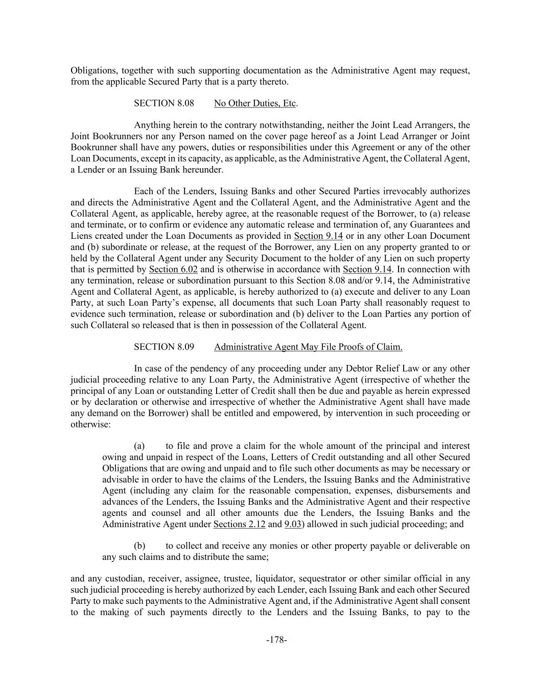 -178- Obligations, together with such supporting documentation as the Administrative Agent may request, from the applicable Secured Party that is a party thereto. SECTION 8.08 No Other Duties, Etc. Anything herein to the contrary notwithstanding, neither the Joint Lead Arrangers, the Joint Bookrunners nor any Person named on the cover page hereof as a Joint Lead Arranger or Joint Bookrunner shall have any powers, duties or responsibilities under this Agreement or any of the other Loan Documents, except in its capacity, as applicable, as the Administrative Agent, the Collateral Agent, a Lender or an Issuing Bank hereunder. Each of the Lenders, Issuing Banks and other Secured Parties irrevocably authorizes and directs the Administrative Agent and the Collateral Agent, and the Administrative Agent and the Collateral Agent, as applicable, hereby agree, at the reasonable request of the Borrower, to (a) release and terminate, or to confirm or evidence any automatic release and termination of, any Guarantees and Liens created under the Loan Documents as provided in Section 9.14 or in any other Loan Document and (b) subordinate or release, at the request of the Borrower, any Lien on any property granted to or held by the Collateral Agent under any Security Document to the holder of any Lien on such property that is permitted by Section 6.02 and is otherwise in accordance with Section 9.14. In connection with any termination, release or subordination pursuant to this Section 8.08 and/or 9.14, the Administrative Agent and Collateral Agent, as applicable, is hereby authorized to (a) execute and deliver to any Loan Party, at such Loan Party’s expense, all documents that such Loan Party shall reasonably request to evidence such termination, release or subordination and (b) deliver to the Loan Parties any portion of such Collateral so released that is then in possession of the Collateral Agent. SECTION 8.09 Administrative Agent May File Proofs of Claim. In case of the pendency of any proceeding under any Debtor Relief Law or any other judicial proceeding relative to any Loan Party, the Administrative Agent (irrespective of whether the principal of any Loan or outstanding Letter of Credit shall then be due and payable as herein expressed or by declaration or otherwise and irrespective of whether the Administrative Agent shall have made any demand on the Borrower) shall be entitled and empowered, by intervention in such proceeding or otherwise: (a) to file and prove a claim for the whole amount of the principal and interest owing and unpaid in respect of the Loans, Letters of Credit outstanding and all other Secured Obligations that are owing and unpaid and to file such other documents as may be necessary or advisable in order to have the claims of the Lenders, the Issuing Banks and the Administrative Agent (including any claim for the reasonable compensation, expenses, disbursements and advances of the Lenders, the Issuing Banks and the Administrative Agent and their respective agents and counsel and all other amounts due the Lenders, the Issuing Banks and the Administrative Agent under Sections 2.12 and 9.03) allowed in such judicial proceeding; and (b) to collect and receive any monies or other property payable or deliverable on any such claims and to distribute the same; and any custodian, receiver, assignee, trustee, liquidator, sequestrator or other similar official in any such judicial proceeding is hereby authorized by each Lender, each Issuing Bank and each other Secured Party to make such payments to the Administrative Agent and, if the Administrative Agent shall consent to the making of such payments directly to the Lenders and the Issuing Banks, to pay to the
