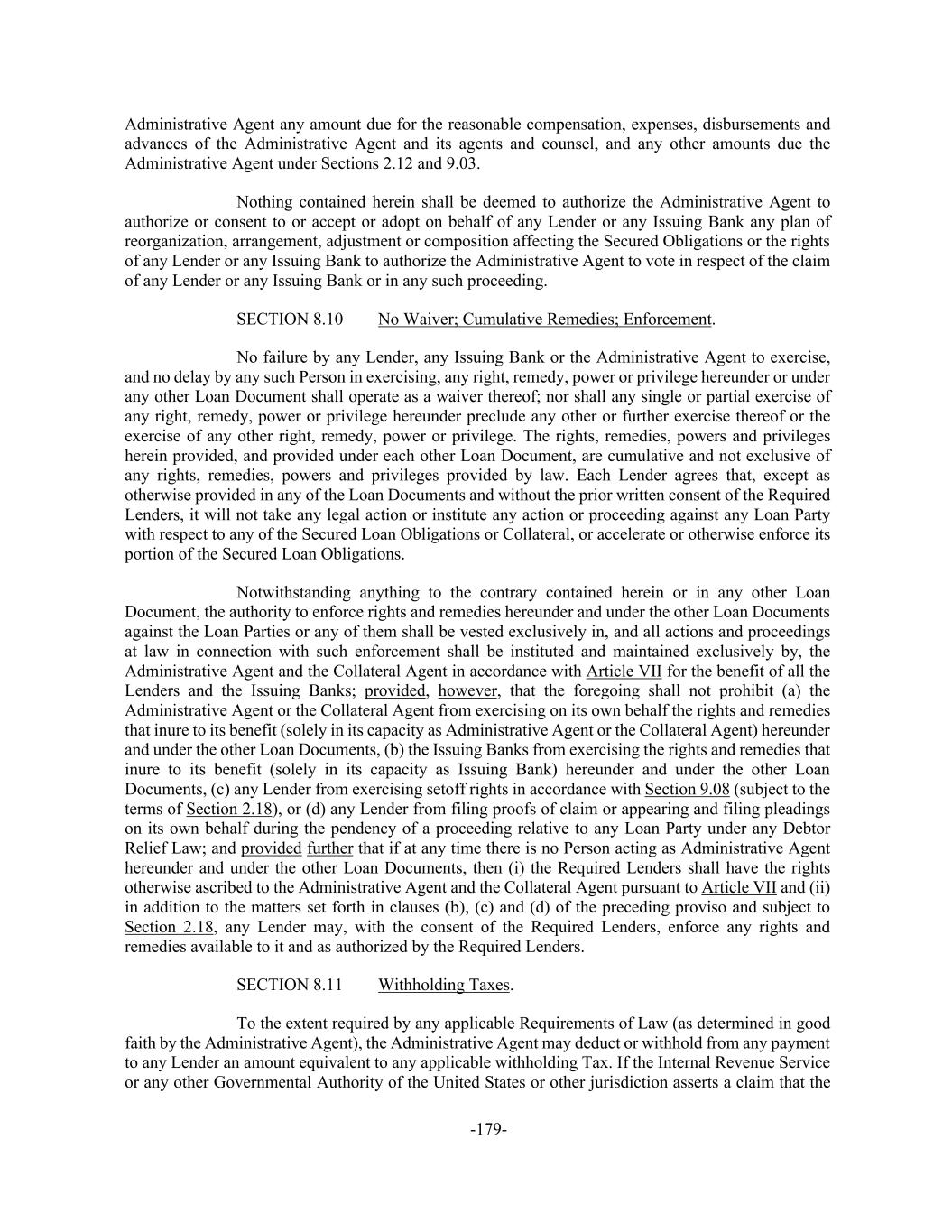 -179- Administrative Agent any amount due for the reasonable compensation, expenses, disbursements and advances of the Administrative Agent and its agents and counsel, and any other amounts due the Administrative Agent under Sections 2.12 and 9.03. Nothing contained herein shall be deemed to authorize the Administrative Agent to authorize or consent to or accept or adopt on behalf of any Lender or any Issuing Bank any plan of reorganization, arrangement, adjustment or composition affecting the Secured Obligations or the rights of any Lender or any Issuing Bank to authorize the Administrative Agent to vote in respect of the claim of any Lender or any Issuing Bank or in any such proceeding. SECTION 8.10 No Waiver; Cumulative Remedies; Enforcement. No failure by any Lender, any Issuing Bank or the Administrative Agent to exercise, and no delay by any such Person in exercising, any right, remedy, power or privilege hereunder or under any other Loan Document shall operate as a waiver thereof; nor shall any single or partial exercise of any right, remedy, power or privilege hereunder preclude any other or further exercise thereof or the exercise of any other right, remedy, power or privilege. The rights, remedies, powers and privileges herein provided, and provided under each other Loan Document, are cumulative and not exclusive of any rights, remedies, powers and privileges provided by law. Each Lender agrees that, except as otherwise provided in any of the Loan Documents and without the prior written consent of the Required Lenders, it will not take any legal action or institute any action or proceeding against any Loan Party with respect to any of the Secured Loan Obligations or Collateral, or accelerate or otherwise enforce its portion of the Secured Loan Obligations. Notwithstanding anything to the contrary contained herein or in any other Loan Document, the authority to enforce rights and remedies hereunder and under the other Loan Documents against the Loan Parties or any of them shall be vested exclusively in, and all actions and proceedings at law in connection with such enforcement shall be instituted and maintained exclusively by, the Administrative Agent and the Collateral Agent in accordance with Article VII for the benefit of all the Lenders and the Issuing Banks; provided, however, that the foregoing shall not prohibit (a) the Administrative Agent or the Collateral Agent from exercising on its own behalf the rights and remedies that inure to its benefit (solely in its capacity as Administrative Agent or the Collateral Agent) hereunder and under the other Loan Documents, (b) the Issuing Banks from exercising the rights and remedies that inure to its benefit (solely in its capacity as Issuing Bank) hereunder and under the other Loan Documents, (c) any Lender from exercising setoff rights in accordance with Section 9.08 (subject to the terms of Section 2.18), or (d) any Lender from filing proofs of claim or appearing and filing pleadings on its own behalf during the pendency of a proceeding relative to any Loan Party under any Debtor Relief Law; and provided further that if at any time there is no Person acting as Administrative Agent hereunder and under the other Loan Documents, then (i) the Required Lenders shall have the rights otherwise ascribed to the Administrative Agent and the Collateral Agent pursuant to Article VII and (ii) in addition to the matters set forth in clauses (b), (c) and (d) of the preceding proviso and subject to Section 2.18, any Lender may, with the consent of the Required Lenders, enforce any rights and remedies available to it and as authorized by the Required Lenders. SECTION 8.11 Withholding Taxes. To the extent required by any applicable Requirements of Law (as determined in good faith by the Administrative Agent), the Administrative Agent may deduct or withhold from any payment to any Lender an amount equivalent to any applicable withholding Tax. If the Internal Revenue Service or any other Governmental Authority of the United States or other jurisdiction asserts a claim that the