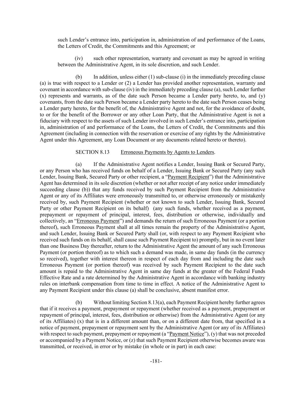 -181- such Lender’s entrance into, participation in, administration of and performance of the Loans, the Letters of Credit, the Commitments and this Agreement; or (iv) such other representation, warranty and covenant as may be agreed in writing between the Administrative Agent, in its sole discretion, and such Lender. (b) In addition, unless either (1) sub-clause (i) in the immediately preceding clause (a) is true with respect to a Lender or (2) a Lender has provided another representation, warranty and covenant in accordance with sub-clause (iv) in the immediately preceding clause (a), such Lender further (x) represents and warrants, as of the date such Person became a Lender party hereto, to, and (y) covenants, from the date such Person became a Lender party hereto to the date such Person ceases being a Lender party hereto, for the benefit of, the Administrative Agent and not, for the avoidance of doubt, to or for the benefit of the Borrower or any other Loan Party, that the Administrative Agent is not a fiduciary with respect to the assets of such Lender involved in such Lender’s entrance into, participation in, administration of and performance of the Loans, the Letters of Credit, the Commitments and this Agreement (including in connection with the reservation or exercise of any rights by the Administrative Agent under this Agreement, any Loan Document or any documents related hereto or thereto). SECTION 8.13 Erroneous Payments by Agents to Lenders. (a) If the Administrative Agent notifies a Lender, Issuing Bank or Secured Party, or any Person who has received funds on behalf of a Lender, Issuing Bank or Secured Party (any such Lender, Issuing Bank, Secured Party or other recipient, a “Payment Recipient”) that the Administrative Agent has determined in its sole discretion (whether or not after receipt of any notice under immediately succeeding clause (b)) that any funds received by such Payment Recipient from the Administrative Agent or any of its Affiliates were erroneously transmitted to, or otherwise erroneously or mistakenly received by, such Payment Recipient (whether or not known to such Lender, Issuing Bank, Secured Party or other Payment Recipient on its behalf) (any such funds, whether received as a payment, prepayment or repayment of principal, interest, fees, distribution or otherwise, individually and collectively, an “Erroneous Payment”) and demands the return of such Erroneous Payment (or a portion thereof), such Erroneous Payment shall at all times remain the property of the Administrative Agent, and such Lender, Issuing Bank or Secured Party shall (or, with respect to any Payment Recipient who received such funds on its behalf, shall cause such Payment Recipient to) promptly, but in no event later than one Business Day thereafter, return to the Administrative Agent the amount of any such Erroneous Payment (or portion thereof) as to which such a demand was made, in same day funds (in the currency so received), together with interest thereon in respect of each day from and including the date such Erroneous Payment (or portion thereof) was received by such Payment Recipient to the date such amount is repaid to the Administrative Agent in same day funds at the greater of the Federal Funds Effective Rate and a rate determined by the Administrative Agent in accordance with banking industry rules on interbank compensation from time to time in effect. A notice of the Administrative Agent to any Payment Recipient under this clause (a) shall be conclusive, absent manifest error. (b) Without limiting Section 8.13(a), each Payment Recipient hereby further agrees that if it receives a payment, prepayment or repayment (whether received as a payment, prepayment or repayment of principal, interest, fees, distribution or otherwise) from the Administrative Agent (or any of its Affiliates) (x) that is in a different amount than, or on a different date from, that specified in a notice of payment, prepayment or repayment sent by the Administrative Agent (or any of its Affiliates) with respect to such payment, prepayment or repayment (a “Payment Notice”), (y) that was not preceded or accompanied by a Payment Notice, or (z) that such Payment Recipient otherwise becomes aware was transmitted, or received, in error or by mistake (in whole or in part) in each case: