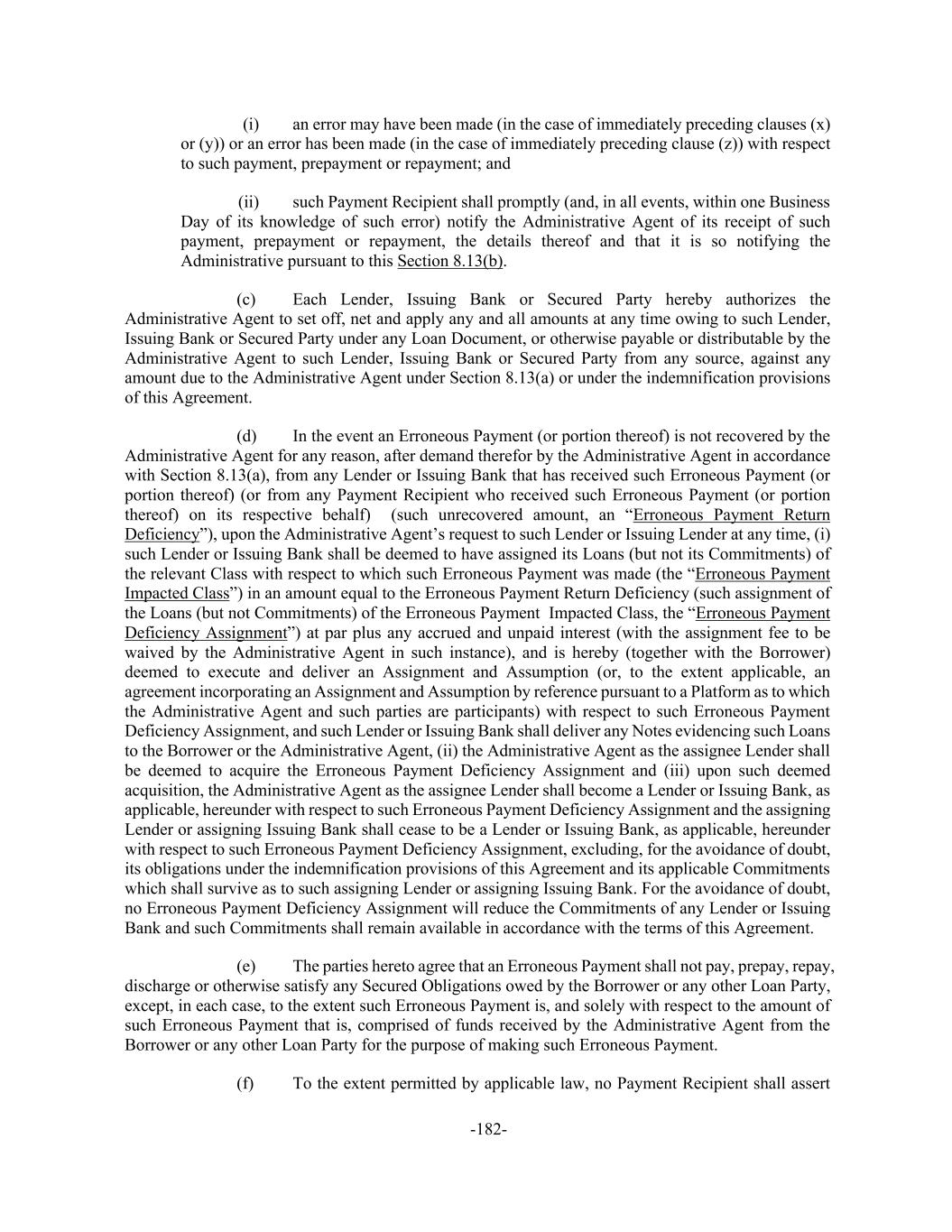 -182- (i) an error may have been made (in the case of immediately preceding clauses (x) or (y)) or an error has been made (in the case of immediately preceding clause (z)) with respect to such payment, prepayment or repayment; and (ii) such Payment Recipient shall promptly (and, in all events, within one Business Day of its knowledge of such error) notify the Administrative Agent of its receipt of such payment, prepayment or repayment, the details thereof and that it is so notifying the Administrative pursuant to this Section 8.13(b). (c) Each Lender, Issuing Bank or Secured Party hereby authorizes the Administrative Agent to set off, net and apply any and all amounts at any time owing to such Lender, Issuing Bank or Secured Party under any Loan Document, or otherwise payable or distributable by the Administrative Agent to such Lender, Issuing Bank or Secured Party from any source, against any amount due to the Administrative Agent under Section 8.13(a) or under the indemnification provisions of this Agreement. (d) In the event an Erroneous Payment (or portion thereof) is not recovered by the Administrative Agent for any reason, after demand therefor by the Administrative Agent in accordance with Section 8.13(a), from any Lender or Issuing Bank that has received such Erroneous Payment (or portion thereof) (or from any Payment Recipient who received such Erroneous Payment (or portion thereof) on its respective behalf) (such unrecovered amount, an “Erroneous Payment Return Deficiency”), upon the Administrative Agent’s request to such Lender or Issuing Lender at any time, (i) such Lender or Issuing Bank shall be deemed to have assigned its Loans (but not its Commitments) of the relevant Class with respect to which such Erroneous Payment was made (the “Erroneous Payment Impacted Class”) in an amount equal to the Erroneous Payment Return Deficiency (such assignment of the Loans (but not Commitments) of the Erroneous Payment Impacted Class, the “Erroneous Payment Deficiency Assignment”) at par plus any accrued and unpaid interest (with the assignment fee to be waived by the Administrative Agent in such instance), and is hereby (together with the Borrower) deemed to execute and deliver an Assignment and Assumption (or, to the extent applicable, an agreement incorporating an Assignment and Assumption by reference pursuant to a Platform as to which the Administrative Agent and such parties are participants) with respect to such Erroneous Payment Deficiency Assignment, and such Lender or Issuing Bank shall deliver any Notes evidencing such Loans to the Borrower or the Administrative Agent, (ii) the Administrative Agent as the assignee Lender shall be deemed to acquire the Erroneous Payment Deficiency Assignment and (iii) upon such deemed acquisition, the Administrative Agent as the assignee Lender shall become a Lender or Issuing Bank, as applicable, hereunder with respect to such Erroneous Payment Deficiency Assignment and the assigning Lender or assigning Issuing Bank shall cease to be a Lender or Issuing Bank, as applicable, hereunder with respect to such Erroneous Payment Deficiency Assignment, excluding, for the avoidance of doubt, its obligations under the indemnification provisions of this Agreement and its applicable Commitments which shall survive as to such assigning Lender or assigning Issuing Bank. For the avoidance of doubt, no Erroneous Payment Deficiency Assignment will reduce the Commitments of any Lender or Issuing Bank and such Commitments shall remain available in accordance with the terms of this Agreement. (e) The parties hereto agree that an Erroneous Payment shall not pay, prepay, repay, discharge or otherwise satisfy any Secured Obligations owed by the Borrower or any other Loan Party, except, in each case, to the extent such Erroneous Payment is, and solely with respect to the amount of such Erroneous Payment that is, comprised of funds received by the Administrative Agent from the Borrower or any other Loan Party for the purpose of making such Erroneous Payment. (f) To the extent permitted by applicable law, no Payment Recipient shall assert