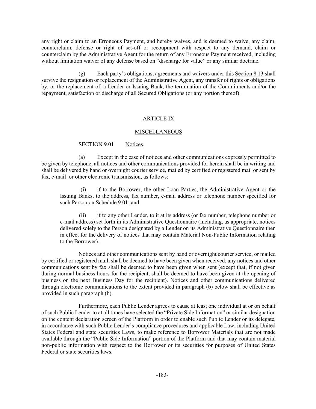 -183- any right or claim to an Erroneous Payment, and hereby waives, and is deemed to waive, any claim, counterclaim, defense or right of set-off or recoupment with respect to any demand, claim or counterclaim by the Administrative Agent for the return of any Erroneous Payment received, including without limitation waiver of any defense based on “discharge for value” or any similar doctrine. (g) Each party’s obligations, agreements and waivers under this Section 8.13 shall survive the resignation or replacement of the Administrative Agent, any transfer of rights or obligations by, or the replacement of, a Lender or Issuing Bank, the termination of the Commitments and/or the repayment, satisfaction or discharge of all Secured Obligations (or any portion thereof). ARTICLE IX MISCELLANEOUS SECTION 9.01 Notices. (a) Except in the case of notices and other communications expressly permitted to be given by telephone, all notices and other communications provided for herein shall be in writing and shall be delivered by hand or overnight courier service, mailed by certified or registered mail or sent by fax, e-mail or other electronic transmission, as follows: (i) if to the Borrower, the other Loan Parties, the Administrative Agent or the Issuing Banks, to the address, fax number, e-mail address or telephone number specified for such Person on Schedule 9.01; and (ii) if to any other Lender, to it at its address (or fax number, telephone number or e-mail address) set forth in its Administrative Questionnaire (including, as appropriate, notices delivered solely to the Person designated by a Lender on its Administrative Questionnaire then in effect for the delivery of notices that may contain Material Non-Public Information relating to the Borrower). Notices and other communications sent by hand or overnight courier service, or mailed by certified or registered mail, shall be deemed to have been given when received; any notices and other communications sent by fax shall be deemed to have been given when sent (except that, if not given during normal business hours for the recipient, shall be deemed to have been given at the opening of business on the next Business Day for the recipient). Notices and other communications delivered through electronic communications to the extent provided in paragraph (b) below shall be effective as provided in such paragraph (b). Furthermore, each Public Lender agrees to cause at least one individual at or on behalf of such Public Lender to at all times have selected the “Private Side Information” or similar designation on the content declaration screen of the Platform in order to enable such Public Lender or its delegate, in accordance with such Public Lender’s compliance procedures and applicable Law, including United States Federal and state securities Laws, to make reference to Borrower Materials that are not made available through the “Public Side Information” portion of the Platform and that may contain material non-public information with respect to the Borrower or its securities for purposes of United States Federal or state securities laws.