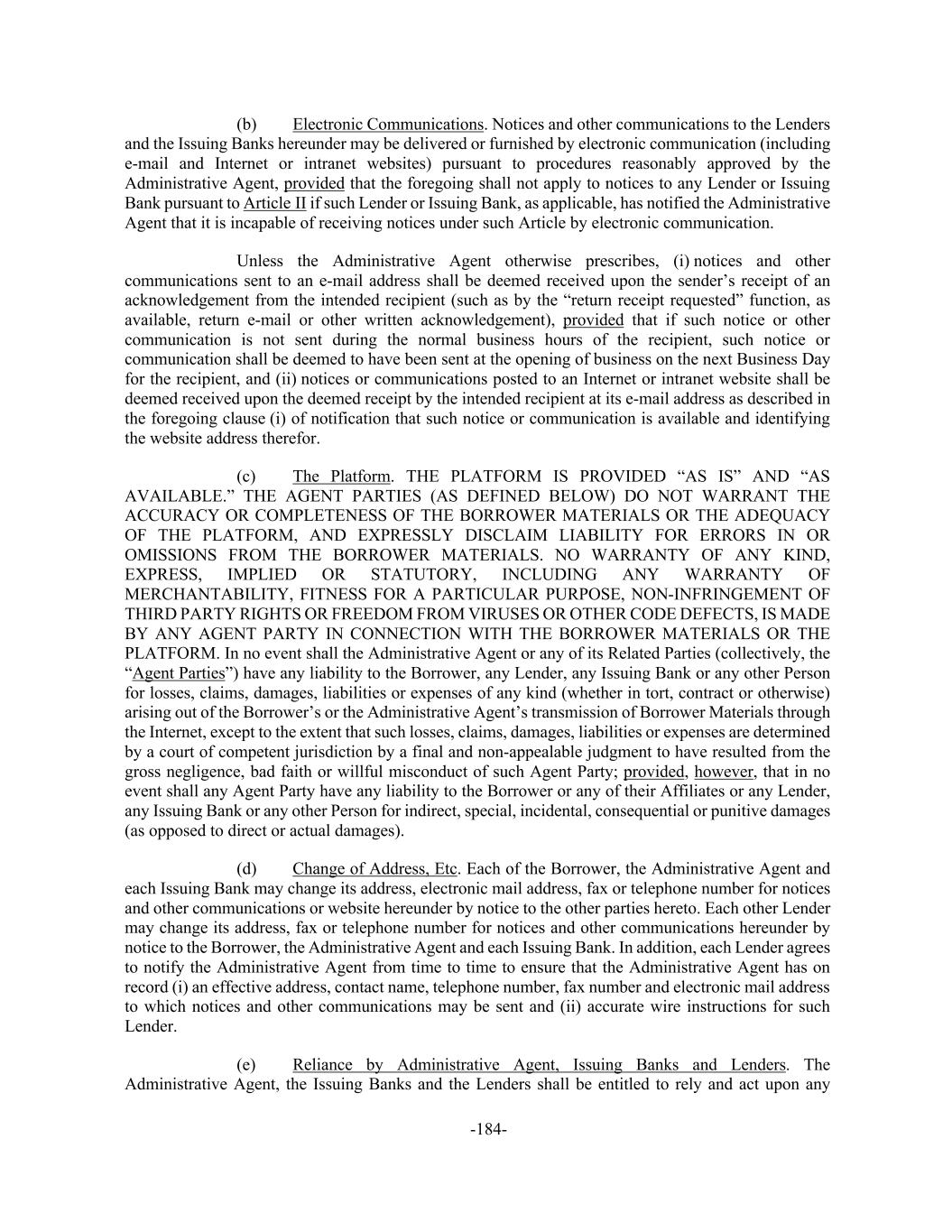 -184- (b) Electronic Communications. Notices and other communications to the Lenders and the Issuing Banks hereunder may be delivered or furnished by electronic communication (including e-mail and Internet or intranet websites) pursuant to procedures reasonably approved by the Administrative Agent, provided that the foregoing shall not apply to notices to any Lender or Issuing Bank pursuant to Article II if such Lender or Issuing Bank, as applicable, has notified the Administrative Agent that it is incapable of receiving notices under such Article by electronic communication. Unless the Administrative Agent otherwise prescribes, (i) notices and other communications sent to an e-mail address shall be deemed received upon the sender’s receipt of an acknowledgement from the intended recipient (such as by the “return receipt requested” function, as available, return e-mail or other written acknowledgement), provided that if such notice or other communication is not sent during the normal business hours of the recipient, such notice or communication shall be deemed to have been sent at the opening of business on the next Business Day for the recipient, and (ii) notices or communications posted to an Internet or intranet website shall be deemed received upon the deemed receipt by the intended recipient at its e-mail address as described in the foregoing clause (i) of notification that such notice or communication is available and identifying the website address therefor. (c) The Platform. THE PLATFORM IS PROVIDED “AS IS” AND “AS AVAILABLE.” THE AGENT PARTIES (AS DEFINED BELOW) DO NOT WARRANT THE ACCURACY OR COMPLETENESS OF THE BORROWER MATERIALS OR THE ADEQUACY OF THE PLATFORM, AND EXPRESSLY DISCLAIM LIABILITY FOR ERRORS IN OR OMISSIONS FROM THE BORROWER MATERIALS. NO WARRANTY OF ANY KIND, EXPRESS, IMPLIED OR STATUTORY, INCLUDING ANY WARRANTY OF MERCHANTABILITY, FITNESS FOR A PARTICULAR PURPOSE, NON-INFRINGEMENT OF THIRD PARTY RIGHTS OR FREEDOM FROM VIRUSES OR OTHER CODE DEFECTS, IS MADE BY ANY AGENT PARTY IN CONNECTION WITH THE BORROWER MATERIALS OR THE PLATFORM. In no event shall the Administrative Agent or any of its Related Parties (collectively, the “Agent Parties”) have any liability to the Borrower, any Lender, any Issuing Bank or any other Person for losses, claims, damages, liabilities or expenses of any kind (whether in tort, contract or otherwise) arising out of the Borrower’s or the Administrative Agent’s transmission of Borrower Materials through the Internet, except to the extent that such losses, claims, damages, liabilities or expenses are determined by a court of competent jurisdiction by a final and non-appealable judgment to have resulted from the gross negligence, bad faith or willful misconduct of such Agent Party; provided, however, that in no event shall any Agent Party have any liability to the Borrower or any of their Affiliates or any Lender, any Issuing Bank or any other Person for indirect, special, incidental, consequential or punitive damages (as opposed to direct or actual damages). (d) Change of Address, Etc. Each of the Borrower, the Administrative Agent and each Issuing Bank may change its address, electronic mail address, fax or telephone number for notices and other communications or website hereunder by notice to the other parties hereto. Each other Lender may change its address, fax or telephone number for notices and other communications hereunder by notice to the Borrower, the Administrative Agent and each Issuing Bank. In addition, each Lender agrees to notify the Administrative Agent from time to time to ensure that the Administrative Agent has on record (i) an effective address, contact name, telephone number, fax number and electronic mail address to which notices and other communications may be sent and (ii) accurate wire instructions for such Lender. (e) Reliance by Administrative Agent, Issuing Banks and Lenders. The Administrative Agent, the Issuing Banks and the Lenders shall be entitled to rely and act upon any