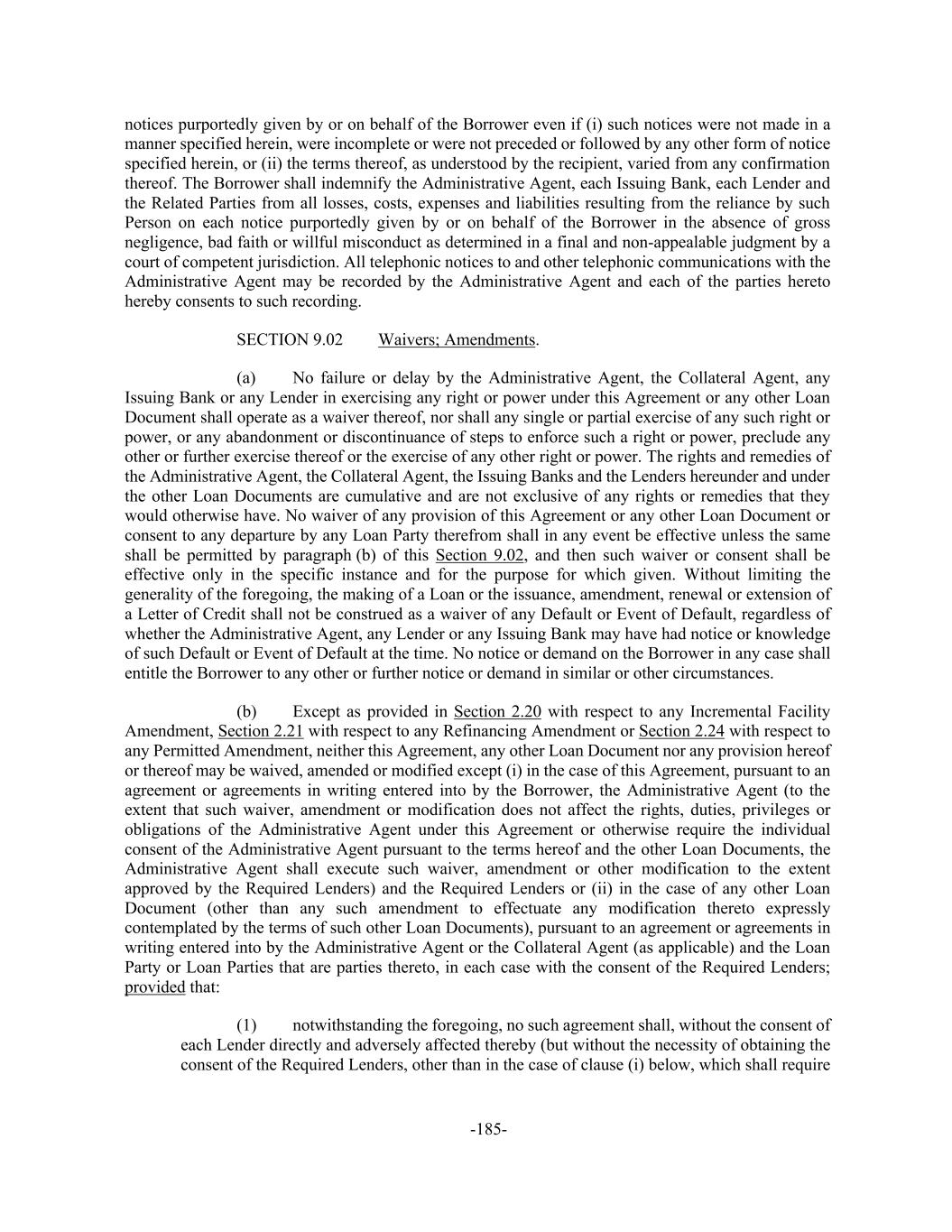 -185- notices purportedly given by or on behalf of the Borrower even if (i) such notices were not made in a manner specified herein, were incomplete or were not preceded or followed by any other form of notice specified herein, or (ii) the terms thereof, as understood by the recipient, varied from any confirmation thereof. The Borrower shall indemnify the Administrative Agent, each Issuing Bank, each Lender and the Related Parties from all losses, costs, expenses and liabilities resulting from the reliance by such Person on each notice purportedly given by or on behalf of the Borrower in the absence of gross negligence, bad faith or willful misconduct as determined in a final and non-appealable judgment by a court of competent jurisdiction. All telephonic notices to and other telephonic communications with the Administrative Agent may be recorded by the Administrative Agent and each of the parties hereto hereby consents to such recording. SECTION 9.02 Waivers; Amendments. (a) No failure or delay by the Administrative Agent, the Collateral Agent, any Issuing Bank or any Lender in exercising any right or power under this Agreement or any other Loan Document shall operate as a waiver thereof, nor shall any single or partial exercise of any such right or power, or any abandonment or discontinuance of steps to enforce such a right or power, preclude any other or further exercise thereof or the exercise of any other right or power. The rights and remedies of the Administrative Agent, the Collateral Agent, the Issuing Banks and the Lenders hereunder and under the other Loan Documents are cumulative and are not exclusive of any rights or remedies that they would otherwise have. No waiver of any provision of this Agreement or any other Loan Document or consent to any departure by any Loan Party therefrom shall in any event be effective unless the same shall be permitted by paragraph (b) of this Section 9.02, and then such waiver or consent shall be effective only in the specific instance and for the purpose for which given. Without limiting the generality of the foregoing, the making of a Loan or the issuance, amendment, renewal or extension of a Letter of Credit shall not be construed as a waiver of any Default or Event of Default, regardless of whether the Administrative Agent, any Lender or any Issuing Bank may have had notice or knowledge of such Default or Event of Default at the time. No notice or demand on the Borrower in any case shall entitle the Borrower to any other or further notice or demand in similar or other circumstances. (b) Except as provided in Section 2.20 with respect to any Incremental Facility Amendment, Section 2.21 with respect to any Refinancing Amendment or Section 2.24 with respect to any Permitted Amendment, neither this Agreement, any other Loan Document nor any provision hereof or thereof may be waived, amended or modified except (i) in the case of this Agreement, pursuant to an agreement or agreements in writing entered into by the Borrower, the Administrative Agent (to the extent that such waiver, amendment or modification does not affect the rights, duties, privileges or obligations of the Administrative Agent under this Agreement or otherwise require the individual consent of the Administrative Agent pursuant to the terms hereof and the other Loan Documents, the Administrative Agent shall execute such waiver, amendment or other modification to the extent approved by the Required Lenders) and the Required Lenders or (ii) in the case of any other Loan Document (other than any such amendment to effectuate any modification thereto expressly contemplated by the terms of such other Loan Documents), pursuant to an agreement or agreements in writing entered into by the Administrative Agent or the Collateral Agent (as applicable) and the Loan Party or Loan Parties that are parties thereto, in each case with the consent of the Required Lenders; provided that: (1) notwithstanding the foregoing, no such agreement shall, without the consent of each Lender directly and adversely affected thereby (but without the necessity of obtaining the consent of the Required Lenders, other than in the case of clause (i) below, which shall require