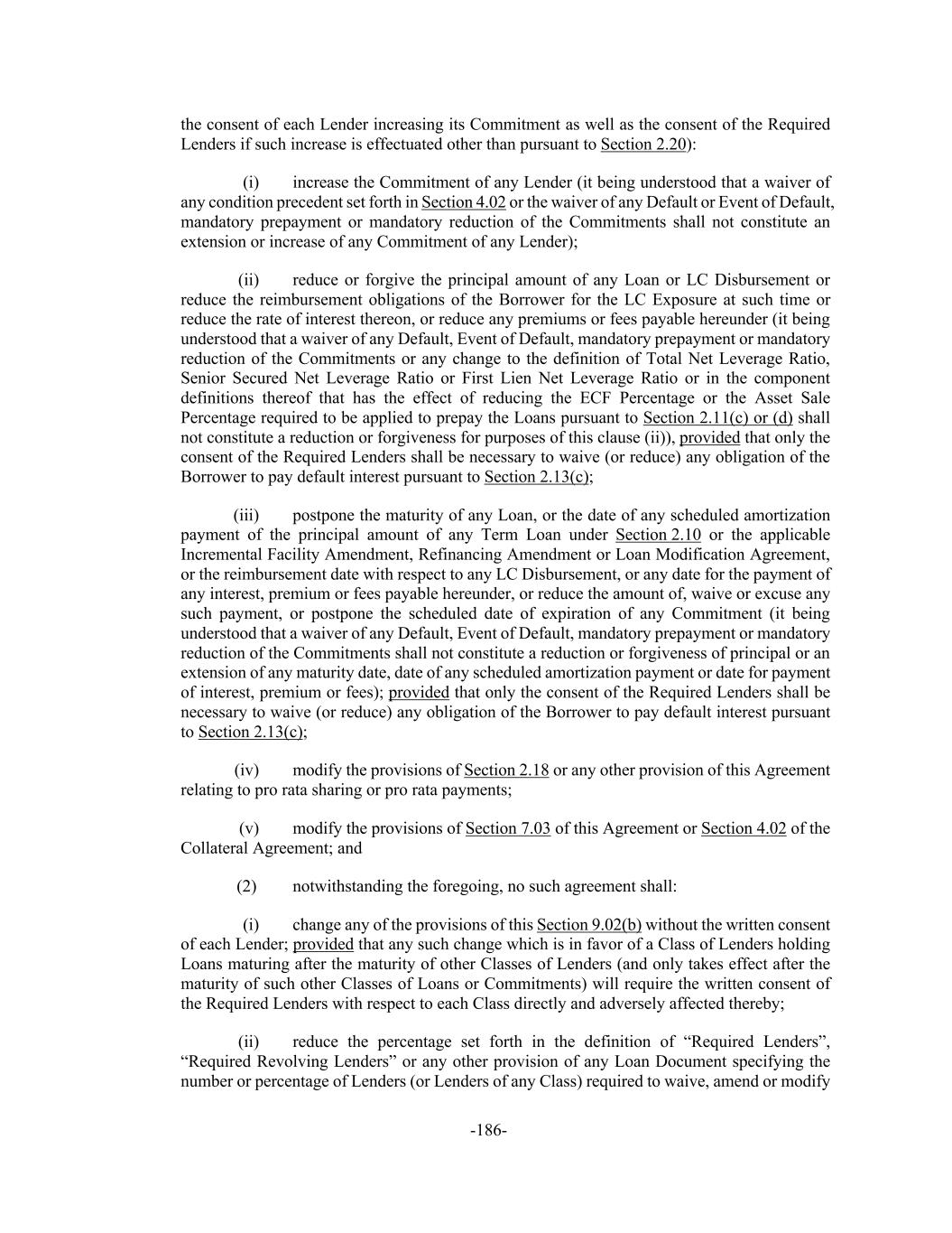 -186- the consent of each Lender increasing its Commitment as well as the consent of the Required Lenders if such increase is effectuated other than pursuant to Section 2.20): (i) increase the Commitment of any Lender (it being understood that a waiver of any condition precedent set forth in Section 4.02 or the waiver of any Default or Event of Default, mandatory prepayment or mandatory reduction of the Commitments shall not constitute an extension or increase of any Commitment of any Lender); (ii) reduce or forgive the principal amount of any Loan or LC Disbursement or reduce the reimbursement obligations of the Borrower for the LC Exposure at such time or reduce the rate of interest thereon, or reduce any premiums or fees payable hereunder (it being understood that a waiver of any Default, Event of Default, mandatory prepayment or mandatory reduction of the Commitments or any change to the definition of Total Net Leverage Ratio, Senior Secured Net Leverage Ratio or First Lien Net Leverage Ratio or in the component definitions thereof that has the effect of reducing the ECF Percentage or the Asset Sale Percentage required to be applied to prepay the Loans pursuant to Section 2.11(c) or (d) shall not constitute a reduction or forgiveness for purposes of this clause (ii)), provided that only the consent of the Required Lenders shall be necessary to waive (or reduce) any obligation of the Borrower to pay default interest pursuant to Section 2.13(c); (iii) postpone the maturity of any Loan, or the date of any scheduled amortization payment of the principal amount of any Term Loan under Section 2.10 or the applicable Incremental Facility Amendment, Refinancing Amendment or Loan Modification Agreement, or the reimbursement date with respect to any LC Disbursement, or any date for the payment of any interest, premium or fees payable hereunder, or reduce the amount of, waive or excuse any such payment, or postpone the scheduled date of expiration of any Commitment (it being understood that a waiver of any Default, Event of Default, mandatory prepayment or mandatory reduction of the Commitments shall not constitute a reduction or forgiveness of principal or an extension of any maturity date, date of any scheduled amortization payment or date for payment of interest, premium or fees); provided that only the consent of the Required Lenders shall be necessary to waive (or reduce) any obligation of the Borrower to pay default interest pursuant to Section 2.13(c); (iv) modify the provisions of Section 2.18 or any other provision of this Agreement relating to pro rata sharing or pro rata payments; (v) modify the provisions of Section 7.03 of this Agreement or Section 4.02 of the Collateral Agreement; and (2) notwithstanding the foregoing, no such agreement shall: (i) change any of the provisions of this Section 9.02(b) without the written consent of each Lender; provided that any such change which is in favor of a Class of Lenders holding Loans maturing after the maturity of other Classes of Lenders (and only takes effect after the maturity of such other Classes of Loans or Commitments) will require the written consent of the Required Lenders with respect to each Class directly and adversely affected thereby; (ii) reduce the percentage set forth in the definition of “Required Lenders”, “Required Revolving Lenders” or any other provision of any Loan Document specifying the number or percentage of Lenders (or Lenders of any Class) required to waive, amend or modify