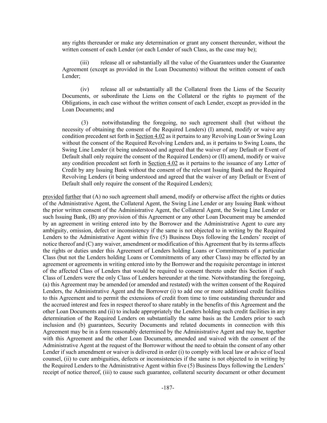 -187- any rights thereunder or make any determination or grant any consent thereunder, without the written consent of each Lender (or each Lender of such Class, as the case may be); (iii) release all or substantially all the value of the Guarantees under the Guarantee Agreement (except as provided in the Loan Documents) without the written consent of each Lender; (iv) release all or substantially all the Collateral from the Liens of the Security Documents, or subordinate the Liens on the Collateral or the rights to payment of the Obligations, in each case without the written consent of each Lender, except as provided in the Loan Documents; and (3) notwithstanding the foregoing, no such agreement shall (but without the necessity of obtaining the consent of the Required Lenders) (I) amend, modify or waive any condition precedent set forth in Section 4.02 as it pertains to any Revolving Loan or Swing Loan without the consent of the Required Revolving Lenders and, as it pertains to Swing Loans, the Swing Line Lender (it being understood and agreed that the waiver of any Default or Event of Default shall only require the consent of the Required Lenders) or (II) amend, modify or waive any condition precedent set forth in Section 4.02 as it pertains to the issuance of any Letter of Credit by any Issuing Bank without the consent of the relevant Issuing Bank and the Required Revolving Lenders (it being understood and agreed that the waiver of any Default or Event of Default shall only require the consent of the Required Lenders); provided further that (A) no such agreement shall amend, modify or otherwise affect the rights or duties of the Administrative Agent, the Collateral Agent, the Swing Line Lender or any Issuing Bank without the prior written consent of the Administrative Agent, the Collateral Agent, the Swing Line Lender or such Issuing Bank, (B) any provision of this Agreement or any other Loan Document may be amended by an agreement in writing entered into by the Borrower and the Administrative Agent to cure any ambiguity, omission, defect or inconsistency if the same is not objected to in writing by the Required Lenders to the Administrative Agent within five (5) Business Days following the Lenders’ receipt of notice thereof and (C) any waiver, amendment or modification of this Agreement that by its terms affects the rights or duties under this Agreement of Lenders holding Loans or Commitments of a particular Class (but not the Lenders holding Loans or Commitments of any other Class) may be effected by an agreement or agreements in writing entered into by the Borrower and the requisite percentage in interest of the affected Class of Lenders that would be required to consent thereto under this Section if such Class of Lenders were the only Class of Lenders hereunder at the time. Notwithstanding the foregoing, (a) this Agreement may be amended (or amended and restated) with the written consent of the Required Lenders, the Administrative Agent and the Borrower (i) to add one or more additional credit facilities to this Agreement and to permit the extensions of credit from time to time outstanding thereunder and the accrued interest and fees in respect thereof to share ratably in the benefits of this Agreement and the other Loan Documents and (ii) to include appropriately the Lenders holding such credit facilities in any determination of the Required Lenders on substantially the same basis as the Lenders prior to such inclusion and (b) guarantees, Security Documents and related documents in connection with this Agreement may be in a form reasonably determined by the Administrative Agent and may be, together with this Agreement and the other Loan Documents, amended and waived with the consent of the Administrative Agent at the request of the Borrower without the need to obtain the consent of any other Lender if such amendment or waiver is delivered in order (i) to comply with local law or advice of local counsel, (ii) to cure ambiguities, defects or inconsistencies if the same is not objected to in writing by the Required Lenders to the Administrative Agent within five (5) Business Days following the Lenders’ receipt of notice thereof, (iii) to cause such guarantee, collateral security document or other document