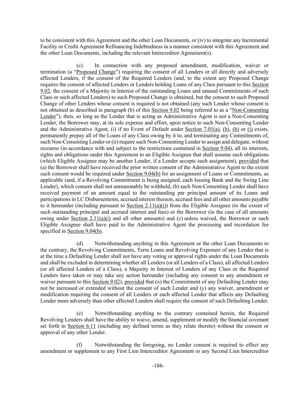 -188- to be consistent with this Agreement and the other Loan Documents, or (iv) to integrate any Incremental Facility or Credit Agreement Refinancing Indebtedness in a manner consistent with this Agreement and the other Loan Documents, including the relevant Intercreditor Agreement(s). (c) In connection with any proposed amendment, modification, waiver or termination (a “Proposed Change”) requiring the consent of all Lenders or all directly and adversely affected Lenders, if the consent of the Required Lenders (and, to the extent any Proposed Change requires the consent of affected Lenders or Lenders holding Loans of any Class pursuant to this Section 9.02, the consent of a Majority in Interest of the outstanding Loans and unused Commitments of such Class or such affected Lenders) to such Proposed Change is obtained, but the consent to such Proposed Change of other Lenders whose consent is required is not obtained (any such Lender whose consent is not obtained as described in paragraph (b) of this Section 9.02 being referred to as a “Non-Consenting Lender”), then, so long as the Lender that is acting as Administrative Agent is not a Non-Consenting Lender, the Borrower may, at its sole expense and effort, upon notice to such Non-Consenting Lender and the Administrative Agent, (i) if no Event of Default under Section 7.01(a), (b), (h) or (i) exists, permanently prepay all of the Loans of any Class owing by it to, and terminating any Commitments of, such Non-Consenting Lender or (ii) require such Non-Consenting Lender to assign and delegate, without recourse (in accordance with and subject to the restrictions contained in Section 9.04), all its interests, rights and obligations under this Agreement to an Eligible Assignee that shall assume such obligations (which Eligible Assignee may be another Lender, if a Lender accepts such assignment), provided that (a) the Borrower shall have received the prior written consent of the Administrative Agent to the extent such consent would be required under Section 9.04(b) for an assignment of Loans or Commitments, as applicable (and, if a Revolving Commitment is being assigned, each Issuing Bank and the Swing Line Lender), which consent shall not unreasonably be withheld, (b) such Non-Consenting Lender shall have received payment of an amount equal to the outstanding par principal amount of its Loans and participations in LC Disbursements, accrued interest thereon, accrued fees and all other amounts payable to it hereunder (including pursuant to Section 2.11(a)(i)) from the Eligible Assignee (to the extent of such outstanding principal and accrued interest and fees) or the Borrower (in the case of all amounts owing under Section 2.11(a)(i) and all other amounts) and (c) unless waived, the Borrower or such Eligible Assignee shall have paid to the Administrative Agent the processing and recordation fee specified in Section 9.04(b). (d) Notwithstanding anything in this Agreement or the other Loan Documents to the contrary, the Revolving Commitments, Term Loans and Revolving Exposure of any Lender that is at the time a Defaulting Lender shall not have any voting or approval rights under the Loan Documents and shall be excluded in determining whether all Lenders (or all Lenders of a Class), all affected Lenders (or all affected Lenders of a Class), a Majority in Interest of Lenders of any Class or the Required Lenders have taken or may take any action hereunder (including any consent to any amendment or waiver pursuant to this Section 9.02); provided that (x) the Commitment of any Defaulting Lender may not be increased or extended without the consent of such Lender and (y) any waiver, amendment or modification requiring the consent of all Lenders or each affected Lender that affects any Defaulting Lender more adversely than other affected Lenders shall require the consent of such Defaulting Lender. (e) Notwithstanding anything to the contrary contained herein, the Required Revolving Lenders shall have the ability to waive, amend, supplement or modify the financial covenant set forth in Section 6.11 (including any defined terms as they relate thereto) without the consent or approval of any other Lender. (f) Notwithstanding the foregoing, no Lender consent is required to effect any amendment or supplement to any First Lien Intercreditor Agreement or any Second Lien Intercreditor