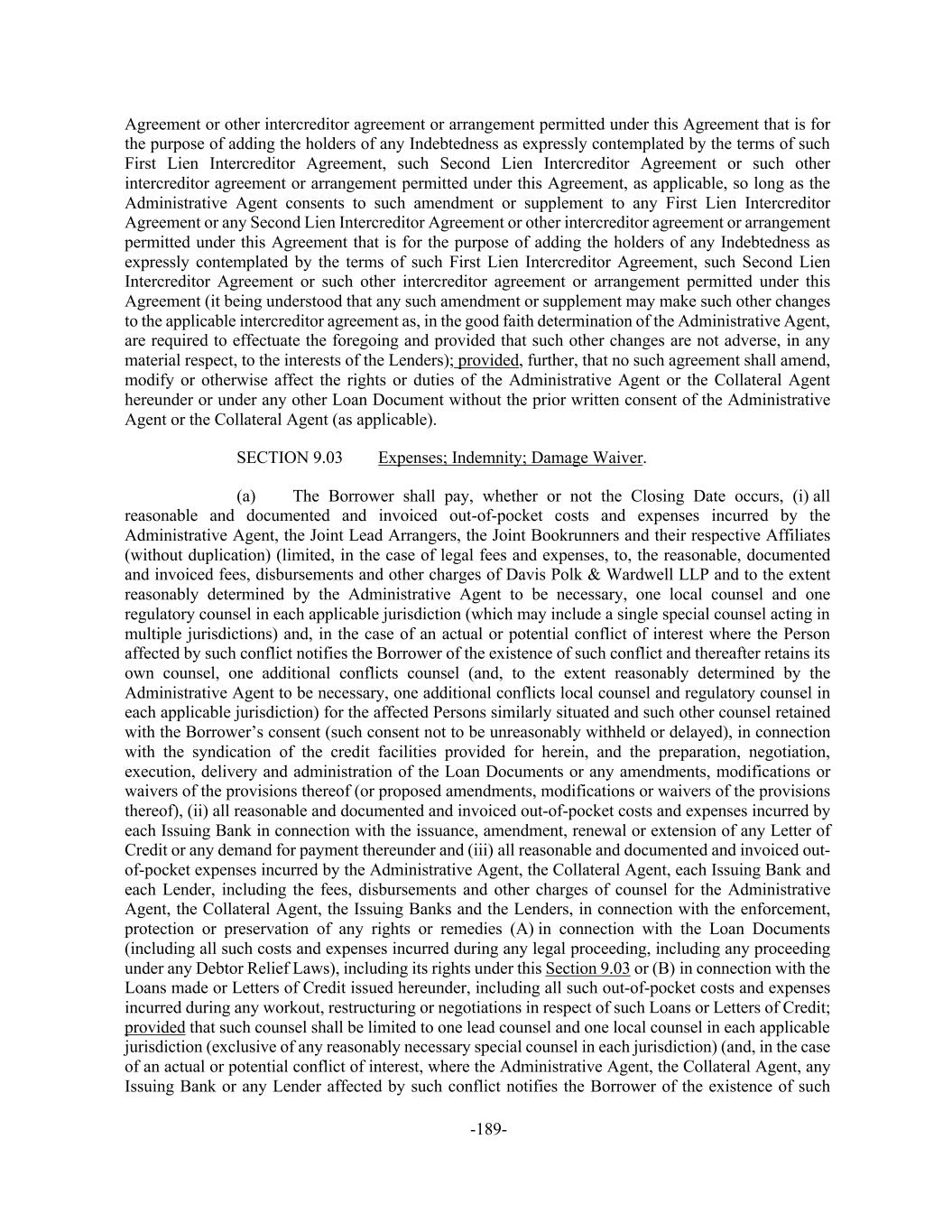-189- Agreement or other intercreditor agreement or arrangement permitted under this Agreement that is for the purpose of adding the holders of any Indebtedness as expressly contemplated by the terms of such First Lien Intercreditor Agreement, such Second Lien Intercreditor Agreement or such other intercreditor agreement or arrangement permitted under this Agreement, as applicable, so long as the Administrative Agent consents to such amendment or supplement to any First Lien Intercreditor Agreement or any Second Lien Intercreditor Agreement or other intercreditor agreement or arrangement permitted under this Agreement that is for the purpose of adding the holders of any Indebtedness as expressly contemplated by the terms of such First Lien Intercreditor Agreement, such Second Lien Intercreditor Agreement or such other intercreditor agreement or arrangement permitted under this Agreement (it being understood that any such amendment or supplement may make such other changes to the applicable intercreditor agreement as, in the good faith determination of the Administrative Agent, are required to effectuate the foregoing and provided that such other changes are not adverse, in any material respect, to the interests of the Lenders); provided, further, that no such agreement shall amend, modify or otherwise affect the rights or duties of the Administrative Agent or the Collateral Agent hereunder or under any other Loan Document without the prior written consent of the Administrative Agent or the Collateral Agent (as applicable). SECTION 9.03 Expenses; Indemnity; Damage Waiver. (a) The Borrower shall pay, whether or not the Closing Date occurs, (i) all reasonable and documented and invoiced out-of-pocket costs and expenses incurred by the Administrative Agent, the Joint Lead Arrangers, the Joint Bookrunners and their respective Affiliates (without duplication) (limited, in the case of legal fees and expenses, to, the reasonable, documented and invoiced fees, disbursements and other charges of Davis Polk & Wardwell LLP and to the extent reasonably determined by the Administrative Agent to be necessary, one local counsel and one regulatory counsel in each applicable jurisdiction (which may include a single special counsel acting in multiple jurisdictions) and, in the case of an actual or potential conflict of interest where the Person affected by such conflict notifies the Borrower of the existence of such conflict and thereafter retains its own counsel, one additional conflicts counsel (and, to the extent reasonably determined by the Administrative Agent to be necessary, one additional conflicts local counsel and regulatory counsel in each applicable jurisdiction) for the affected Persons similarly situated and such other counsel retained with the Borrower’s consent (such consent not to be unreasonably withheld or delayed), in connection with the syndication of the credit facilities provided for herein, and the preparation, negotiation, execution, delivery and administration of the Loan Documents or any amendments, modifications or waivers of the provisions thereof (or proposed amendments, modifications or waivers of the provisions thereof), (ii) all reasonable and documented and invoiced out-of-pocket costs and expenses incurred by each Issuing Bank in connection with the issuance, amendment, renewal or extension of any Letter of Credit or any demand for payment thereunder and (iii) all reasonable and documented and invoiced out- of-pocket expenses incurred by the Administrative Agent, the Collateral Agent, each Issuing Bank and each Lender, including the fees, disbursements and other charges of counsel for the Administrative Agent, the Collateral Agent, the Issuing Banks and the Lenders, in connection with the enforcement, protection or preservation of any rights or remedies (A) in connection with the Loan Documents (including all such costs and expenses incurred during any legal proceeding, including any proceeding under any Debtor Relief Laws), including its rights under this Section 9.03 or (B) in connection with the Loans made or Letters of Credit issued hereunder, including all such out-of-pocket costs and expenses incurred during any workout, restructuring or negotiations in respect of such Loans or Letters of Credit; provided that such counsel shall be limited to one lead counsel and one local counsel in each applicable jurisdiction (exclusive of any reasonably necessary special counsel in each jurisdiction) (and, in the case of an actual or potential conflict of interest, where the Administrative Agent, the Collateral Agent, any Issuing Bank or any Lender affected by such conflict notifies the Borrower of the existence of such