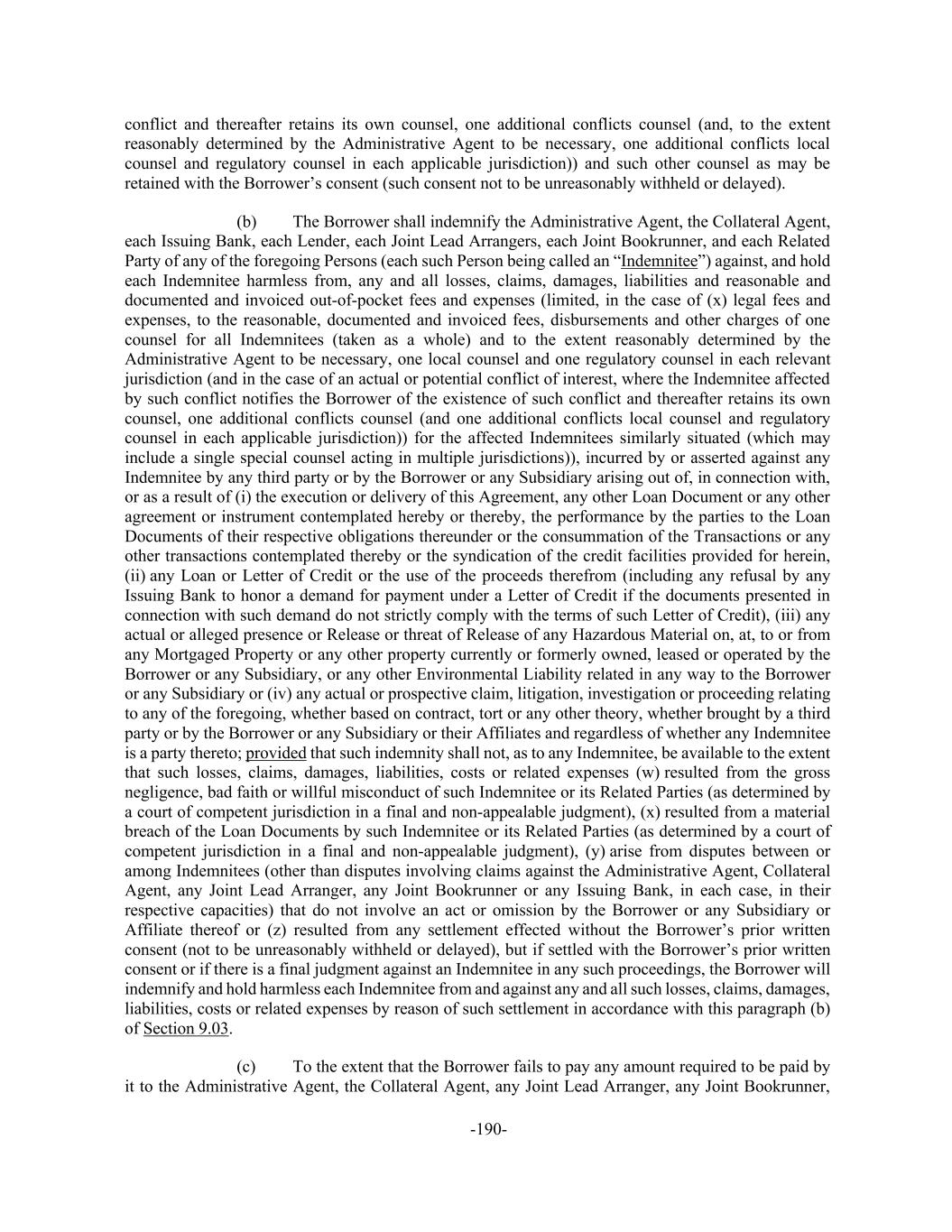 -190- conflict and thereafter retains its own counsel, one additional conflicts counsel (and, to the extent reasonably determined by the Administrative Agent to be necessary, one additional conflicts local counsel and regulatory counsel in each applicable jurisdiction)) and such other counsel as may be retained with the Borrower’s consent (such consent not to be unreasonably withheld or delayed). (b) The Borrower shall indemnify the Administrative Agent, the Collateral Agent, each Issuing Bank, each Lender, each Joint Lead Arrangers, each Joint Bookrunner, and each Related Party of any of the foregoing Persons (each such Person being called an “Indemnitee”) against, and hold each Indemnitee harmless from, any and all losses, claims, damages, liabilities and reasonable and documented and invoiced out-of-pocket fees and expenses (limited, in the case of (x) legal fees and expenses, to the reasonable, documented and invoiced fees, disbursements and other charges of one counsel for all Indemnitees (taken as a whole) and to the extent reasonably determined by the Administrative Agent to be necessary, one local counsel and one regulatory counsel in each relevant jurisdiction (and in the case of an actual or potential conflict of interest, where the Indemnitee affected by such conflict notifies the Borrower of the existence of such conflict and thereafter retains its own counsel, one additional conflicts counsel (and one additional conflicts local counsel and regulatory counsel in each applicable jurisdiction)) for the affected Indemnitees similarly situated (which may include a single special counsel acting in multiple jurisdictions)), incurred by or asserted against any Indemnitee by any third party or by the Borrower or any Subsidiary arising out of, in connection with, or as a result of (i) the execution or delivery of this Agreement, any other Loan Document or any other agreement or instrument contemplated hereby or thereby, the performance by the parties to the Loan Documents of their respective obligations thereunder or the consummation of the Transactions or any other transactions contemplated thereby or the syndication of the credit facilities provided for herein, (ii) any Loan or Letter of Credit or the use of the proceeds therefrom (including any refusal by any Issuing Bank to honor a demand for payment under a Letter of Credit if the documents presented in connection with such demand do not strictly comply with the terms of such Letter of Credit), (iii) any actual or alleged presence or Release or threat of Release of any Hazardous Material on, at, to or from any Mortgaged Property or any other property currently or formerly owned, leased or operated by the Borrower or any Subsidiary, or any other Environmental Liability related in any way to the Borrower or any Subsidiary or (iv) any actual or prospective claim, litigation, investigation or proceeding relating to any of the foregoing, whether based on contract, tort or any other theory, whether brought by a third party or by the Borrower or any Subsidiary or their Affiliates and regardless of whether any Indemnitee is a party thereto; provided that such indemnity shall not, as to any Indemnitee, be available to the extent that such losses, claims, damages, liabilities, costs or related expenses (w) resulted from the gross negligence, bad faith or willful misconduct of such Indemnitee or its Related Parties (as determined by a court of competent jurisdiction in a final and non-appealable judgment), (x) resulted from a material breach of the Loan Documents by such Indemnitee or its Related Parties (as determined by a court of competent jurisdiction in a final and non-appealable judgment), (y) arise from disputes between or among Indemnitees (other than disputes involving claims against the Administrative Agent, Collateral Agent, any Joint Lead Arranger, any Joint Bookrunner or any Issuing Bank, in each case, in their respective capacities) that do not involve an act or omission by the Borrower or any Subsidiary or Affiliate thereof or (z) resulted from any settlement effected without the Borrower’s prior written consent (not to be unreasonably withheld or delayed), but if settled with the Borrower’s prior written consent or if there is a final judgment against an Indemnitee in any such proceedings, the Borrower will indemnify and hold harmless each Indemnitee from and against any and all such losses, claims, damages, liabilities, costs or related expenses by reason of such settlement in accordance with this paragraph (b) of Section 9.03. (c) To the extent that the Borrower fails to pay any amount required to be paid by it to the Administrative Agent, the Collateral Agent, any Joint Lead Arranger, any Joint Bookrunner,