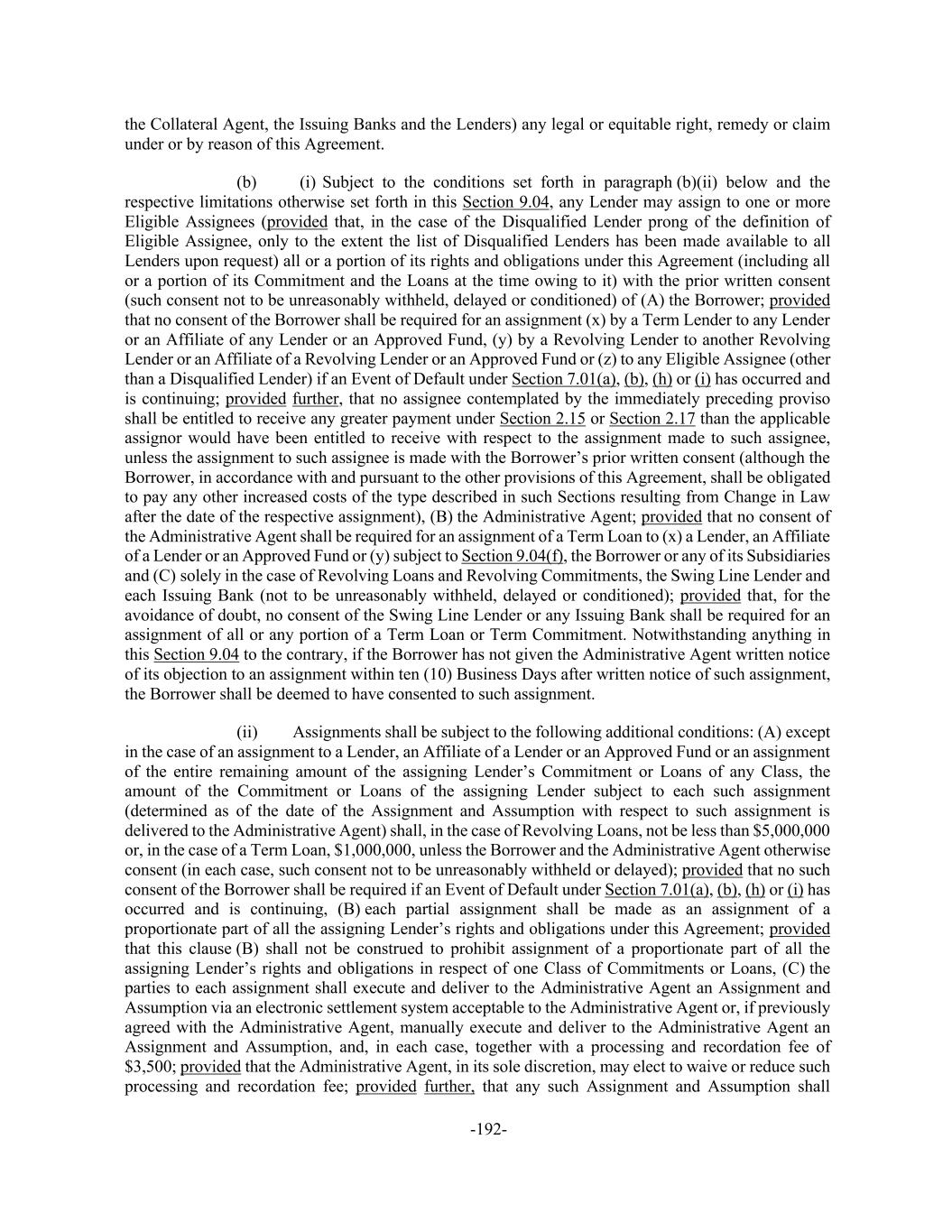 -192- the Collateral Agent, the Issuing Banks and the Lenders) any legal or equitable right, remedy or claim under or by reason of this Agreement. (b) (i) Subject to the conditions set forth in paragraph (b)(ii) below and the respective limitations otherwise set forth in this Section 9.04, any Lender may assign to one or more Eligible Assignees (provided that, in the case of the Disqualified Lender prong of the definition of Eligible Assignee, only to the extent the list of Disqualified Lenders has been made available to all Lenders upon request) all or a portion of its rights and obligations under this Agreement (including all or a portion of its Commitment and the Loans at the time owing to it) with the prior written consent (such consent not to be unreasonably withheld, delayed or conditioned) of (A) the Borrower; provided that no consent of the Borrower shall be required for an assignment (x) by a Term Lender to any Lender or an Affiliate of any Lender or an Approved Fund, (y) by a Revolving Lender to another Revolving Lender or an Affiliate of a Revolving Lender or an Approved Fund or (z) to any Eligible Assignee (other than a Disqualified Lender) if an Event of Default under Section 7.01(a), (b), (h) or (i) has occurred and is continuing; provided further, that no assignee contemplated by the immediately preceding proviso shall be entitled to receive any greater payment under Section 2.15 or Section 2.17 than the applicable assignor would have been entitled to receive with respect to the assignment made to such assignee, unless the assignment to such assignee is made with the Borrower’s prior written consent (although the Borrower, in accordance with and pursuant to the other provisions of this Agreement, shall be obligated to pay any other increased costs of the type described in such Sections resulting from Change in Law after the date of the respective assignment), (B) the Administrative Agent; provided that no consent of the Administrative Agent shall be required for an assignment of a Term Loan to (x) a Lender, an Affiliate of a Lender or an Approved Fund or (y) subject to Section 9.04(f), the Borrower or any of its Subsidiaries and (C) solely in the case of Revolving Loans and Revolving Commitments, the Swing Line Lender and each Issuing Bank (not to be unreasonably withheld, delayed or conditioned); provided that, for the avoidance of doubt, no consent of the Swing Line Lender or any Issuing Bank shall be required for an assignment of all or any portion of a Term Loan or Term Commitment. Notwithstanding anything in this Section 9.04 to the contrary, if the Borrower has not given the Administrative Agent written notice of its objection to an assignment within ten (10) Business Days after written notice of such assignment, the Borrower shall be deemed to have consented to such assignment. (ii) Assignments shall be subject to the following additional conditions: (A) except in the case of an assignment to a Lender, an Affiliate of a Lender or an Approved Fund or an assignment of the entire remaining amount of the assigning Lender’s Commitment or Loans of any Class, the amount of the Commitment or Loans of the assigning Lender subject to each such assignment (determined as of the date of the Assignment and Assumption with respect to such assignment is delivered to the Administrative Agent) shall, in the case of Revolving Loans, not be less than $5,000,000 or, in the case of a Term Loan, $1,000,000, unless the Borrower and the Administrative Agent otherwise consent (in each case, such consent not to be unreasonably withheld or delayed); provided that no such consent of the Borrower shall be required if an Event of Default under Section 7.01(a), (b), (h) or (i) has occurred and is continuing, (B) each partial assignment shall be made as an assignment of a proportionate part of all the assigning Lender’s rights and obligations under this Agreement; provided that this clause (B) shall not be construed to prohibit assignment of a proportionate part of all the assigning Lender’s rights and obligations in respect of one Class of Commitments or Loans, (C) the parties to each assignment shall execute and deliver to the Administrative Agent an Assignment and Assumption via an electronic settlement system acceptable to the Administrative Agent or, if previously agreed with the Administrative Agent, manually execute and deliver to the Administrative Agent an Assignment and Assumption, and, in each case, together with a processing and recordation fee of $3,500; provided that the Administrative Agent, in its sole discretion, may elect to waive or reduce such processing and recordation fee; provided further, that any such Assignment and Assumption shall