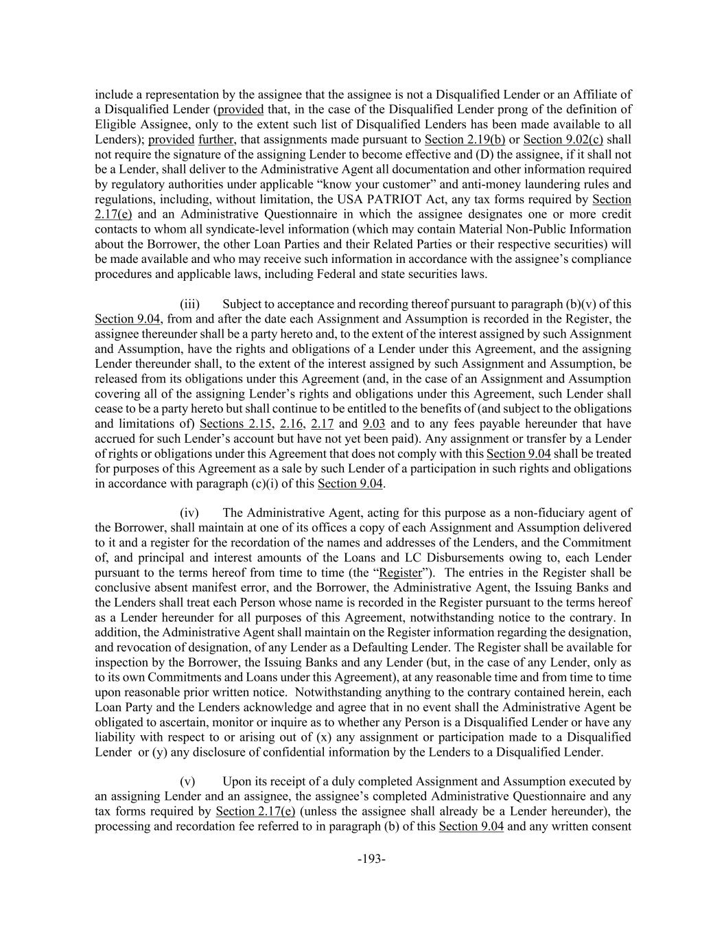 -193- include a representation by the assignee that the assignee is not a Disqualified Lender or an Affiliate of a Disqualified Lender (provided that, in the case of the Disqualified Lender prong of the definition of Eligible Assignee, only to the extent such list of Disqualified Lenders has been made available to all Lenders); provided further, that assignments made pursuant to Section 2.19(b) or Section 9.02(c) shall not require the signature of the assigning Lender to become effective and (D) the assignee, if it shall not be a Lender, shall deliver to the Administrative Agent all documentation and other information required by regulatory authorities under applicable “know your customer” and anti-money laundering rules and regulations, including, without limitation, the USA PATRIOT Act, any tax forms required by Section 2.17(e) and an Administrative Questionnaire in which the assignee designates one or more credit contacts to whom all syndicate-level information (which may contain Material Non-Public Information about the Borrower, the other Loan Parties and their Related Parties or their respective securities) will be made available and who may receive such information in accordance with the assignee’s compliance procedures and applicable laws, including Federal and state securities laws. (iii) Subject to acceptance and recording thereof pursuant to paragraph (b)(v) of this Section 9.04, from and after the date each Assignment and Assumption is recorded in the Register, the assignee thereunder shall be a party hereto and, to the extent of the interest assigned by such Assignment and Assumption, have the rights and obligations of a Lender under this Agreement, and the assigning Lender thereunder shall, to the extent of the interest assigned by such Assignment and Assumption, be released from its obligations under this Agreement (and, in the case of an Assignment and Assumption covering all of the assigning Lender’s rights and obligations under this Agreement, such Lender shall cease to be a party hereto but shall continue to be entitled to the benefits of (and subject to the obligations and limitations of) Sections 2.15, 2.16, 2.17 and 9.03 and to any fees payable hereunder that have accrued for such Lender’s account but have not yet been paid). Any assignment or transfer by a Lender of rights or obligations under this Agreement that does not comply with this Section 9.04 shall be treated for purposes of this Agreement as a sale by such Lender of a participation in such rights and obligations in accordance with paragraph (c)(i) of this Section 9.04. (iv) The Administrative Agent, acting for this purpose as a non-fiduciary agent of the Borrower, shall maintain at one of its offices a copy of each Assignment and Assumption delivered to it and a register for the recordation of the names and addresses of the Lenders, and the Commitment of, and principal and interest amounts of the Loans and LC Disbursements owing to, each Lender pursuant to the terms hereof from time to time (the “Register”). The entries in the Register shall be conclusive absent manifest error, and the Borrower, the Administrative Agent, the Issuing Banks and the Lenders shall treat each Person whose name is recorded in the Register pursuant to the terms hereof as a Lender hereunder for all purposes of this Agreement, notwithstanding notice to the contrary. In addition, the Administrative Agent shall maintain on the Register information regarding the designation, and revocation of designation, of any Lender as a Defaulting Lender. The Register shall be available for inspection by the Borrower, the Issuing Banks and any Lender (but, in the case of any Lender, only as to its own Commitments and Loans under this Agreement), at any reasonable time and from time to time upon reasonable prior written notice. Notwithstanding anything to the contrary contained herein, each Loan Party and the Lenders acknowledge and agree that in no event shall the Administrative Agent be obligated to ascertain, monitor or inquire as to whether any Person is a Disqualified Lender or have any liability with respect to or arising out of (x) any assignment or participation made to a Disqualified Lender or (y) any disclosure of confidential information by the Lenders to a Disqualified Lender. (v) Upon its receipt of a duly completed Assignment and Assumption executed by an assigning Lender and an assignee, the assignee’s completed Administrative Questionnaire and any tax forms required by Section 2.17(e) (unless the assignee shall already be a Lender hereunder), the processing and recordation fee referred to in paragraph (b) of this Section 9.04 and any written consent