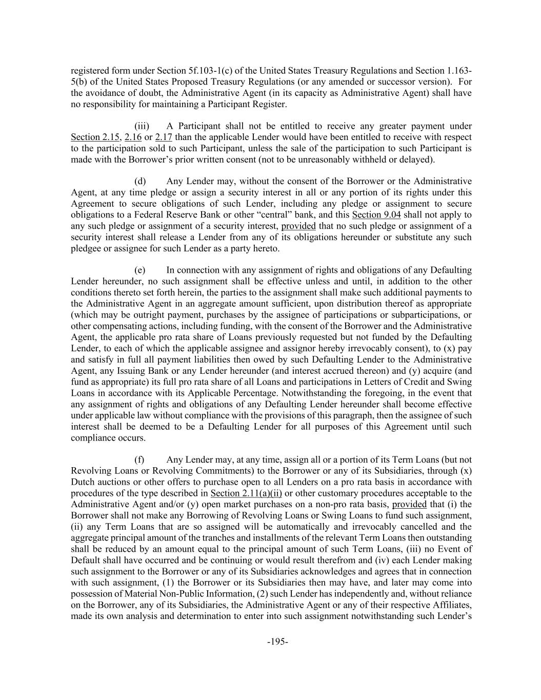 -195- registered form under Section 5f.103-1(c) of the United States Treasury Regulations and Section 1.163- 5(b) of the United States Proposed Treasury Regulations (or any amended or successor version). For the avoidance of doubt, the Administrative Agent (in its capacity as Administrative Agent) shall have no responsibility for maintaining a Participant Register. (iii) A Participant shall not be entitled to receive any greater payment under Section 2.15, 2.16 or 2.17 than the applicable Lender would have been entitled to receive with respect to the participation sold to such Participant, unless the sale of the participation to such Participant is made with the Borrower’s prior written consent (not to be unreasonably withheld or delayed). (d) Any Lender may, without the consent of the Borrower or the Administrative Agent, at any time pledge or assign a security interest in all or any portion of its rights under this Agreement to secure obligations of such Lender, including any pledge or assignment to secure obligations to a Federal Reserve Bank or other “central” bank, and this Section 9.04 shall not apply to any such pledge or assignment of a security interest, provided that no such pledge or assignment of a security interest shall release a Lender from any of its obligations hereunder or substitute any such pledgee or assignee for such Lender as a party hereto. (e) In connection with any assignment of rights and obligations of any Defaulting Lender hereunder, no such assignment shall be effective unless and until, in addition to the other conditions thereto set forth herein, the parties to the assignment shall make such additional payments to the Administrative Agent in an aggregate amount sufficient, upon distribution thereof as appropriate (which may be outright payment, purchases by the assignee of participations or subparticipations, or other compensating actions, including funding, with the consent of the Borrower and the Administrative Agent, the applicable pro rata share of Loans previously requested but not funded by the Defaulting Lender, to each of which the applicable assignee and assignor hereby irrevocably consent), to (x) pay and satisfy in full all payment liabilities then owed by such Defaulting Lender to the Administrative Agent, any Issuing Bank or any Lender hereunder (and interest accrued thereon) and (y) acquire (and fund as appropriate) its full pro rata share of all Loans and participations in Letters of Credit and Swing Loans in accordance with its Applicable Percentage. Notwithstanding the foregoing, in the event that any assignment of rights and obligations of any Defaulting Lender hereunder shall become effective under applicable law without compliance with the provisions of this paragraph, then the assignee of such interest shall be deemed to be a Defaulting Lender for all purposes of this Agreement until such compliance occurs. (f) Any Lender may, at any time, assign all or a portion of its Term Loans (but not Revolving Loans or Revolving Commitments) to the Borrower or any of its Subsidiaries, through (x) Dutch auctions or other offers to purchase open to all Lenders on a pro rata basis in accordance with procedures of the type described in Section 2.11(a)(ii) or other customary procedures acceptable to the Administrative Agent and/or (y) open market purchases on a non-pro rata basis, provided that (i) the Borrower shall not make any Borrowing of Revolving Loans or Swing Loans to fund such assignment, (ii) any Term Loans that are so assigned will be automatically and irrevocably cancelled and the aggregate principal amount of the tranches and installments of the relevant Term Loans then outstanding shall be reduced by an amount equal to the principal amount of such Term Loans, (iii) no Event of Default shall have occurred and be continuing or would result therefrom and (iv) each Lender making such assignment to the Borrower or any of its Subsidiaries acknowledges and agrees that in connection with such assignment, (1) the Borrower or its Subsidiaries then may have, and later may come into possession of Material Non-Public Information, (2) such Lender has independently and, without reliance on the Borrower, any of its Subsidiaries, the Administrative Agent or any of their respective Affiliates, made its own analysis and determination to enter into such assignment notwithstanding such Lender’s