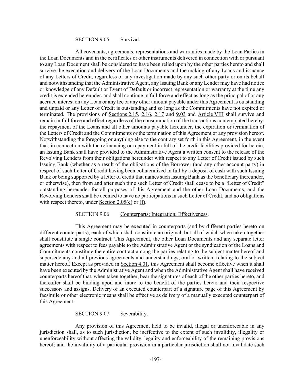 -197- SECTION 9.05 Survival. All covenants, agreements, representations and warranties made by the Loan Parties in the Loan Documents and in the certificates or other instruments delivered in connection with or pursuant to any Loan Document shall be considered to have been relied upon by the other parties hereto and shall survive the execution and delivery of the Loan Documents and the making of any Loans and issuance of any Letters of Credit, regardless of any investigation made by any such other party or on its behalf and notwithstanding that the Administrative Agent, any Issuing Bank or any Lender may have had notice or knowledge of any Default or Event of Default or incorrect representation or warranty at the time any credit is extended hereunder, and shall continue in full force and effect as long as the principal of or any accrued interest on any Loan or any fee or any other amount payable under this Agreement is outstanding and unpaid or any Letter of Credit is outstanding and so long as the Commitments have not expired or terminated. The provisions of Sections 2.15, 2.16, 2.17 and 9.03 and Article VIII shall survive and remain in full force and effect regardless of the consummation of the transactions contemplated hereby, the repayment of the Loans and all other amounts payable hereunder, the expiration or termination of the Letters of Credit and the Commitments or the termination of this Agreement or any provision hereof. Notwithstanding the foregoing or anything else to the contrary set forth in this Agreement, in the event that, in connection with the refinancing or repayment in full of the credit facilities provided for herein, an Issuing Bank shall have provided to the Administrative Agent a written consent to the release of the Revolving Lenders from their obligations hereunder with respect to any Letter of Credit issued by such Issuing Bank (whether as a result of the obligations of the Borrower (and any other account party) in respect of such Letter of Credit having been collateralized in full by a deposit of cash with such Issuing Bank or being supported by a letter of credit that names such Issuing Bank as the beneficiary thereunder, or otherwise), then from and after such time such Letter of Credit shall cease to be a “Letter of Credit” outstanding hereunder for all purposes of this Agreement and the other Loan Documents, and the Revolving Lenders shall be deemed to have no participations in such Letter of Credit, and no obligations with respect thereto, under Section 2.05(e) or (f). SECTION 9.06 Counterparts; Integration; Effectiveness. This Agreement may be executed in counterparts (and by different parties hereto on different counterparts), each of which shall constitute an original, but all of which when taken together shall constitute a single contract. This Agreement, the other Loan Documents and any separate letter agreements with respect to fees payable to the Administrative Agent or the syndication of the Loans and Commitments constitute the entire contract among the parties relating to the subject matter hereof and supersede any and all previous agreements and understandings, oral or written, relating to the subject matter hereof. Except as provided in Section 4.01, this Agreement shall become effective when it shall have been executed by the Administrative Agent and when the Administrative Agent shall have received counterparts hereof that, when taken together, bear the signatures of each of the other parties hereto, and thereafter shall be binding upon and inure to the benefit of the parties hereto and their respective successors and assigns. Delivery of an executed counterpart of a signature page of this Agreement by facsimile or other electronic means shall be effective as delivery of a manually executed counterpart of this Agreement. SECTION 9.07 Severability. Any provision of this Agreement held to be invalid, illegal or unenforceable in any jurisdiction shall, as to such jurisdiction, be ineffective to the extent of such invalidity, illegality or unenforceability without affecting the validity, legality and enforceability of the remaining provisions hereof; and the invalidity of a particular provision in a particular jurisdiction shall not invalidate such