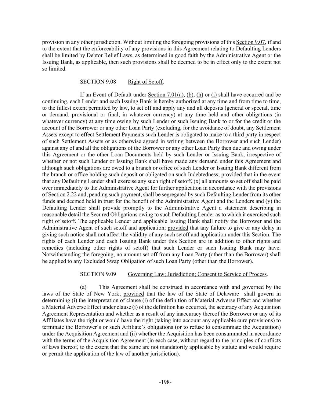 -198- provision in any other jurisdiction. Without limiting the foregoing provisions of this Section 9.07, if and to the extent that the enforceability of any provisions in this Agreement relating to Defaulting Lenders shall be limited by Debtor Relief Laws, as determined in good faith by the Administrative Agent or the Issuing Bank, as applicable, then such provisions shall be deemed to be in effect only to the extent not so limited. SECTION 9.08 Right of Setoff. If an Event of Default under Section 7.01(a), (b), (h) or (i) shall have occurred and be continuing, each Lender and each Issuing Bank is hereby authorized at any time and from time to time, to the fullest extent permitted by law, to set off and apply any and all deposits (general or special, time or demand, provisional or final, in whatever currency) at any time held and other obligations (in whatever currency) at any time owing by such Lender or such Issuing Bank to or for the credit or the account of the Borrower or any other Loan Party (excluding, for the avoidance of doubt, any Settlement Assets except to effect Settlement Payments such Lender is obligated to make to a third party in respect of such Settlement Assets or as otherwise agreed in writing between the Borrower and such Lender) against any of and all the obligations of the Borrower or any other Loan Party then due and owing under this Agreement or the other Loan Documents held by such Lender or Issuing Bank, irrespective of whether or not such Lender or Issuing Bank shall have made any demand under this Agreement and although such obligations are owed to a branch or office of such Lender or Issuing Bank different from the branch or office holding such deposit or obligated on such Indebtedness; provided that in the event that any Defaulting Lender shall exercise any such right of setoff, (x) all amounts so set off shall be paid over immediately to the Administrative Agent for further application in accordance with the provisions of Section 2.22 and, pending such payment, shall be segregated by such Defaulting Lender from its other funds and deemed held in trust for the benefit of the Administrative Agent and the Lenders and (y) the Defaulting Lender shall provide promptly to the Administrative Agent a statement describing in reasonable detail the Secured Obligations owing to such Defaulting Lender as to which it exercised such right of setoff. The applicable Lender and applicable Issuing Bank shall notify the Borrower and the Administrative Agent of such setoff and application; provided that any failure to give or any delay in giving such notice shall not affect the validity of any such setoff and application under this Section. The rights of each Lender and each Issuing Bank under this Section are in addition to other rights and remedies (including other rights of setoff) that such Lender or such Issuing Bank may have. Notwithstanding the foregoing, no amount set off from any Loan Party (other than the Borrower) shall be applied to any Excluded Swap Obligation of such Loan Party (other than the Borrower). SECTION 9.09 Governing Law; Jurisdiction; Consent to Service of Process. (a) This Agreement shall be construed in accordance with and governed by the laws of the State of New York; provided that the law of the State of Delaware shall govern in determining (i) the interpretation of clause (i) of the definition of Material Adverse Effect and whether a Material Adverse Effect under clause (i) of the definition has occurred, the accuracy of any Acquisition Agreement Representation and whether as a result of any inaccuracy thereof the Borrower or any of its Affiliates have the right or would have the right (taking into account any applicable cure provisions) to terminate the Borrower’s or such Affiliate’s obligations (or to refuse to consummate the Acquisition) under the Acquisition Agreement and (ii) whether the Acquisition has been consummated in accordance with the terms of the Acquisition Agreement (in each case, without regard to the principles of conflicts of laws thereof, to the extent that the same are not mandatorily applicable by statute and would require or permit the application of the law of another jurisdiction).