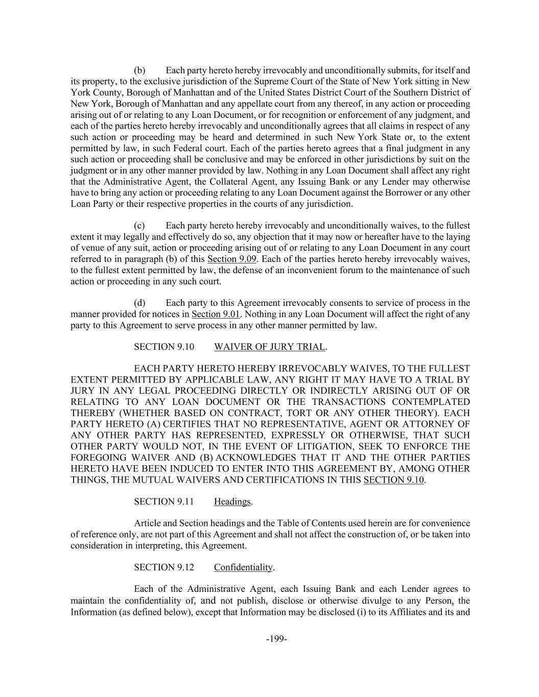 -199- (b) Each party hereto hereby irrevocably and unconditionally submits, for itself and its property, to the exclusive jurisdiction of the Supreme Court of the State of New York sitting in New York County, Borough of Manhattan and of the United States District Court of the Southern District of New York, Borough of Manhattan and any appellate court from any thereof, in any action or proceeding arising out of or relating to any Loan Document, or for recognition or enforcement of any judgment, and each of the parties hereto hereby irrevocably and unconditionally agrees that all claims in respect of any such action or proceeding may be heard and determined in such New York State or, to the extent permitted by law, in such Federal court. Each of the parties hereto agrees that a final judgment in any such action or proceeding shall be conclusive and may be enforced in other jurisdictions by suit on the judgment or in any other manner provided by law. Nothing in any Loan Document shall affect any right that the Administrative Agent, the Collateral Agent, any Issuing Bank or any Lender may otherwise have to bring any action or proceeding relating to any Loan Document against the Borrower or any other Loan Party or their respective properties in the courts of any jurisdiction. (c) Each party hereto hereby irrevocably and unconditionally waives, to the fullest extent it may legally and effectively do so, any objection that it may now or hereafter have to the laying of venue of any suit, action or proceeding arising out of or relating to any Loan Document in any court referred to in paragraph (b) of this Section 9.09. Each of the parties hereto hereby irrevocably waives, to the fullest extent permitted by law, the defense of an inconvenient forum to the maintenance of such action or proceeding in any such court. (d) Each party to this Agreement irrevocably consents to service of process in the manner provided for notices in Section 9.01. Nothing in any Loan Document will affect the right of any party to this Agreement to serve process in any other manner permitted by law. SECTION 9.10 WAIVER OF JURY TRIAL. EACH PARTY HERETO HEREBY IRREVOCABLY WAIVES, TO THE FULLEST EXTENT PERMITTED BY APPLICABLE LAW, ANY RIGHT IT MAY HAVE TO A TRIAL BY JURY IN ANY LEGAL PROCEEDING DIRECTLY OR INDIRECTLY ARISING OUT OF OR RELATING TO ANY LOAN DOCUMENT OR THE TRANSACTIONS CONTEMPLATED THEREBY (WHETHER BASED ON CONTRACT, TORT OR ANY OTHER THEORY). EACH PARTY HERETO (A) CERTIFIES THAT NO REPRESENTATIVE, AGENT OR ATTORNEY OF ANY OTHER PARTY HAS REPRESENTED, EXPRESSLY OR OTHERWISE, THAT SUCH OTHER PARTY WOULD NOT, IN THE EVENT OF LITIGATION, SEEK TO ENFORCE THE FOREGOING WAIVER AND (B) ACKNOWLEDGES THAT IT AND THE OTHER PARTIES HERETO HAVE BEEN INDUCED TO ENTER INTO THIS AGREEMENT BY, AMONG OTHER THINGS, THE MUTUAL WAIVERS AND CERTIFICATIONS IN THIS SECTION 9.10. SECTION 9.11 Headings. Article and Section headings and the Table of Contents used herein are for convenience of reference only, are not part of this Agreement and shall not affect the construction of, or be taken into consideration in interpreting, this Agreement. SECTION 9.12 Confidentiality. Each of the Administrative Agent, each Issuing Bank and each Lender agrees to maintain the confidentiality of, and not publish, disclose or otherwise divulge to any Person, the Information (as defined below), except that Information may be disclosed (i) to its Affiliates and its and