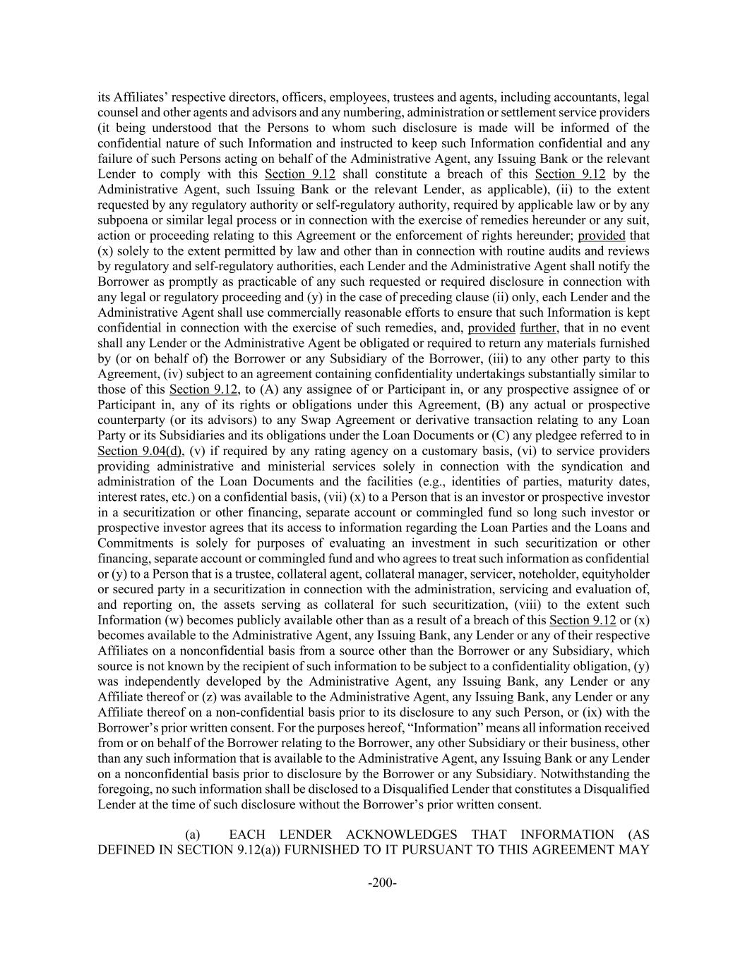 -200- its Affiliates’ respective directors, officers, employees, trustees and agents, including accountants, legal counsel and other agents and advisors and any numbering, administration or settlement service providers (it being understood that the Persons to whom such disclosure is made will be informed of the confidential nature of such Information and instructed to keep such Information confidential and any failure of such Persons acting on behalf of the Administrative Agent, any Issuing Bank or the relevant Lender to comply with this Section 9.12 shall constitute a breach of this Section 9.12 by the Administrative Agent, such Issuing Bank or the relevant Lender, as applicable), (ii) to the extent requested by any regulatory authority or self-regulatory authority, required by applicable law or by any subpoena or similar legal process or in connection with the exercise of remedies hereunder or any suit, action or proceeding relating to this Agreement or the enforcement of rights hereunder; provided that (x) solely to the extent permitted by law and other than in connection with routine audits and reviews by regulatory and self-regulatory authorities, each Lender and the Administrative Agent shall notify the Borrower as promptly as practicable of any such requested or required disclosure in connection with any legal or regulatory proceeding and (y) in the case of preceding clause (ii) only, each Lender and the Administrative Agent shall use commercially reasonable efforts to ensure that such Information is kept confidential in connection with the exercise of such remedies, and, provided further, that in no event shall any Lender or the Administrative Agent be obligated or required to return any materials furnished by (or on behalf of) the Borrower or any Subsidiary of the Borrower, (iii) to any other party to this Agreement, (iv) subject to an agreement containing confidentiality undertakings substantially similar to those of this Section 9.12, to (A) any assignee of or Participant in, or any prospective assignee of or Participant in, any of its rights or obligations under this Agreement, (B) any actual or prospective counterparty (or its advisors) to any Swap Agreement or derivative transaction relating to any Loan Party or its Subsidiaries and its obligations under the Loan Documents or (C) any pledgee referred to in Section 9.04(d), (v) if required by any rating agency on a customary basis, (vi) to service providers providing administrative and ministerial services solely in connection with the syndication and administration of the Loan Documents and the facilities (e.g., identities of parties, maturity dates, interest rates, etc.) on a confidential basis, (vii) (x) to a Person that is an investor or prospective investor in a securitization or other financing, separate account or commingled fund so long such investor or prospective investor agrees that its access to information regarding the Loan Parties and the Loans and Commitments is solely for purposes of evaluating an investment in such securitization or other financing, separate account or commingled fund and who agrees to treat such information as confidential or (y) to a Person that is a trustee, collateral agent, collateral manager, servicer, noteholder, equityholder or secured party in a securitization in connection with the administration, servicing and evaluation of, and reporting on, the assets serving as collateral for such securitization, (viii) to the extent such Information (w) becomes publicly available other than as a result of a breach of this Section 9.12 or (x) becomes available to the Administrative Agent, any Issuing Bank, any Lender or any of their respective Affiliates on a nonconfidential basis from a source other than the Borrower or any Subsidiary, which source is not known by the recipient of such information to be subject to a confidentiality obligation, (y) was independently developed by the Administrative Agent, any Issuing Bank, any Lender or any Affiliate thereof or (z) was available to the Administrative Agent, any Issuing Bank, any Lender or any Affiliate thereof on a non-confidential basis prior to its disclosure to any such Person, or (ix) with the Borrower’s prior written consent. For the purposes hereof, “Information” means all information received from or on behalf of the Borrower relating to the Borrower, any other Subsidiary or their business, other than any such information that is available to the Administrative Agent, any Issuing Bank or any Lender on a nonconfidential basis prior to disclosure by the Borrower or any Subsidiary. Notwithstanding the foregoing, no such information shall be disclosed to a Disqualified Lender that constitutes a Disqualified Lender at the time of such disclosure without the Borrower’s prior written consent. (a) EACH LENDER ACKNOWLEDGES THAT INFORMATION (AS DEFINED IN SECTION 9.12(a)) FURNISHED TO IT PURSUANT TO THIS AGREEMENT MAY