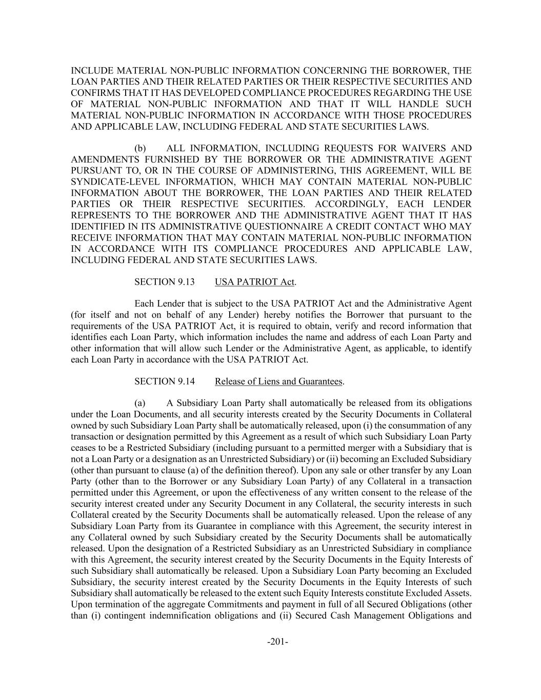 -201- INCLUDE MATERIAL NON-PUBLIC INFORMATION CONCERNING THE BORROWER, THE LOAN PARTIES AND THEIR RELATED PARTIES OR THEIR RESPECTIVE SECURITIES AND CONFIRMS THAT IT HAS DEVELOPED COMPLIANCE PROCEDURES REGARDING THE USE OF MATERIAL NON-PUBLIC INFORMATION AND THAT IT WILL HANDLE SUCH MATERIAL NON-PUBLIC INFORMATION IN ACCORDANCE WITH THOSE PROCEDURES AND APPLICABLE LAW, INCLUDING FEDERAL AND STATE SECURITIES LAWS. (b) ALL INFORMATION, INCLUDING REQUESTS FOR WAIVERS AND AMENDMENTS FURNISHED BY THE BORROWER OR THE ADMINISTRATIVE AGENT PURSUANT TO, OR IN THE COURSE OF ADMINISTERING, THIS AGREEMENT, WILL BE SYNDICATE-LEVEL INFORMATION, WHICH MAY CONTAIN MATERIAL NON-PUBLIC INFORMATION ABOUT THE BORROWER, THE LOAN PARTIES AND THEIR RELATED PARTIES OR THEIR RESPECTIVE SECURITIES. ACCORDINGLY, EACH LENDER REPRESENTS TO THE BORROWER AND THE ADMINISTRATIVE AGENT THAT IT HAS IDENTIFIED IN ITS ADMINISTRATIVE QUESTIONNAIRE A CREDIT CONTACT WHO MAY RECEIVE INFORMATION THAT MAY CONTAIN MATERIAL NON-PUBLIC INFORMATION IN ACCORDANCE WITH ITS COMPLIANCE PROCEDURES AND APPLICABLE LAW, INCLUDING FEDERAL AND STATE SECURITIES LAWS. SECTION 9.13 USA PATRIOT Act. Each Lender that is subject to the USA PATRIOT Act and the Administrative Agent (for itself and not on behalf of any Lender) hereby notifies the Borrower that pursuant to the requirements of the USA PATRIOT Act, it is required to obtain, verify and record information that identifies each Loan Party, which information includes the name and address of each Loan Party and other information that will allow such Lender or the Administrative Agent, as applicable, to identify each Loan Party in accordance with the USA PATRIOT Act. SECTION 9.14 Release of Liens and Guarantees. (a) A Subsidiary Loan Party shall automatically be released from its obligations under the Loan Documents, and all security interests created by the Security Documents in Collateral owned by such Subsidiary Loan Party shall be automatically released, upon (i) the consummation of any transaction or designation permitted by this Agreement as a result of which such Subsidiary Loan Party ceases to be a Restricted Subsidiary (including pursuant to a permitted merger with a Subsidiary that is not a Loan Party or a designation as an Unrestricted Subsidiary) or (ii) becoming an Excluded Subsidiary (other than pursuant to clause (a) of the definition thereof). Upon any sale or other transfer by any Loan Party (other than to the Borrower or any Subsidiary Loan Party) of any Collateral in a transaction permitted under this Agreement, or upon the effectiveness of any written consent to the release of the security interest created under any Security Document in any Collateral, the security interests in such Collateral created by the Security Documents shall be automatically released. Upon the release of any Subsidiary Loan Party from its Guarantee in compliance with this Agreement, the security interest in any Collateral owned by such Subsidiary created by the Security Documents shall be automatically released. Upon the designation of a Restricted Subsidiary as an Unrestricted Subsidiary in compliance with this Agreement, the security interest created by the Security Documents in the Equity Interests of such Subsidiary shall automatically be released. Upon a Subsidiary Loan Party becoming an Excluded Subsidiary, the security interest created by the Security Documents in the Equity Interests of such Subsidiary shall automatically be released to the extent such Equity Interests constitute Excluded Assets. Upon termination of the aggregate Commitments and payment in full of all Secured Obligations (other than (i) contingent indemnification obligations and (ii) Secured Cash Management Obligations and