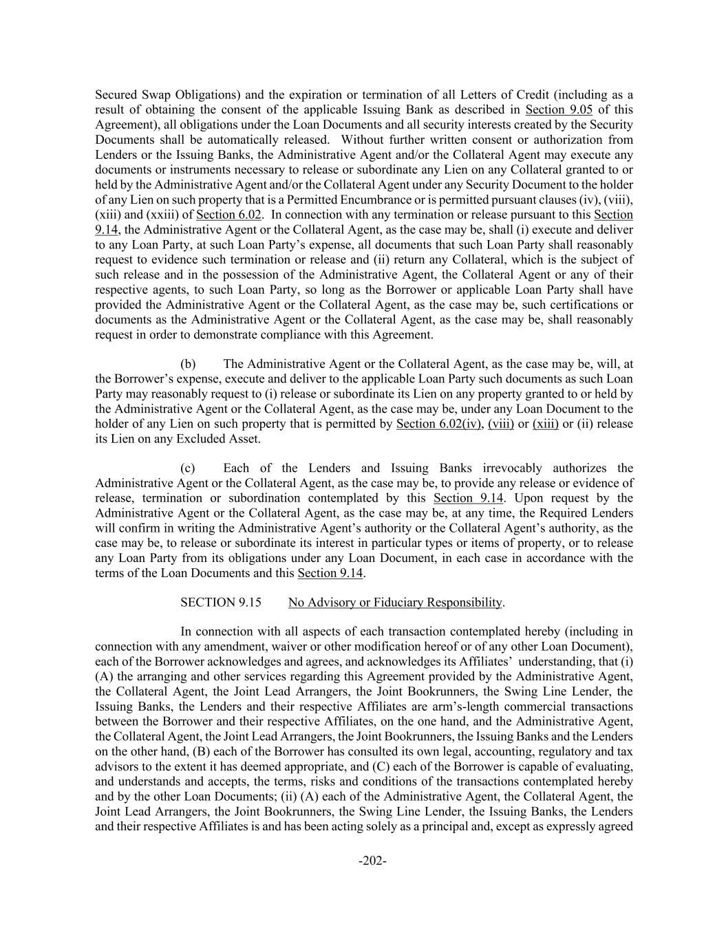 -202- Secured Swap Obligations) and the expiration or termination of all Letters of Credit (including as a result of obtaining the consent of the applicable Issuing Bank as described in Section 9.05 of this Agreement), all obligations under the Loan Documents and all security interests created by the Security Documents shall be automatically released. Without further written consent or authorization from Lenders or the Issuing Banks, the Administrative Agent and/or the Collateral Agent may execute any documents or instruments necessary to release or subordinate any Lien on any Collateral granted to or held by the Administrative Agent and/or the Collateral Agent under any Security Document to the holder of any Lien on such property that is a Permitted Encumbrance or is permitted pursuant clauses (iv), (viii), (xiii) and (xxiii) of Section 6.02. In connection with any termination or release pursuant to this Section 9.14, the Administrative Agent or the Collateral Agent, as the case may be, shall (i) execute and deliver to any Loan Party, at such Loan Party’s expense, all documents that such Loan Party shall reasonably request to evidence such termination or release and (ii) return any Collateral, which is the subject of such release and in the possession of the Administrative Agent, the Collateral Agent or any of their respective agents, to such Loan Party, so long as the Borrower or applicable Loan Party shall have provided the Administrative Agent or the Collateral Agent, as the case may be, such certifications or documents as the Administrative Agent or the Collateral Agent, as the case may be, shall reasonably request in order to demonstrate compliance with this Agreement. (b) The Administrative Agent or the Collateral Agent, as the case may be, will, at the Borrower’s expense, execute and deliver to the applicable Loan Party such documents as such Loan Party may reasonably request to (i) release or subordinate its Lien on any property granted to or held by the Administrative Agent or the Collateral Agent, as the case may be, under any Loan Document to the holder of any Lien on such property that is permitted by Section 6.02(iv), (viii) or (xiii) or (ii) release its Lien on any Excluded Asset. (c) Each of the Lenders and Issuing Banks irrevocably authorizes the Administrative Agent or the Collateral Agent, as the case may be, to provide any release or evidence of release, termination or subordination contemplated by this Section 9.14. Upon request by the Administrative Agent or the Collateral Agent, as the case may be, at any time, the Required Lenders will confirm in writing the Administrative Agent’s authority or the Collateral Agent’s authority, as the case may be, to release or subordinate its interest in particular types or items of property, or to release any Loan Party from its obligations under any Loan Document, in each case in accordance with the terms of the Loan Documents and this Section 9.14. SECTION 9.15 No Advisory or Fiduciary Responsibility. In connection with all aspects of each transaction contemplated hereby (including in connection with any amendment, waiver or other modification hereof or of any other Loan Document), each of the Borrower acknowledges and agrees, and acknowledges its Affiliates’ understanding, that (i) (A) the arranging and other services regarding this Agreement provided by the Administrative Agent, the Collateral Agent, the Joint Lead Arrangers, the Joint Bookrunners, the Swing Line Lender, the Issuing Banks, the Lenders and their respective Affiliates are arm’s-length commercial transactions between the Borrower and their respective Affiliates, on the one hand, and the Administrative Agent, the Collateral Agent, the Joint Lead Arrangers, the Joint Bookrunners, the Issuing Banks and the Lenders on the other hand, (B) each of the Borrower has consulted its own legal, accounting, regulatory and tax advisors to the extent it has deemed appropriate, and (C) each of the Borrower is capable of evaluating, and understands and accepts, the terms, risks and conditions of the transactions contemplated hereby and by the other Loan Documents; (ii) (A) each of the Administrative Agent, the Collateral Agent, the Joint Lead Arrangers, the Joint Bookrunners, the Swing Line Lender, the Issuing Banks, the Lenders and their respective Affiliates is and has been acting solely as a principal and, except as expressly agreed