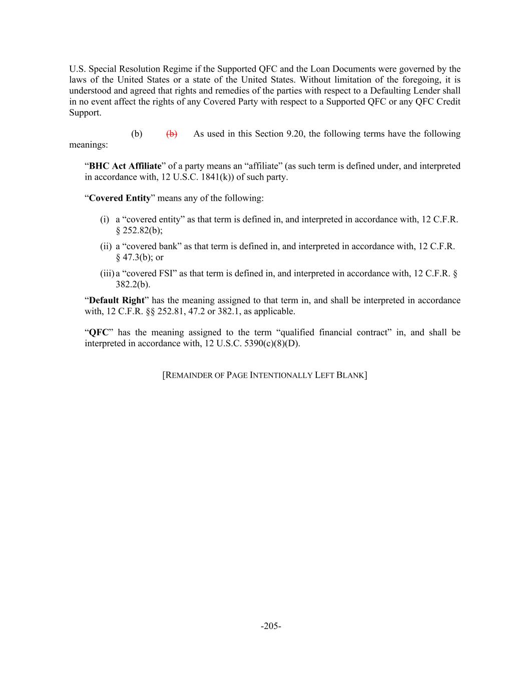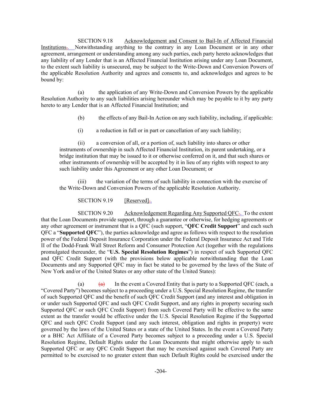 -204- SECTION 9.18 Acknowledgement and Consent to Bail-In of Affected Financial Institutions.. Notwithstanding anything to the contrary in any Loan Document or in any other agreement, arrangement or understanding among any such parties, each party hereto acknowledges that any liability of any Lender that is an Affected Financial Institution arising under any Loan Document, to the extent such liability is unsecured, may be subject to the Write-Down and Conversion Powers of the applicable Resolution Authority and agrees and consents to, and acknowledges and agrees to be bound by: (a) the application of any Write-Down and Conversion Powers by the applicable Resolution Authority to any such liabilities arising hereunder which may be payable to it by any party hereto to any Lender that is an Affected Financial Institution; and (b) the effects of any Bail-In Action on any such liability, including, if applicable: (i) a reduction in full or in part or cancellation of any such liability; (ii) a conversion of all, or a portion of, such liability into shares or other instruments of ownership in such Affected Financial Institution, its parent undertaking, or a bridge institution that may be issued to it or otherwise conferred on it, and that such shares or other instruments of ownership will be accepted by it in lieu of any rights with respect to any such liability under this Agreement or any other Loan Document; or (iii) the variation of the terms of such liability in connection with the exercise of the Write-Down and Conversion Powers of the applicable Resolution Authority. SECTION 9.19 [Reserved].. SECTION 9.20 Acknowledgement Regarding Any Supported QFC.. To the extent that the Loan Documents provide support, through a guarantee or otherwise, for hedging agreements or any other agreement or instrument that is a QFC (such support, “QFC Credit Support” and each such QFC a “Supported QFC”), the parties acknowledge and agree as follows with respect to the resolution power of the Federal Deposit Insurance Corporation under the Federal Deposit Insurance Act and Title II of the Dodd-Frank Wall Street Reform and Consumer Protection Act (together with the regulations promulgated thereunder, the “U.S. Special Resolution Regimes”) in respect of such Supported QFC and QFC Credit Support (with the provisions below applicable notwithstanding that the Loan Documents and any Supported QFC may in fact be stated to be governed by the laws of the State of New York and/or of the United States or any other state of the United States): (a) (a) In the event a Covered Entity that is party to a Supported QFC (each, a “Covered Party”) becomes subject to a proceeding under a U.S. Special Resolution Regime, the transfer of such Supported QFC and the benefit of such QFC Credit Support (and any interest and obligation in or under such Supported QFC and such QFC Credit Support, and any rights in property securing such Supported QFC or such QFC Credit Support) from such Covered Party will be effective to the same extent as the transfer would be effective under the U.S. Special Resolution Regime if the Supported QFC and such QFC Credit Support (and any such interest, obligation and rights in property) were governed by the laws of the United States or a state of the United States. In the event a Covered Party or a BHC Act Affiliate of a Covered Party becomes subject to a proceeding under a U.S. Special Resolution Regime, Default Rights under the Loan Documents that might otherwise apply to such Supported QFC or any QFC Credit Support that may be exercised against such Covered Party are permitted to be exercised to no greater extent than such Default Rights could be exercised under the