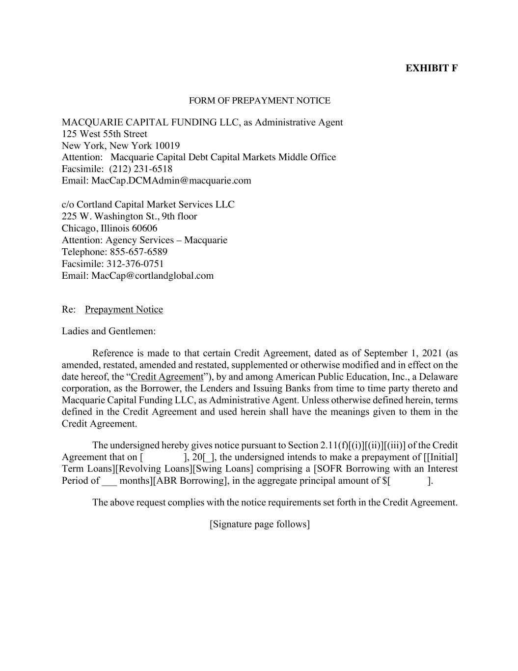 EXHIBIT F FORM OF PREPAYMENT NOTICE MACQUARIE CAPITAL FUNDING LLC, as Administrative Agent 125 West 55th Street New York, New York 10019 Attention: Macquarie Capital Debt Capital Markets Middle Office Facsimile: (212) 231-6518 Email: MacCap.DCMAdmin@macquarie.com c/o Cortland Capital Market Services LLC 225 W. Washington St., 9th floor Chicago, Illinois 60606 Attention: Agency Services – Macquarie Telephone: 855-657-6589 Facsimile: 312-376-0751 Email: MacCap@cortlandglobal.com Re: Prepayment Notice Ladies and Gentlemen: Reference is made to that certain Credit Agreement, dated as of September 1, 2021 (as amended, restated, amended and restated, supplemented or otherwise modified and in effect on the date hereof, the “Credit Agreement”), by and among American Public Education, Inc., a Delaware corporation, as the Borrower, the Lenders and Issuing Banks from time to time party thereto and Macquarie Capital Funding LLC, as Administrative Agent. Unless otherwise defined herein, terms defined in the Credit Agreement and used herein shall have the meanings given to them in the Credit Agreement. The undersigned hereby gives notice pursuant to Section 2.11(f)[(i)][(ii)][(iii)] of the Credit Agreement that on [ ], 20[_], the undersigned intends to make a prepayment of [[Initial] Term Loans][Revolving Loans][Swing Loans] comprising a [SOFR Borrowing with an Interest Period of ___ months][ABR Borrowing], in the aggregate principal amount of $[ ]. The above request complies with the notice requirements set forth in the Credit Agreement. [Signature page follows]