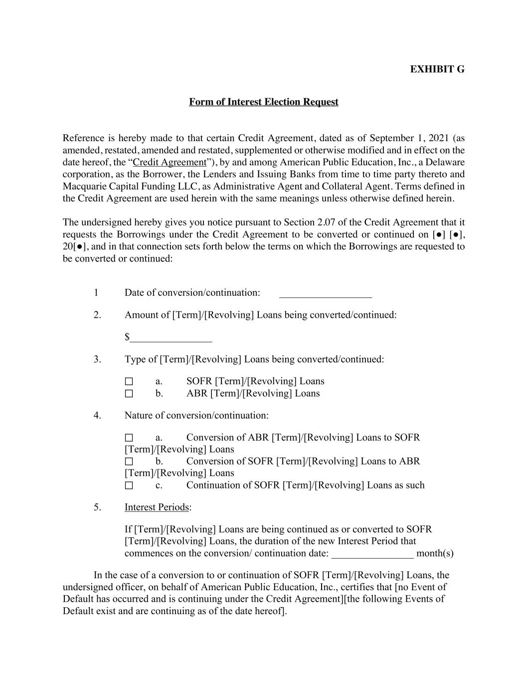 EXHIBIT G Form of Interest Election Request Reference is hereby made to that certain Credit Agreement, dated as of September 1, 2021 (as amended, restated, amended and restated, supplemented or otherwise modified and in effect on the date hereof, the “Credit Agreement”), by and among American Public Education, Inc., a Delaware corporation, as the Borrower, the Lenders and Issuing Banks from time to time party thereto and Macquarie Capital Funding LLC, as Administrative Agent and Collateral Agent. Terms defined in the Credit Agreement are used herein with the same meanings unless otherwise defined herein. The undersigned hereby gives you notice pursuant to Section 2.07 of the Credit Agreement that it requests the Borrowings under the Credit Agreement to be converted or continued on [●] [●], 20[●], and in that connection sets forth below the terms on which the Borrowings are requested to be converted or continued: 1 Date of conversion/continuation: __________________ 2. Amount of [Term]/[Revolving] Loans being converted/continued: $________________ 3. Type of [Term]/[Revolving] Loans being converted/continued: a. SOFR [Term]/[Revolving] Loans b. ABR [Term]/[Revolving] Loans 4. Nature of conversion/continuation: a. Conversion of ABR [Term]/[Revolving] Loans to SOFR [Term]/[Revolving] Loans b. Conversion of SOFR [Term]/[Revolving] Loans to ABR [Term]/[Revolving] Loans c. Continuation of SOFR [Term]/[Revolving] Loans as such 5. Interest Periods: If [Term]/[Revolving] Loans are being continued as or converted to SOFR [Term]/[Revolving] Loans, the duration of the new Interest Period that commences on the conversion/ continuation date: ________________ month(s) In the case of a conversion to or continuation of SOFR [Term]/[Revolving] Loans, the undersigned officer, on behalf of American Public Education, Inc., certifies that [no Event of Default has occurred and is continuing under the Credit Agreement][the following Events of Default exist and are continuing as of the date hereof].