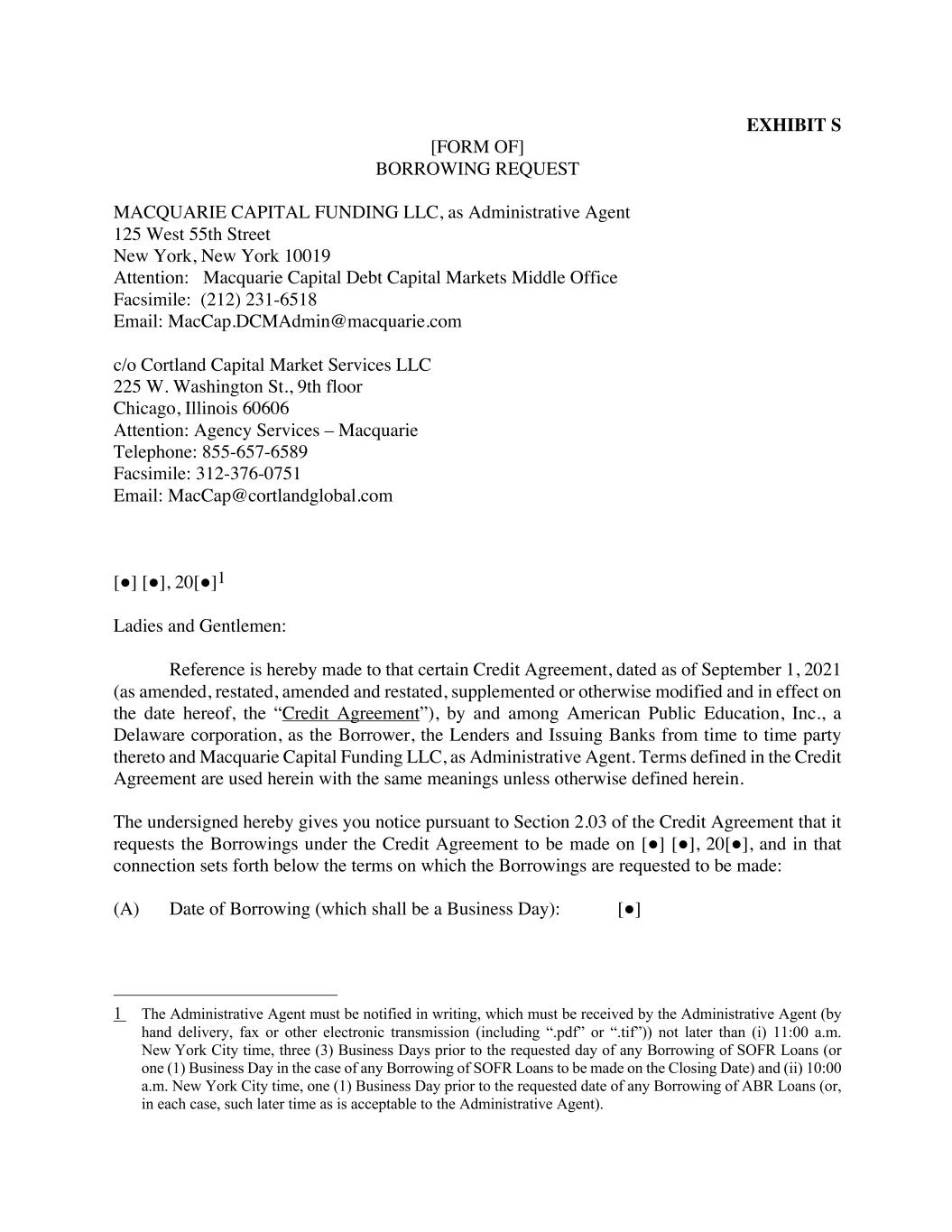 EXHIBIT S [FORM OF] BORROWING REQUEST MACQUARIE CAPITAL FUNDING LLC, as Administrative Agent 125 West 55th Street New York, New York 10019 Attention: Macquarie Capital Debt Capital Markets Middle Office Facsimile: (212) 231-6518 Email: MacCap.DCMAdmin@macquarie.com c/o Cortland Capital Market Services LLC 225 W. Washington St., 9th floor Chicago, Illinois 60606 Attention: Agency Services – Macquarie Telephone: 855-657-6589 Facsimile: 312-376-0751 Email: MacCap@cortlandglobal.com [●] [●], 20[●]1 Ladies and Gentlemen: Reference is hereby made to that certain Credit Agreement, dated as of September 1, 2021 (as amended, restated, amended and restated, supplemented or otherwise modified and in effect on the date hereof, the “Credit Agreement”), by and among American Public Education, Inc., a Delaware corporation, as the Borrower, the Lenders and Issuing Banks from time to time party thereto and Macquarie Capital Funding LLC, as Administrative Agent. Terms defined in the Credit Agreement are used herein with the same meanings unless otherwise defined herein. The undersigned hereby gives you notice pursuant to Section 2.03 of the Credit Agreement that it requests the Borrowings under the Credit Agreement to be made on [●] [●], 20[●], and in that connection sets forth below the terms on which the Borrowings are requested to be made: (A) Date of Borrowing (which shall be a Business Day): [●] 1 The Administrative Agent must be notified in writing, which must be received by the Administrative Agent (by hand delivery, fax or other electronic transmission (including “.pdf” or “.tif”)) not later than (i) 11:00 a.m. New York City time, three (3) Business Days prior to the requested day of any Borrowing of SOFR Loans (or one (1) Business Day in the case of any Borrowing of SOFR Loans to be made on the Closing Date) and (ii) 10:00 a.m. New York City time, one (1) Business Day prior to the requested date of any Borrowing of ABR Loans (or, in each case, such later time as is acceptable to the Administrative Agent).