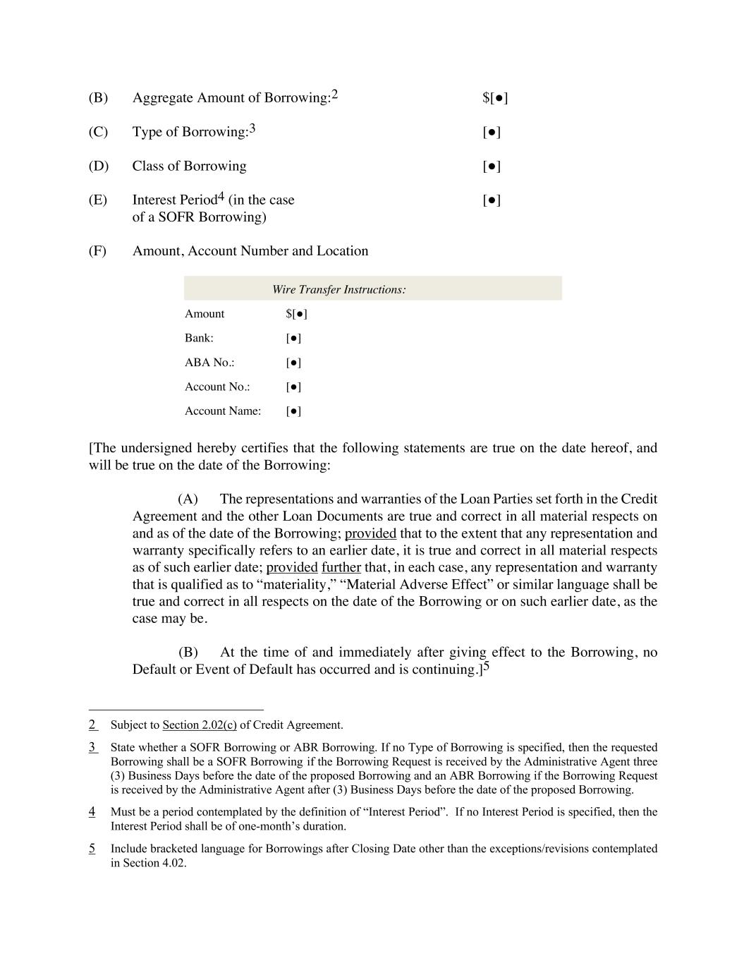 (B) Aggregate Amount of Borrowing:2 $[●] (C) Type of Borrowing:3 [●] (D) Class of Borrowing [●] (E) Interest Period4 (in the case [●] of a SOFR Borrowing) (F) Amount, Account Number and Location Wire Transfer Instructions: Amount $[●] Bank: [●] ABA No.: [●] Account No.: [●] Account Name: [●] [The undersigned hereby certifies that the following statements are true on the date hereof, and will be true on the date of the Borrowing: (A) The representations and warranties of the Loan Parties set forth in the Credit Agreement and the other Loan Documents are true and correct in all material respects on and as of the date of the Borrowing; provided that to the extent that any representation and warranty specifically refers to an earlier date, it is true and correct in all material respects as of such earlier date; provided further that, in each case, any representation and warranty that is qualified as to “materiality,” “Material Adverse Effect” or similar language shall be true and correct in all respects on the date of the Borrowing or on such earlier date, as the case may be. (B) At the time of and immediately after giving effect to the Borrowing, no Default or Event of Default has occurred and is continuing.]5 2 Subject to Section 2.02(c) of Credit Agreement. 3 State whether a SOFR Borrowing or ABR Borrowing. If no Type of Borrowing is specified, then the requested Borrowing shall be a SOFR Borrowing if the Borrowing Request is received by the Administrative Agent three (3) Business Days before the date of the proposed Borrowing and an ABR Borrowing if the Borrowing Request is received by the Administrative Agent after (3) Business Days before the date of the proposed Borrowing. 4 Must be a period contemplated by the definition of “Interest Period”. If no Interest Period is specified, then the Interest Period shall be of one-month’s duration. 5 Include bracketed language for Borrowings after Closing Date other than the exceptions/revisions contemplated in Section 4.02.