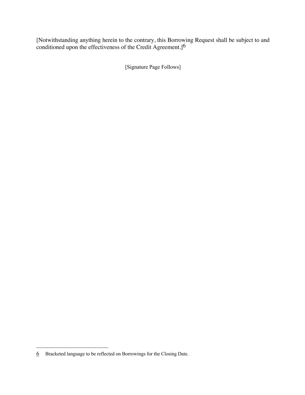 [Notwithstanding anything herein to the contrary, this Borrowing Request shall be subject to and conditioned upon the effectiveness of the Credit Agreement.]6 [Signature Page Follows] 6 Bracketed language to be reflected on Borrowings for the Closing Date.