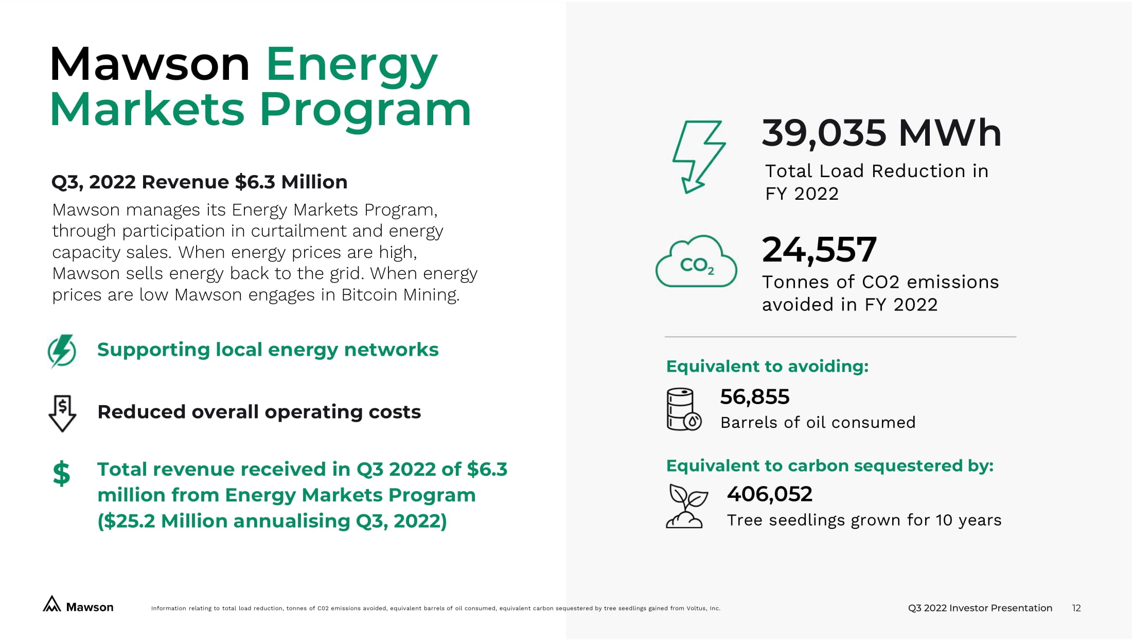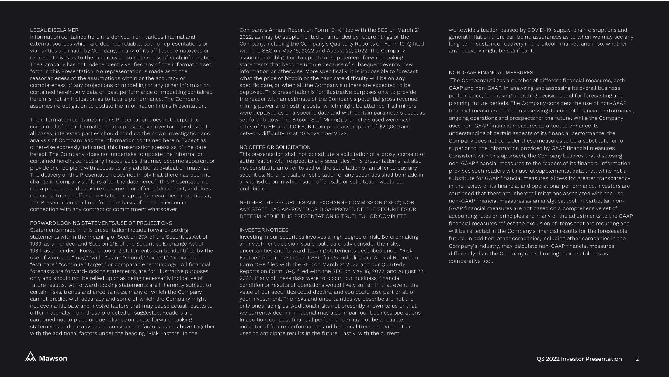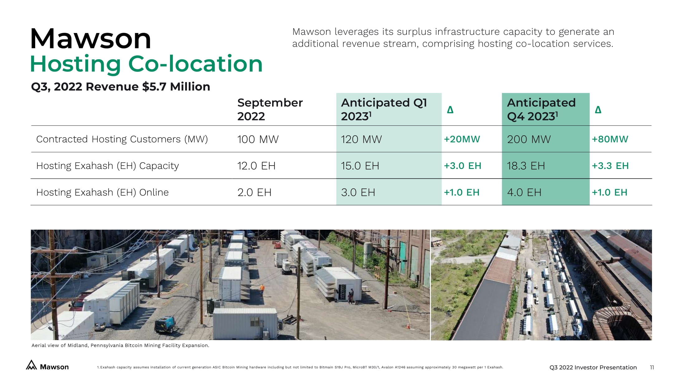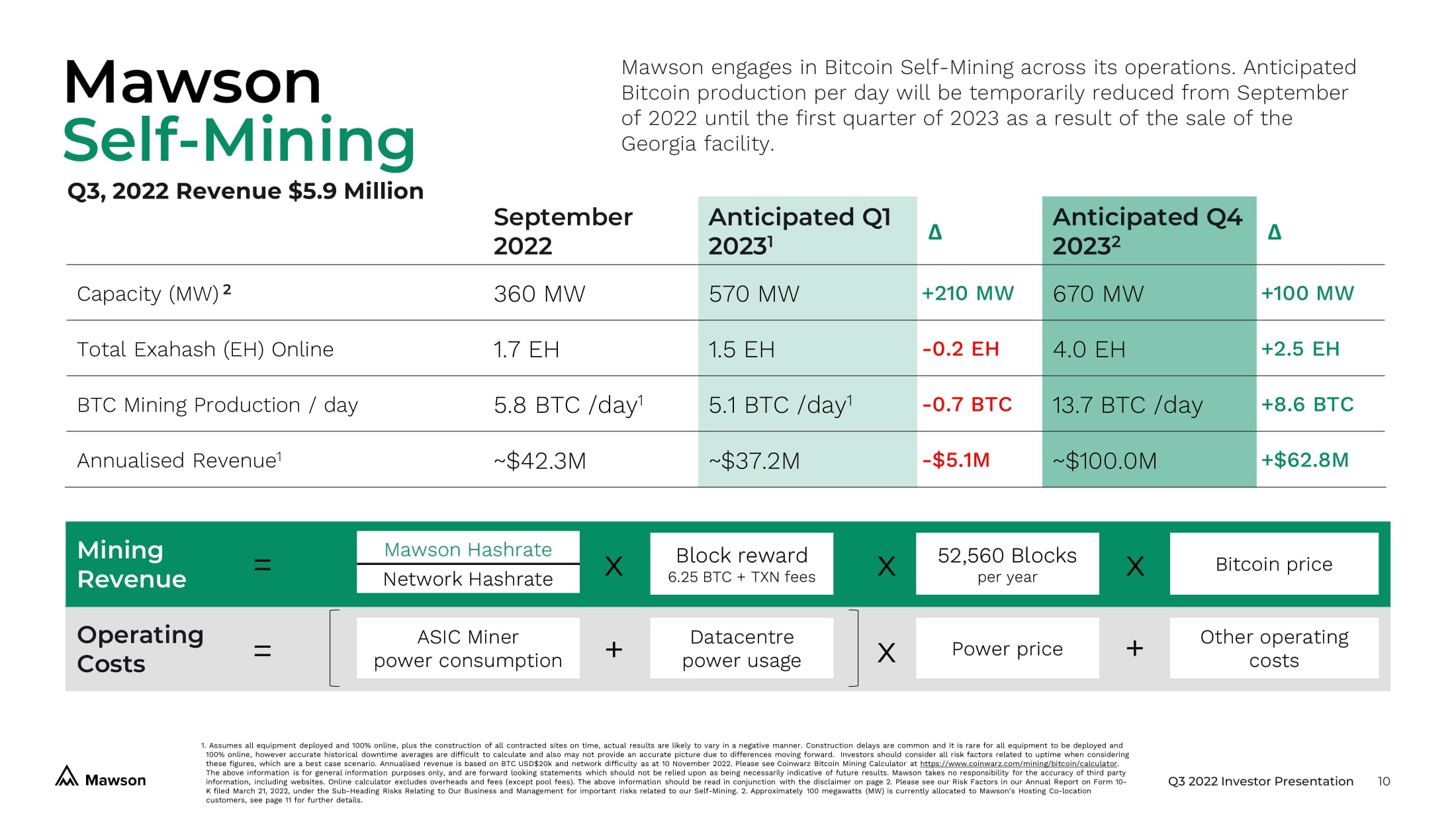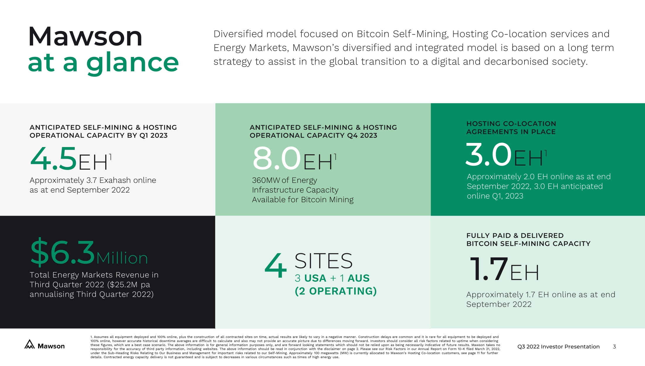 Q3 2022 Investor Presentation 10 1. Assumes all equipment deployed and 100% online, plus the construction of all contracted sites on time, actual results are lik ely to vary in a negative manner. Construction delays are common and it is rare for all equipment to be deployed and 100% online, however accurate historical downtime averages are difficult to calculate and also may not provide an accurate pi ctu re due to differences moving forward. Investors should consider all risk factors related to uptime when considering these figures, which are a best case scenario. Annualised revenue is based on BTC USD$20k and network difficulty as at 10 November 2022. Please see Coinwarz Bitcoin Mining Calculator at https://www.coinwarz.com/mining/bitcoin/calculator . The above information is for general information purposes only, and are forward looking statements which should not be relied up on as being necessarily indicative of future results. Mawson takes no responsibility for the accuracy of third party information, including websites. Online calculator excludes overheads and fees (except pool fees). The above information shou ld be read in conjunction with the disclaimer on page 2. Please see our Risk Factors in our Annual Report on Form 10 - K filed March 21, 2022, under the Sub - Heading Risks Relating to Our Business and Management for important risks related to our S elf - Mining. 2. Approximately 100 megawatts (MW) is currently allocated to Mawson’s Hosting Co - location customers, see page 11 for further details. Mawson Self - Mining September 2022 Anticipated Q1 2023 1 Δ Anticipated Q4 2023 2 Δ Capacity (MW) 2 360 MW 570 MW +210 MW 670 MW +100 MW Total Exahash (EH) Online 1.7 E H 1.5 EH - 0.2 EH 4.0 EH +2.5 EH BTC Mining Production / day 5.8 BTC /day 1 5.1 BTC /day 1 - 0.7 BTC 13.7 BTC /day +8.6 BTC Annualised Revenue 1 ~$42.3M ~$37.2M - $5.1M ~$100.0M +$62.8M Mining Revenue Operating Costs Mawson Hashrate Network Hashrate ASIC Miner power consumption Block reward 6.25 BTC + TXN fees Datacentre power usage 52,560 Blocks per year Power price Bitcoin price Other operating costs = = x + x x x + Q3, 2022 Revenue $5.9 Million M awson engages in Bitcoin Self - Mining across its operations. Anticipated Bitcoin production per day will be temporarily reduced from September of 2022 until the first quarter of 2023 as a result of the sale of the Georgia facility.