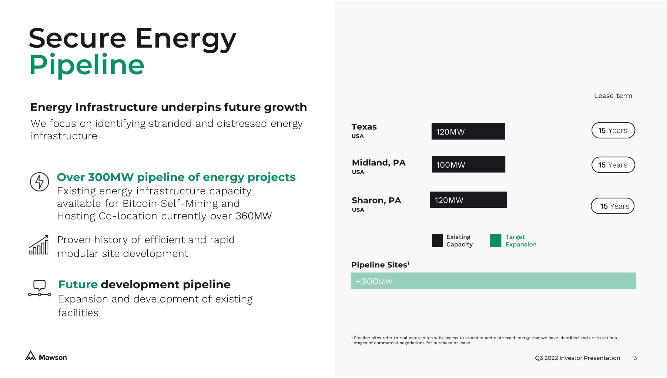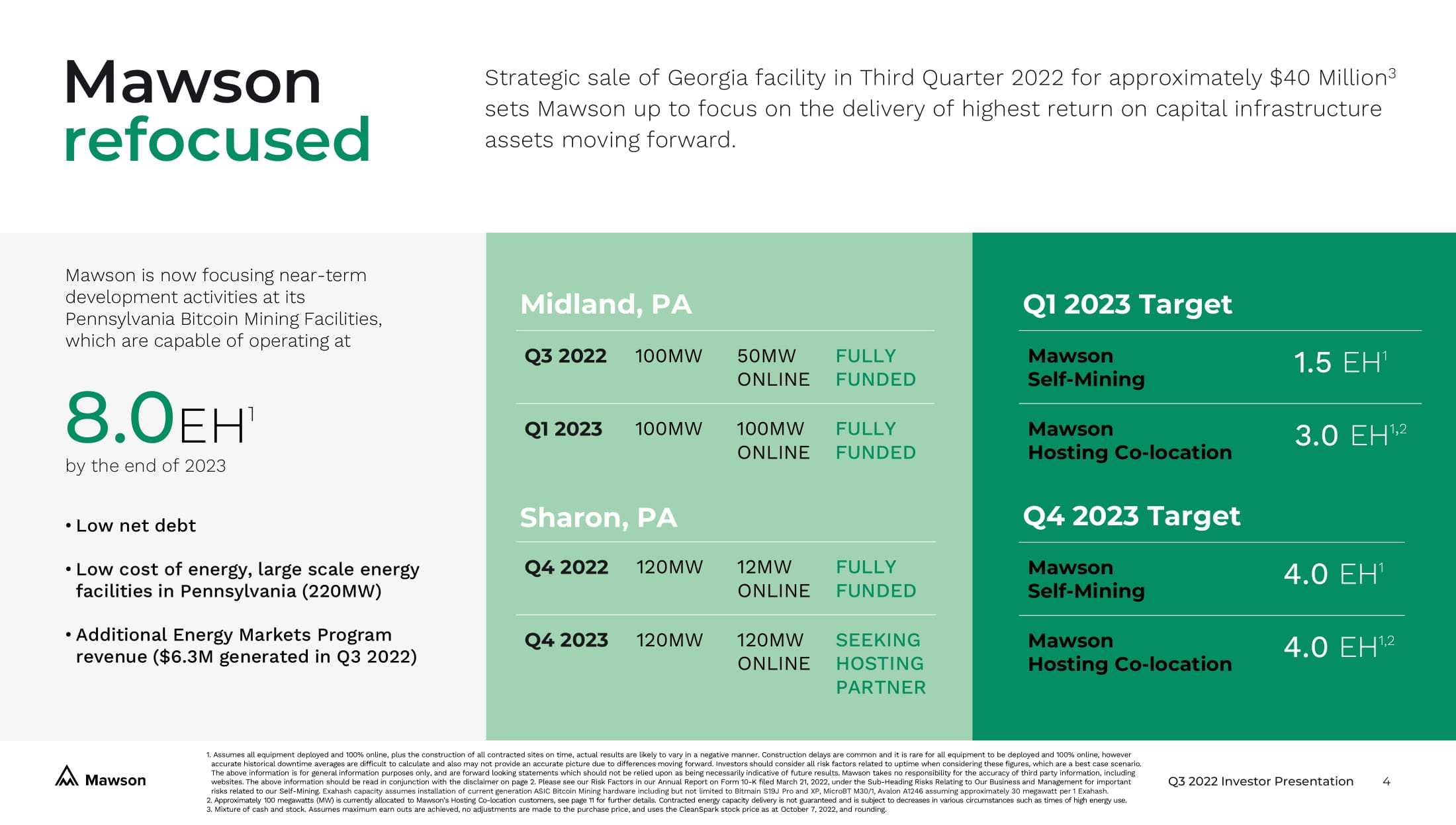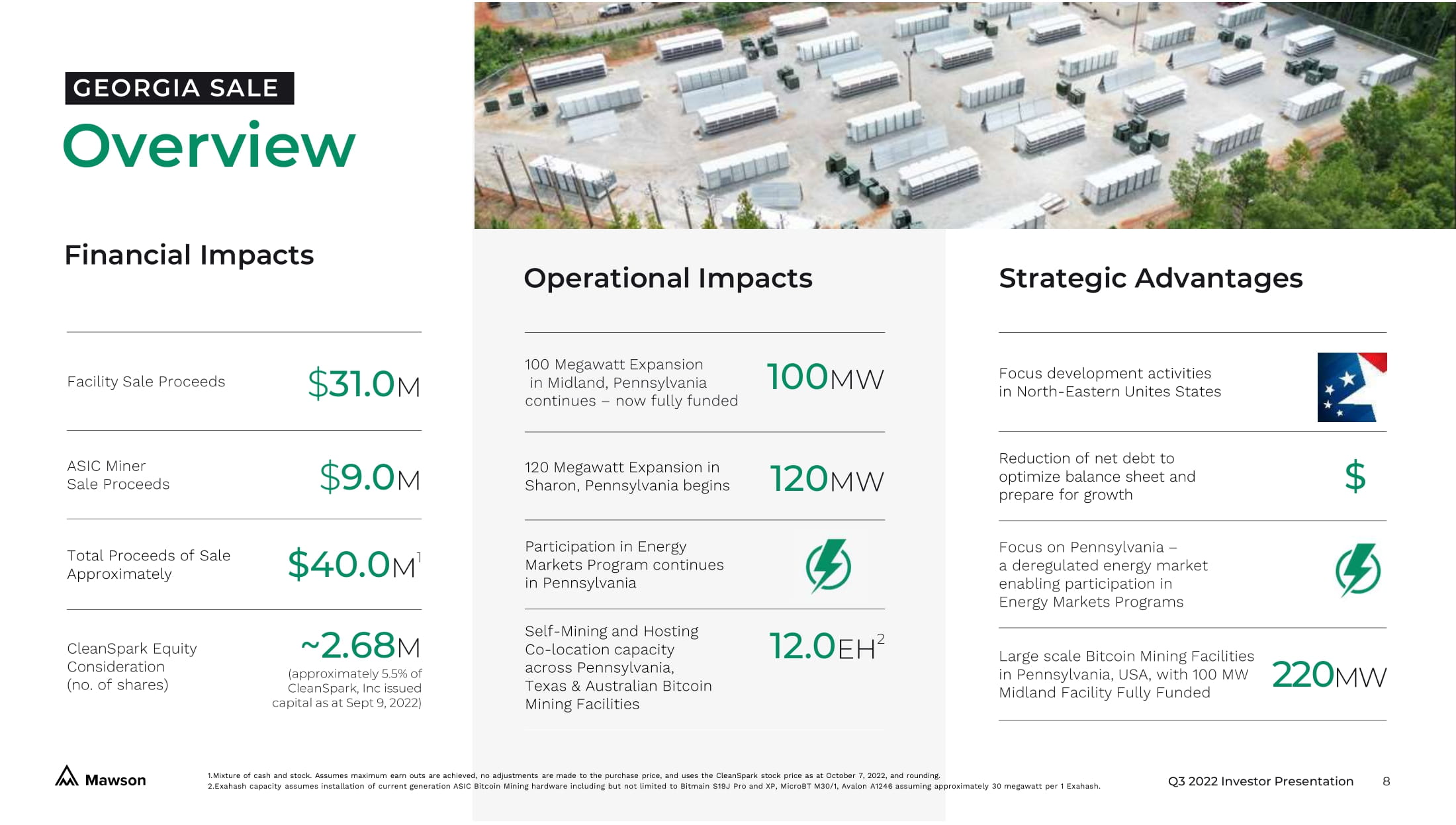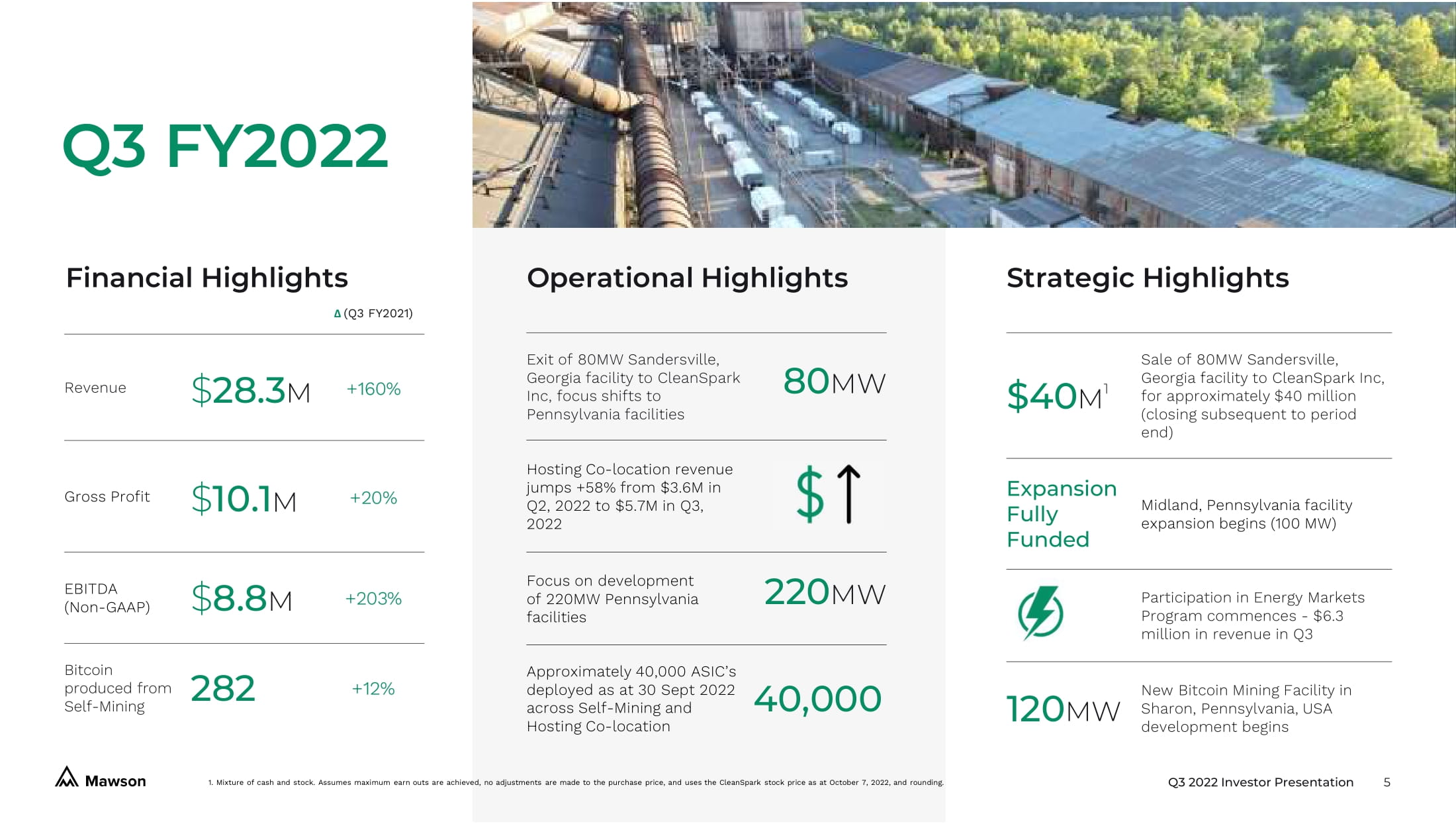 Q3 2022 Investor Presentation 4 Strategic sale of Georgia facility in Third Quarter 2022 for approximately $40 Million 3 sets Mawson up to focus on the delivery of highest return on capital infrastructure assets moving forward. 1. Assumes all equipment deployed and 100% online, plus the construction of all contracted sites on time, actual results are lik ely to vary in a negative manner. Construction delays are common and it is rare for all equipment to be deployed and 100% onl ine , however accurate historical downtime averages are difficult to calculate and also may not provide an accurate picture due to differen ces moving forward. Investors should consider all risk factors related to uptime when considering these figures, which are a best c ase scenario. The above information is for general information purposes only, and are forward looking statements which should not be relied up on as being necessarily indicative of future results. Mawson takes no responsibility for the accuracy of third party informat ion , including websites. The above information should be read in conjunction with the disclaimer on page 2. Please see our Risk Factors in our Annual Report on Form 10 - K filed March 21, 2022, under the Sub - Heading Risks Relating to Our Business and Management for important risks related to our Self - Mining. Exahash capacity assumes installation of current generation ASIC Bitcoin Mining hardware including but not limited to Bitmain S19J Pro and XP, MicroBT M30/1, Avalon A1246 assuming approximately 30 megawatt per 1 Exahash . 2. Approximately 100 megawatts (MW) is currently allocated to Mawson’s Hosting Co - location customers, see page 11 for further detai ls. Contracted energy capacity delivery is not guaranteed and is subject to decreases in various circumstances such as times of h igh energy use. 3. Mixture of cash and stock. Assumes maximum earn outs are achieved, no adjustments are made to the purchase price, and uses the CleanSpark stock price as at October 7, 2022, and rounding. Mawson refocused • Low net debt • Low cost of energy, large scale energy facilities in Pennsylvania (220MW) • Additional Energy Markets Program revenue ($6.3M generated in Q3 2022) Mawson is now focusing near - term development activities at its Pennsylvania Bitcoin Mining Facilities, which are capable of operating at 8.0 EH 1 by the end of 2023 Q3 2022 100MW 50MW ONLINE FULLY FUNDED Q1 2023 100MW 100MW ONLINE FULLY FUNDED Midland, PA Q4 2022 120MW 12MW ONLINE FULLY FUNDED Q4 2023 120MW 120MW ONLINE SEEKING HOSTING PARTNER Sharon, PA Mawson Self - Mining 1.5 EH 1 Mawson Hosting Co - location 3.0 EH 1 , 2 Q1 2023 Target Mawson Self - Mining 4.0 EH 1 Mawson Hosting Co - location 4.0 EH 1,2 Q4 2023 Target